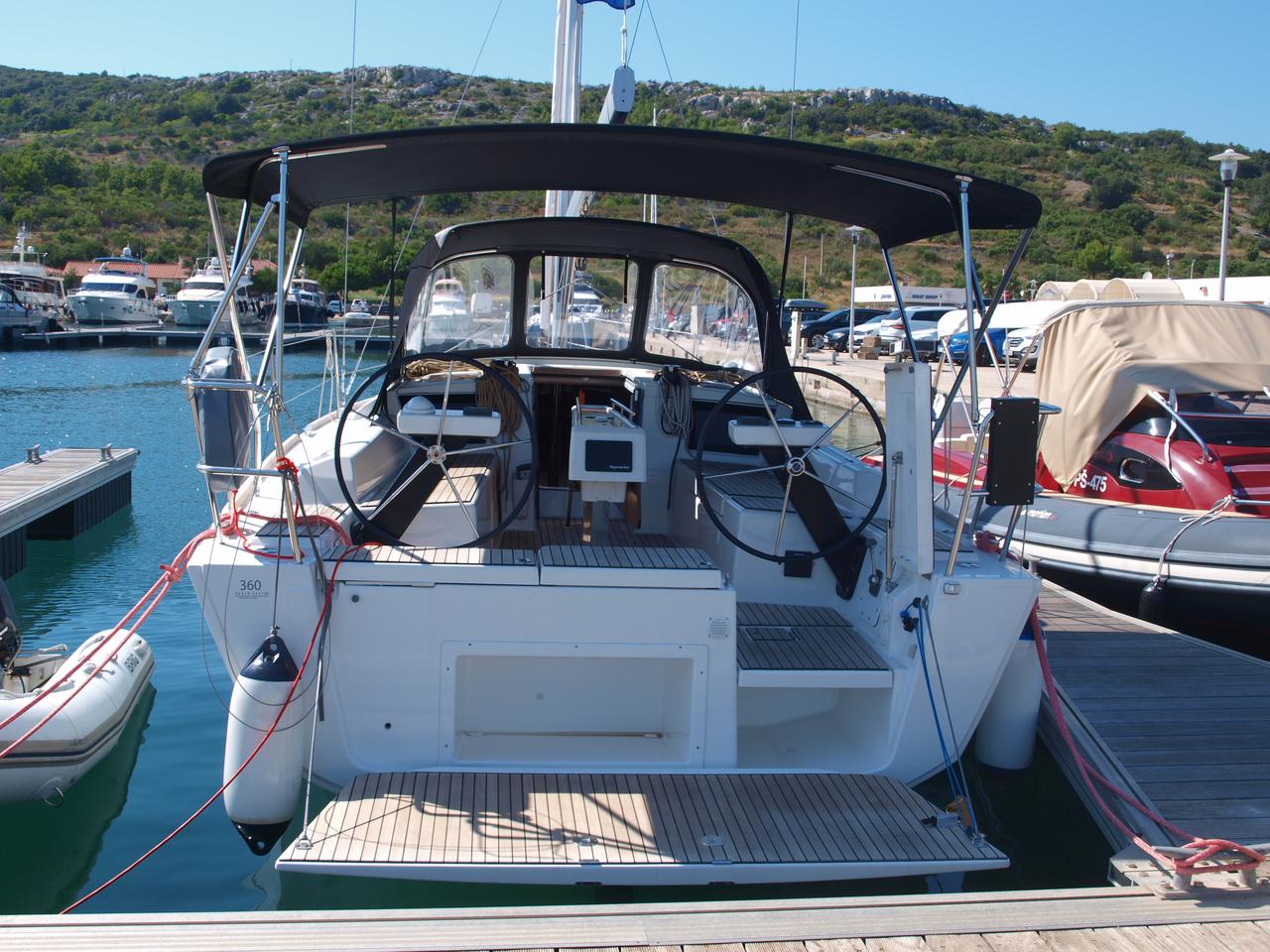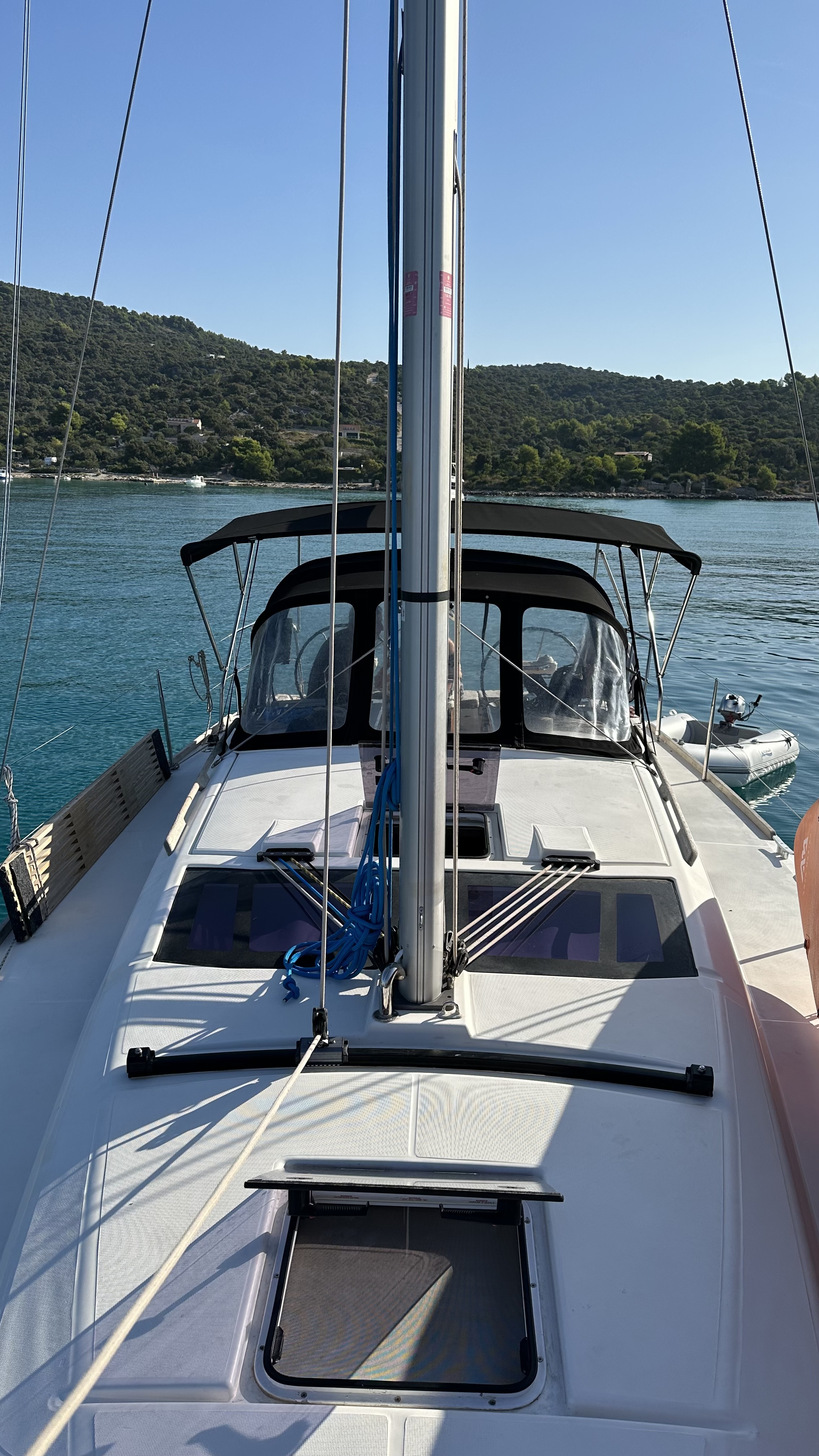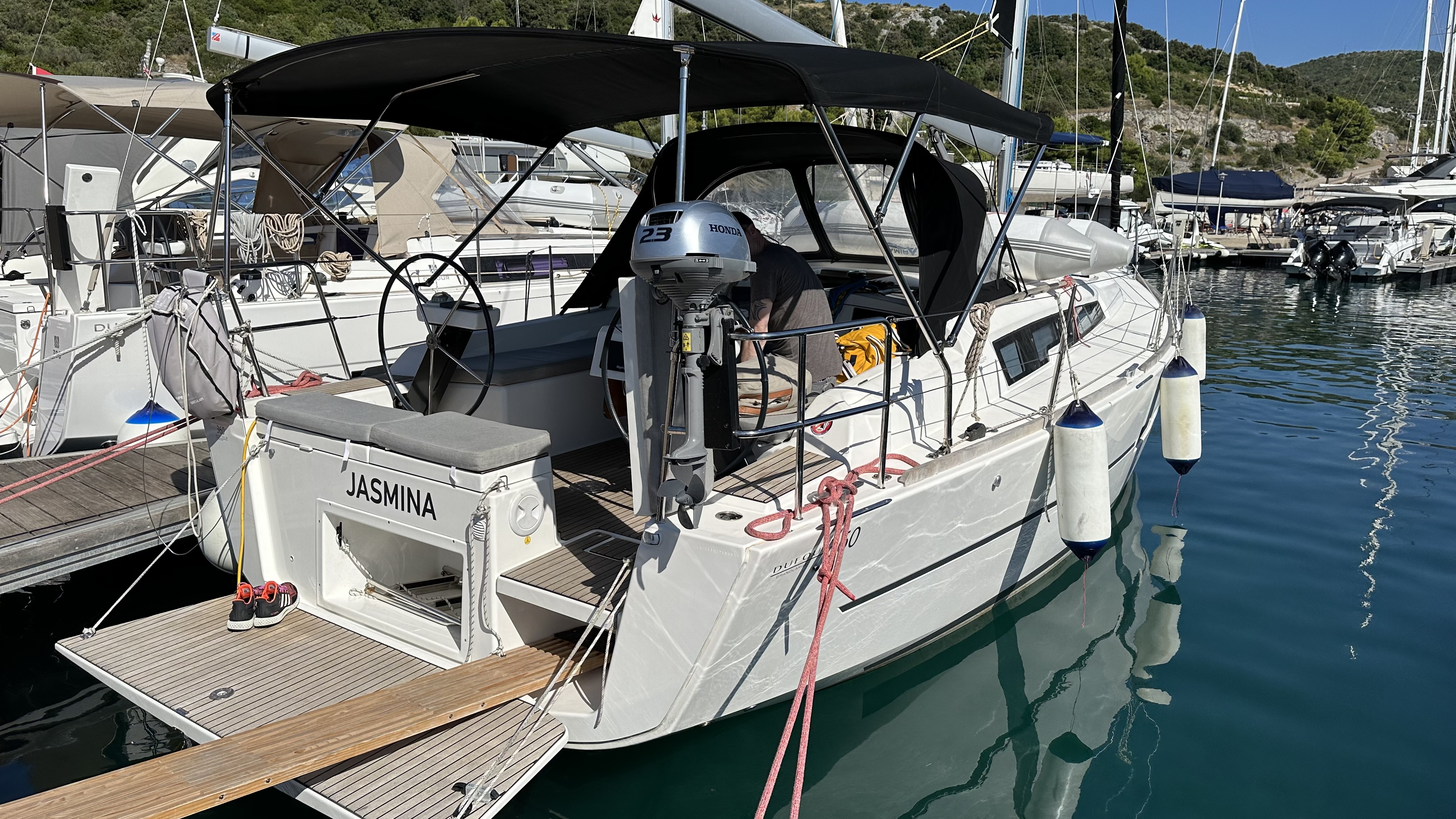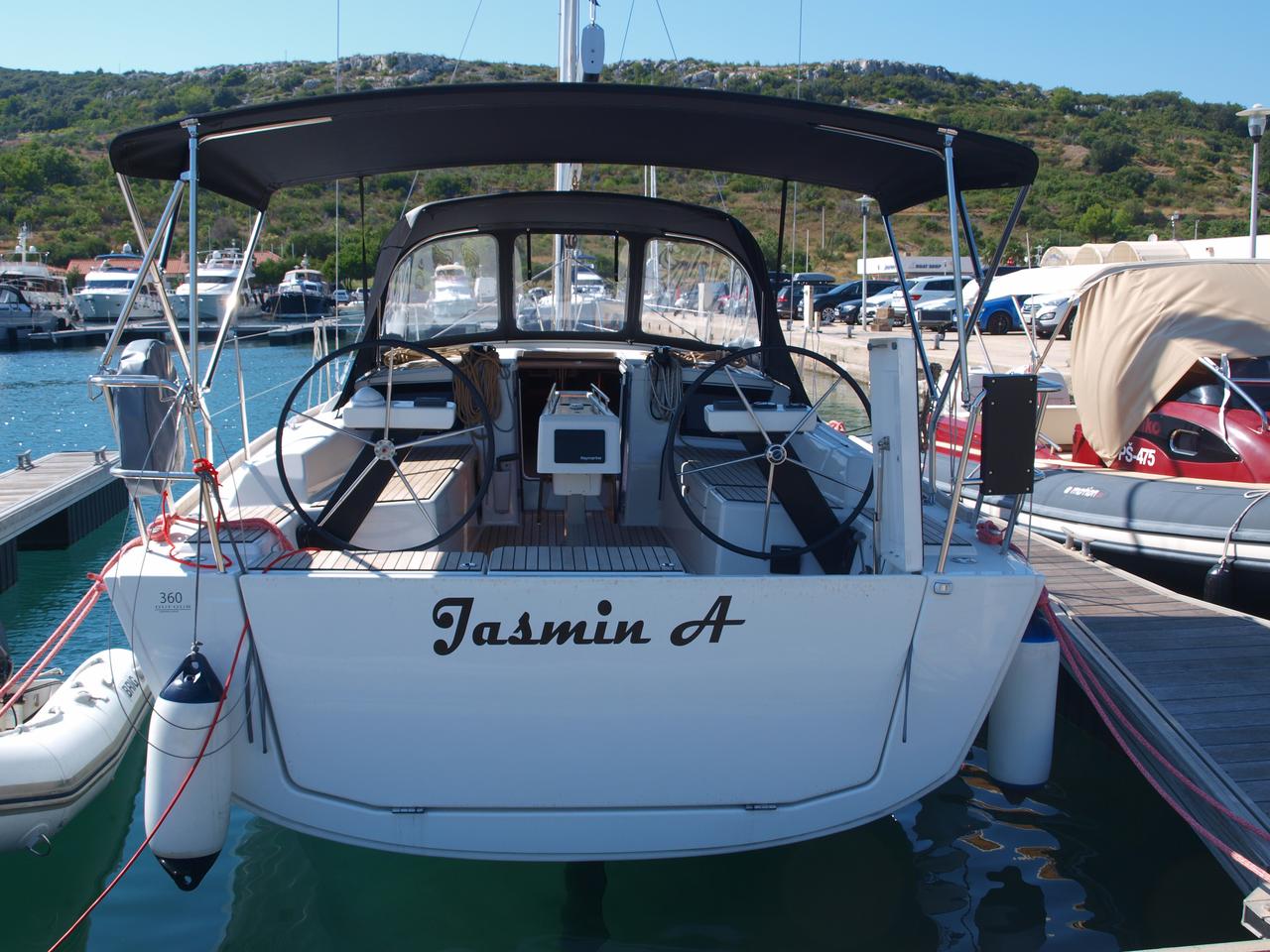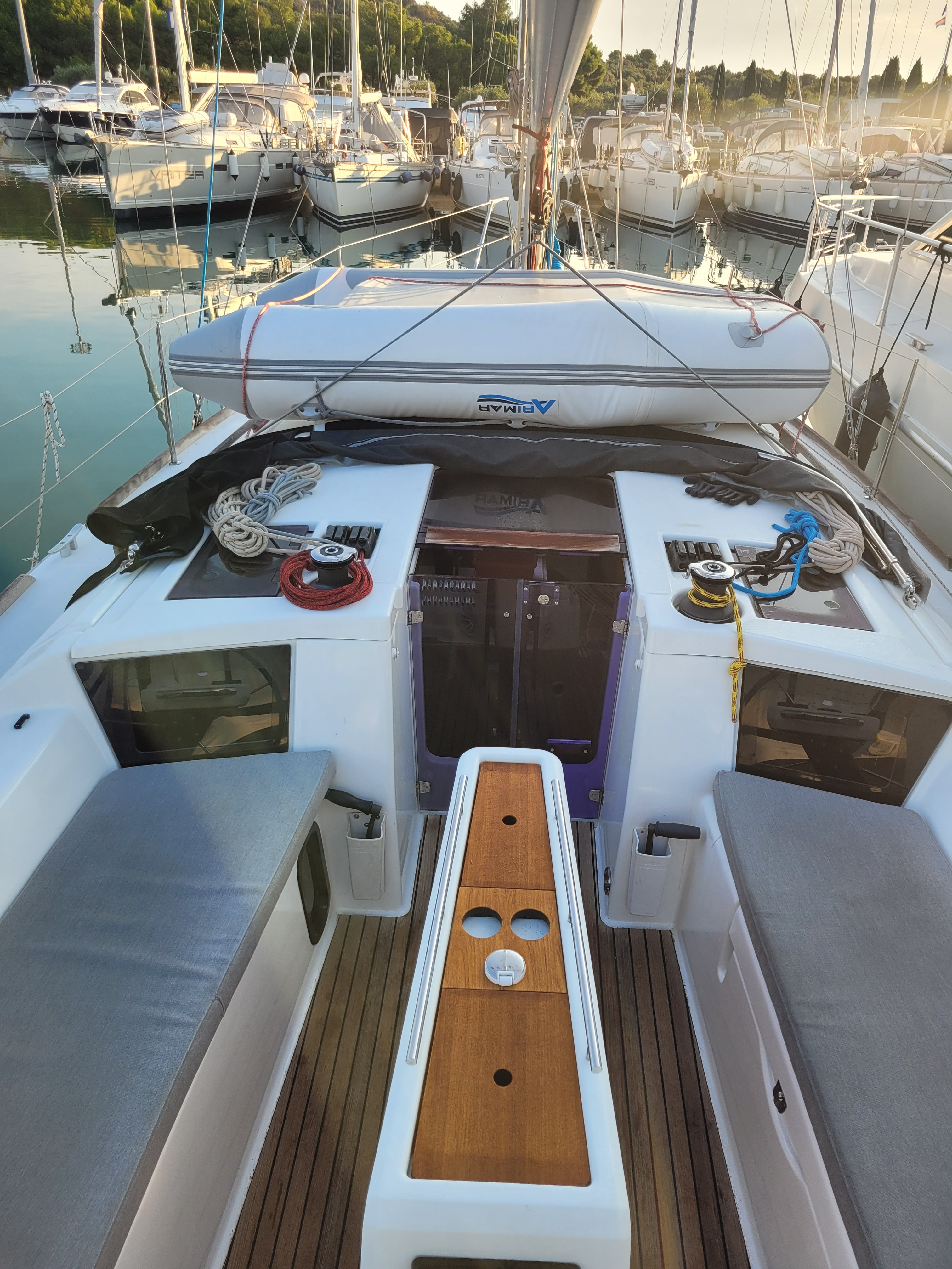 | Outside | 220 V-Landanschluss, Anker mit Kette, Badeplattform, Biminitop, Bootshaken, Cockpitdusche, Cockpitlautsprecher, Cockpitpolster, Cockpittisch, Dieselkanister , elektr. Ankerwinsch, Fender, Festmacherleinen, Gangway, Grill, Kugelfender, Kunststoff-Eimer (Pütz), Sprayhood, Teak im Cockpit, Wasserkanister , Wasserschlauch |