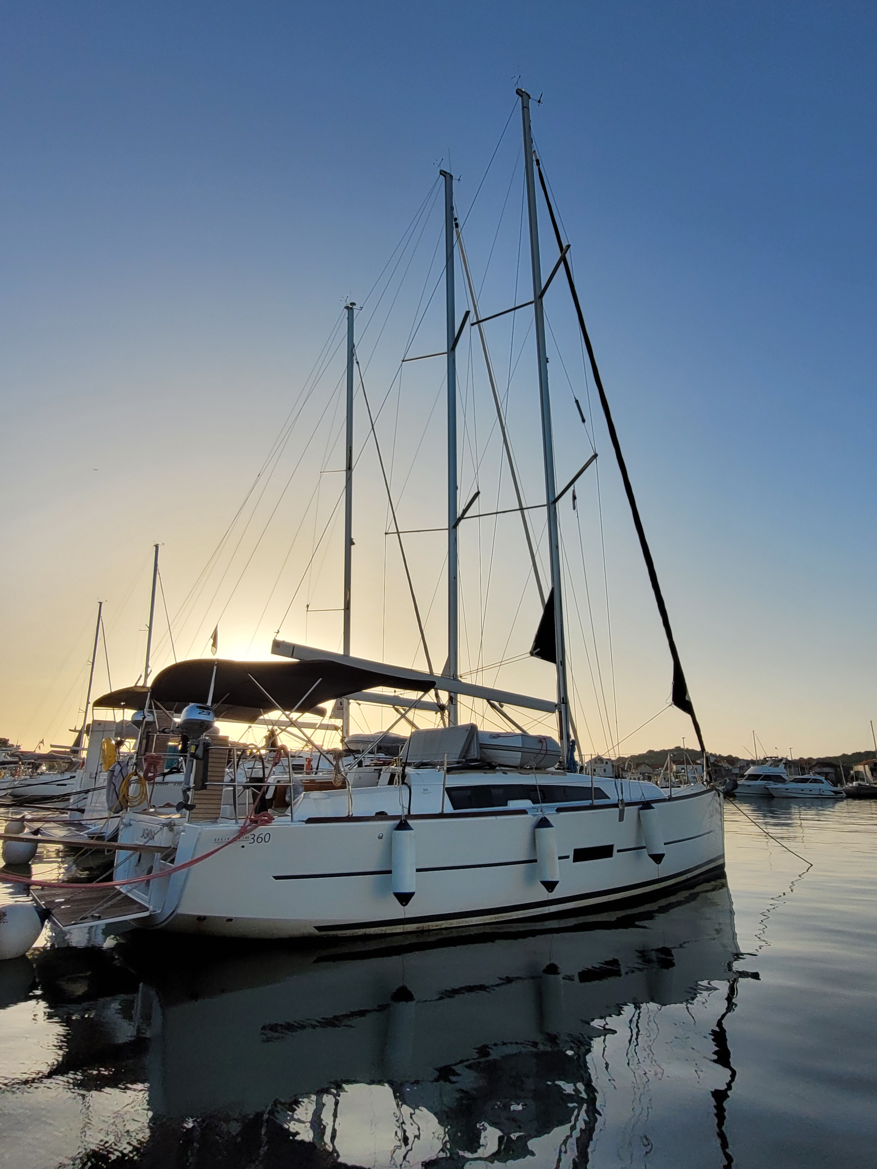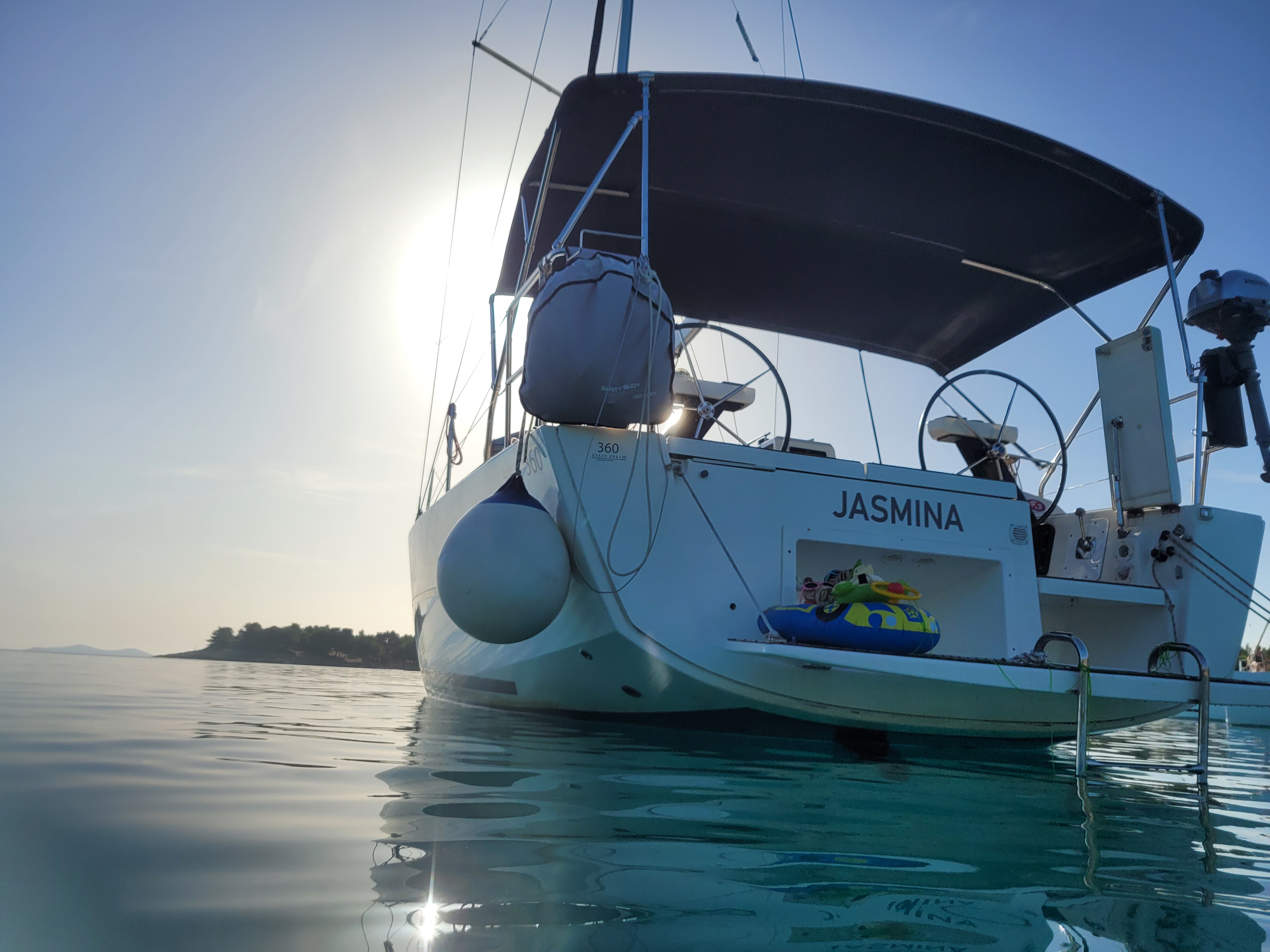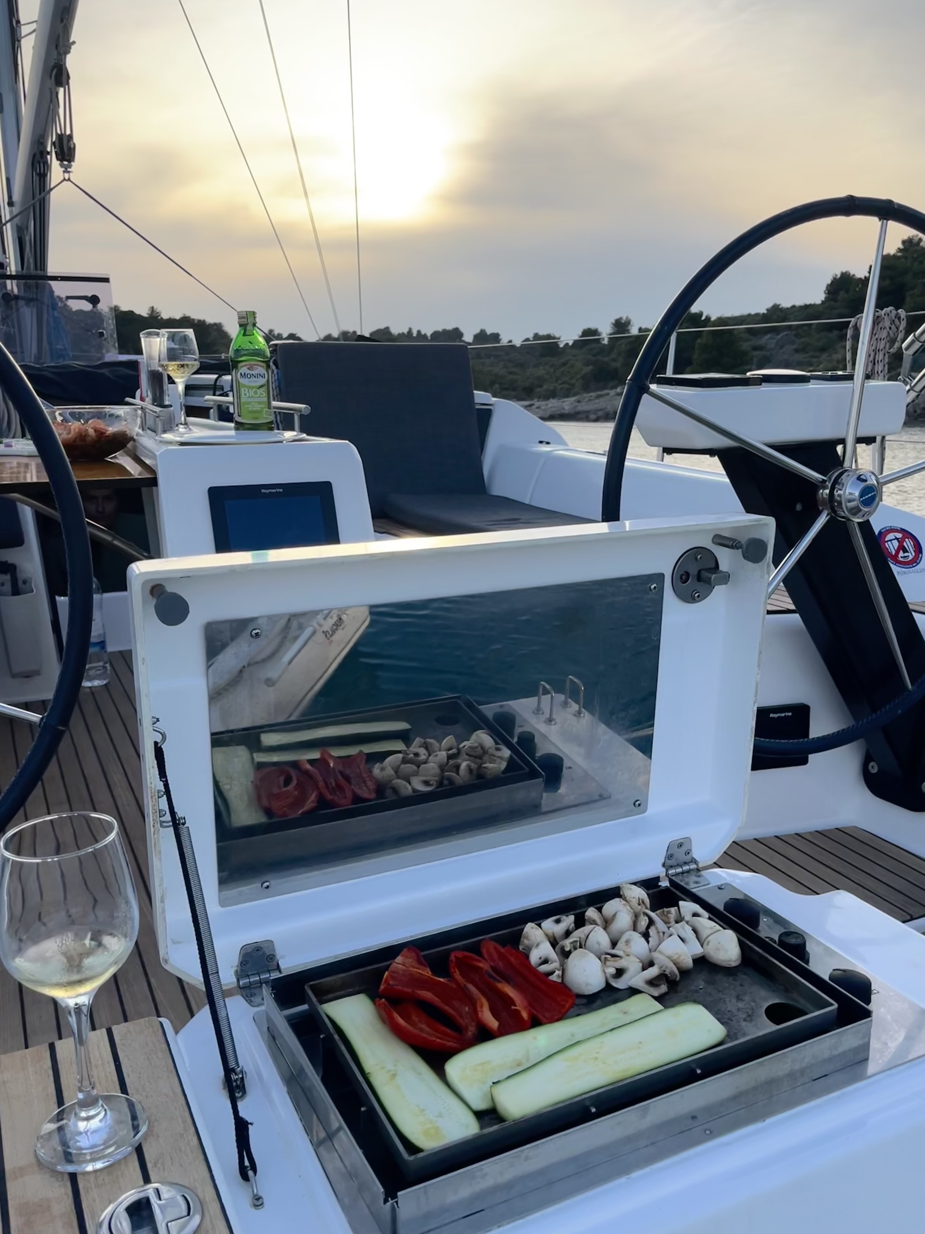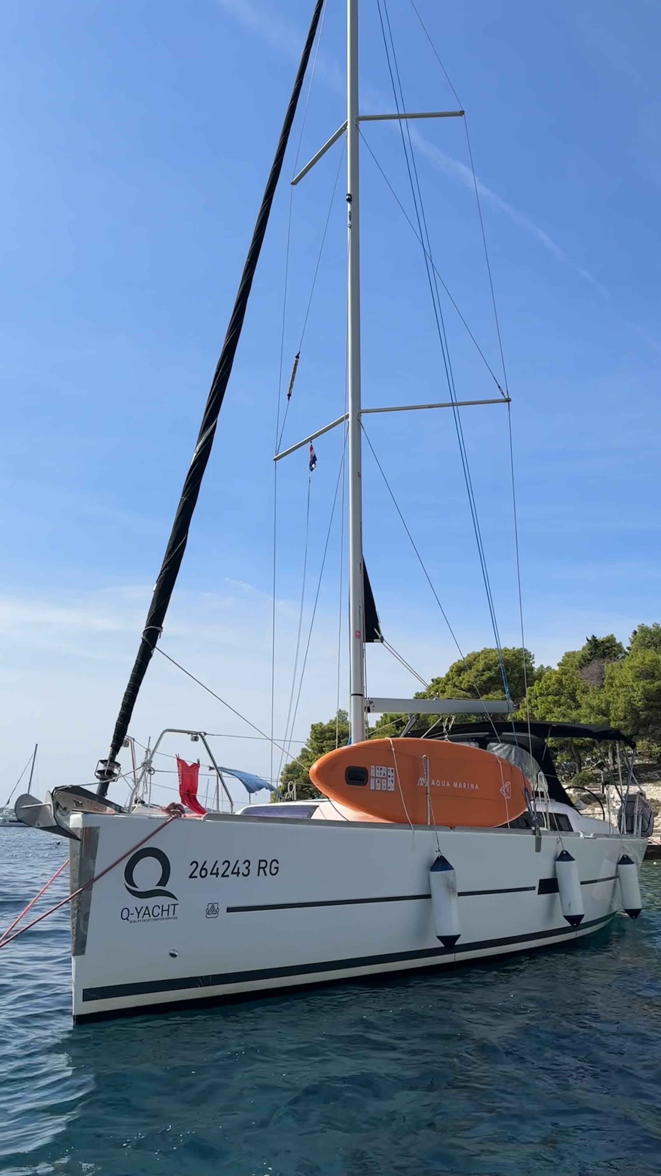 | Outside | 220 V-Landanschluss, Anker mit Kette, Badeplattform, Biminitop, Bootshaken, Cockpitdusche, Cockpitlautsprecher, Cockpitpolster, Cockpittisch, Dieselkanister , elektr. Ankerwinsch, Fender, Festmacherleinen, Gangway, Grill, Kugelfender, Kunststoff-Eimer (Pütz), Sprayhood, Teak im Cockpit, Wasserkanister , Wasserschlauch |
