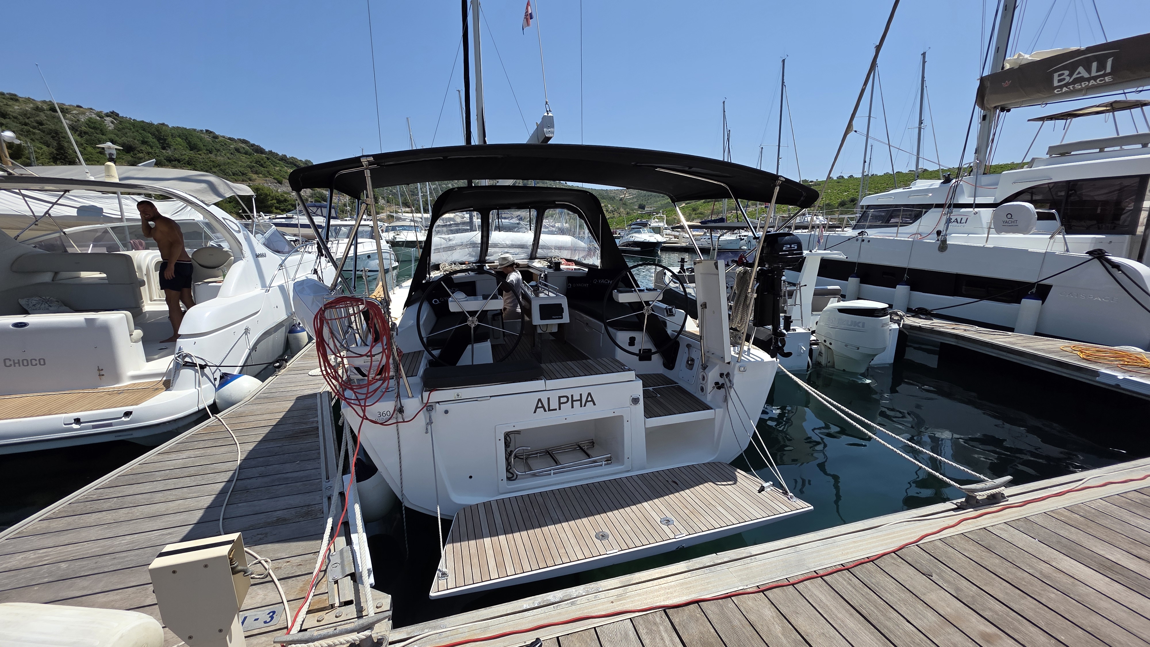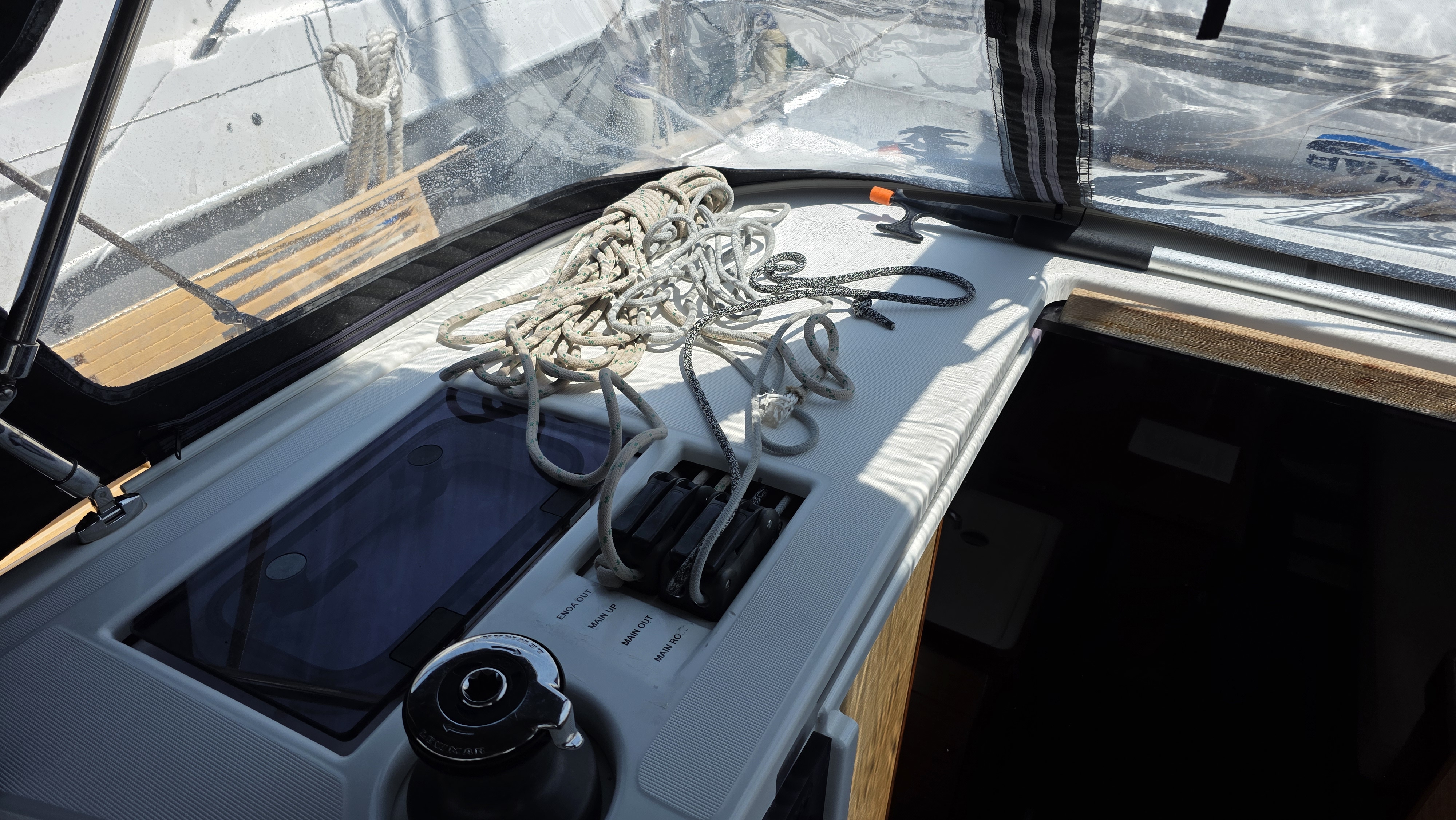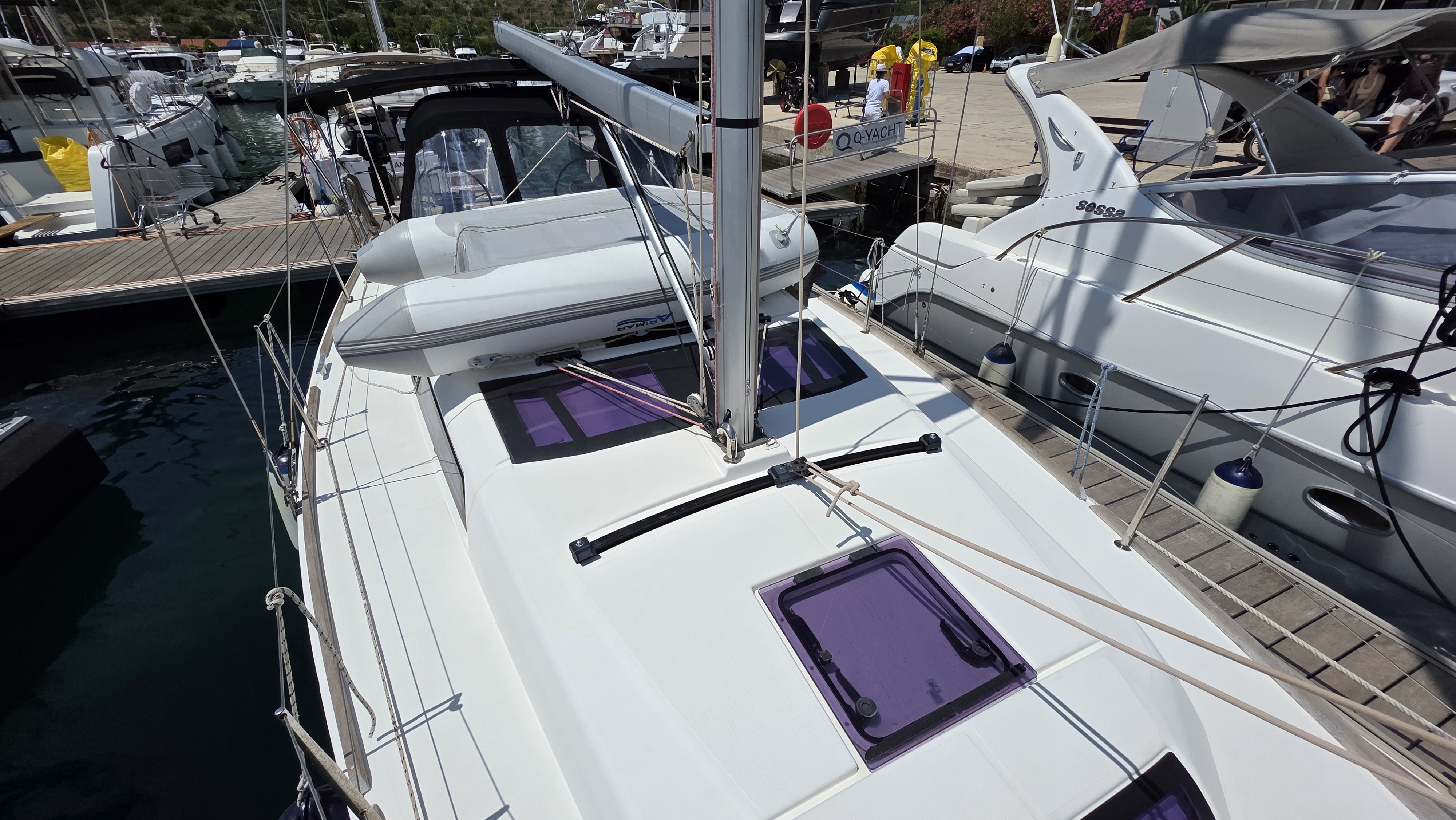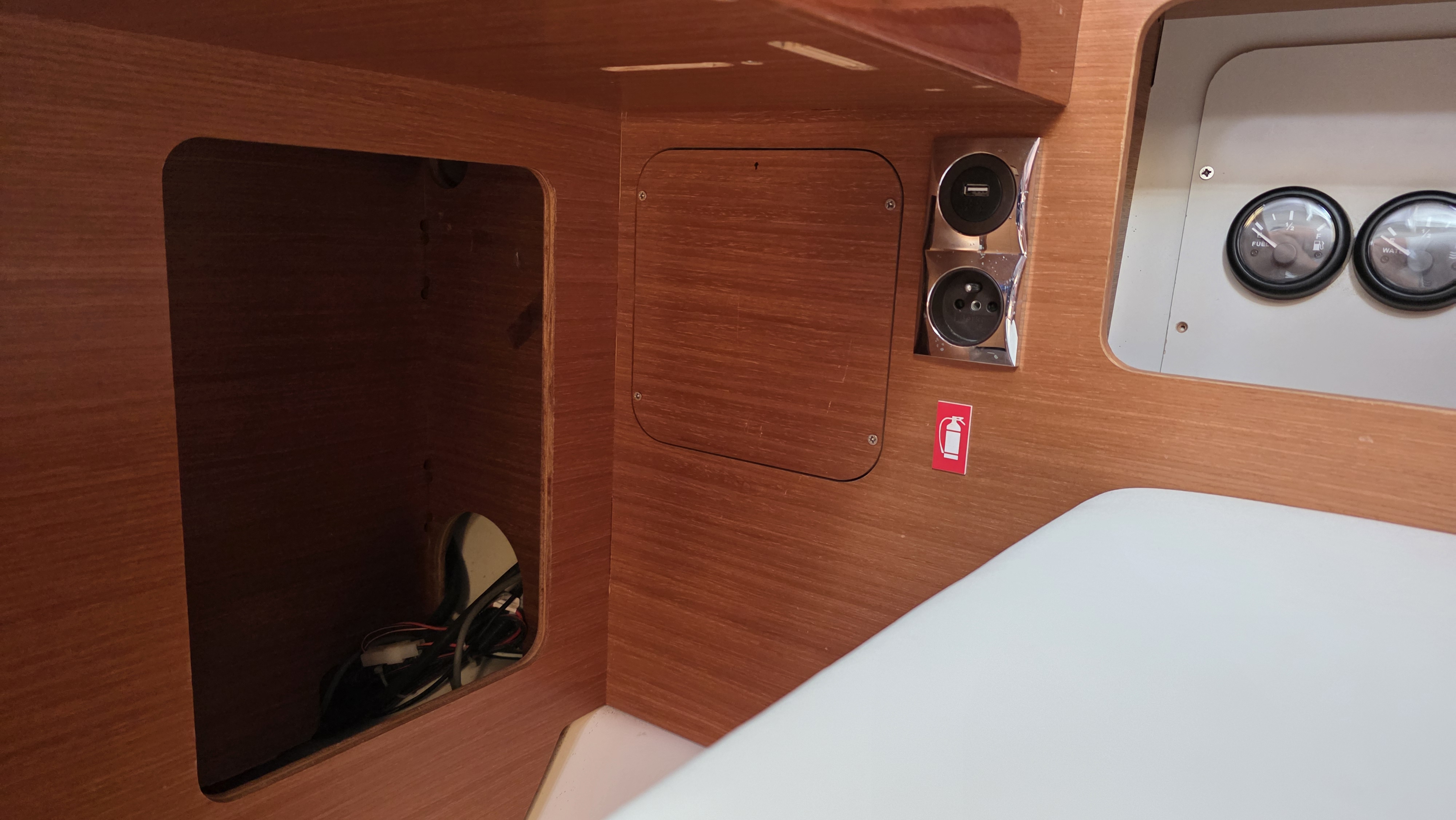 | Outside | 220 V-Landanschluss, Anker mit Kette, Badeplattform, Biminitop, Bootshaken, Cockpitdusche, Cockpitlautsprecher, Cockpitpolster, Cockpittisch, Dieselkanister , elektr. Ankerwinsch, Fender, Festmacherleinen, Gangway, Grill, Kugelfender, Kunststoff-Eimer (Pütz), Sprayhood, Teak im Cockpit, Wasserkanister , Wasserschlauch |