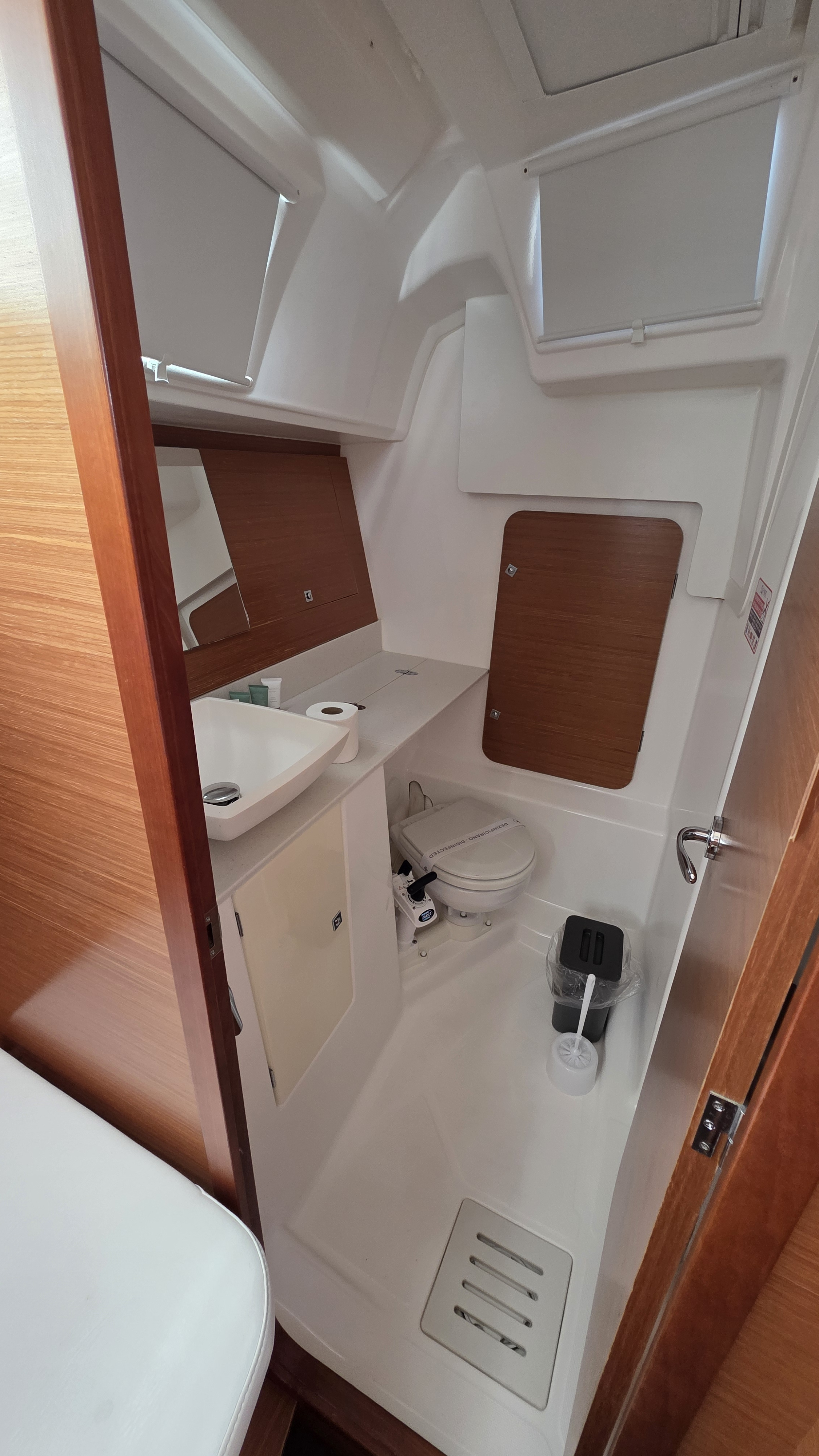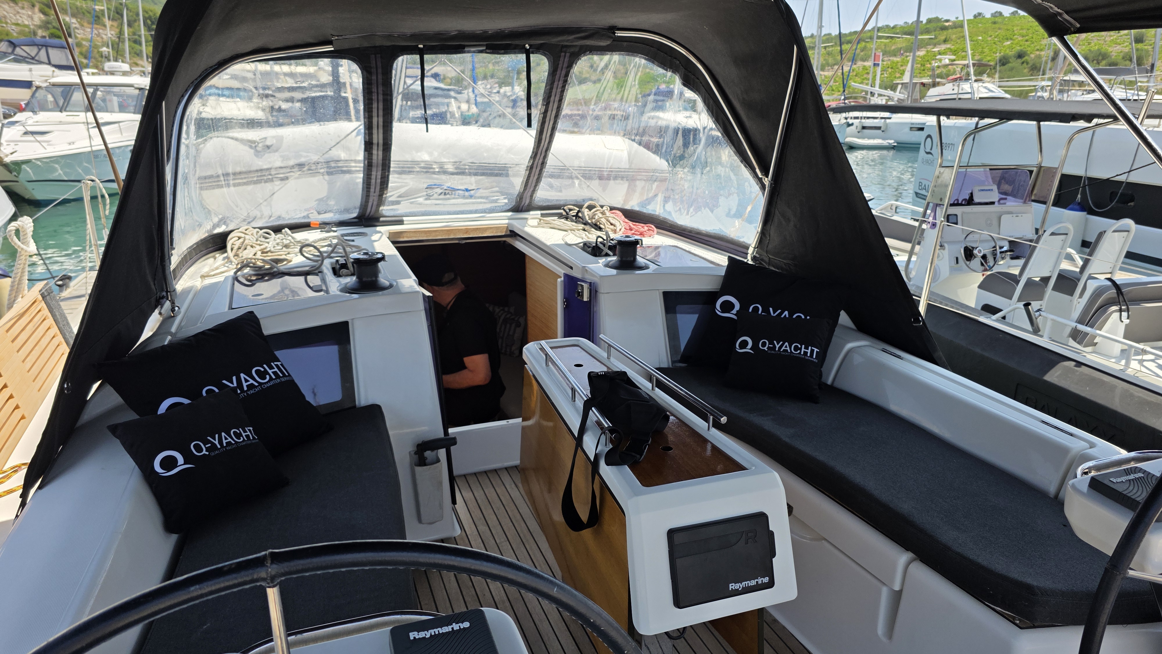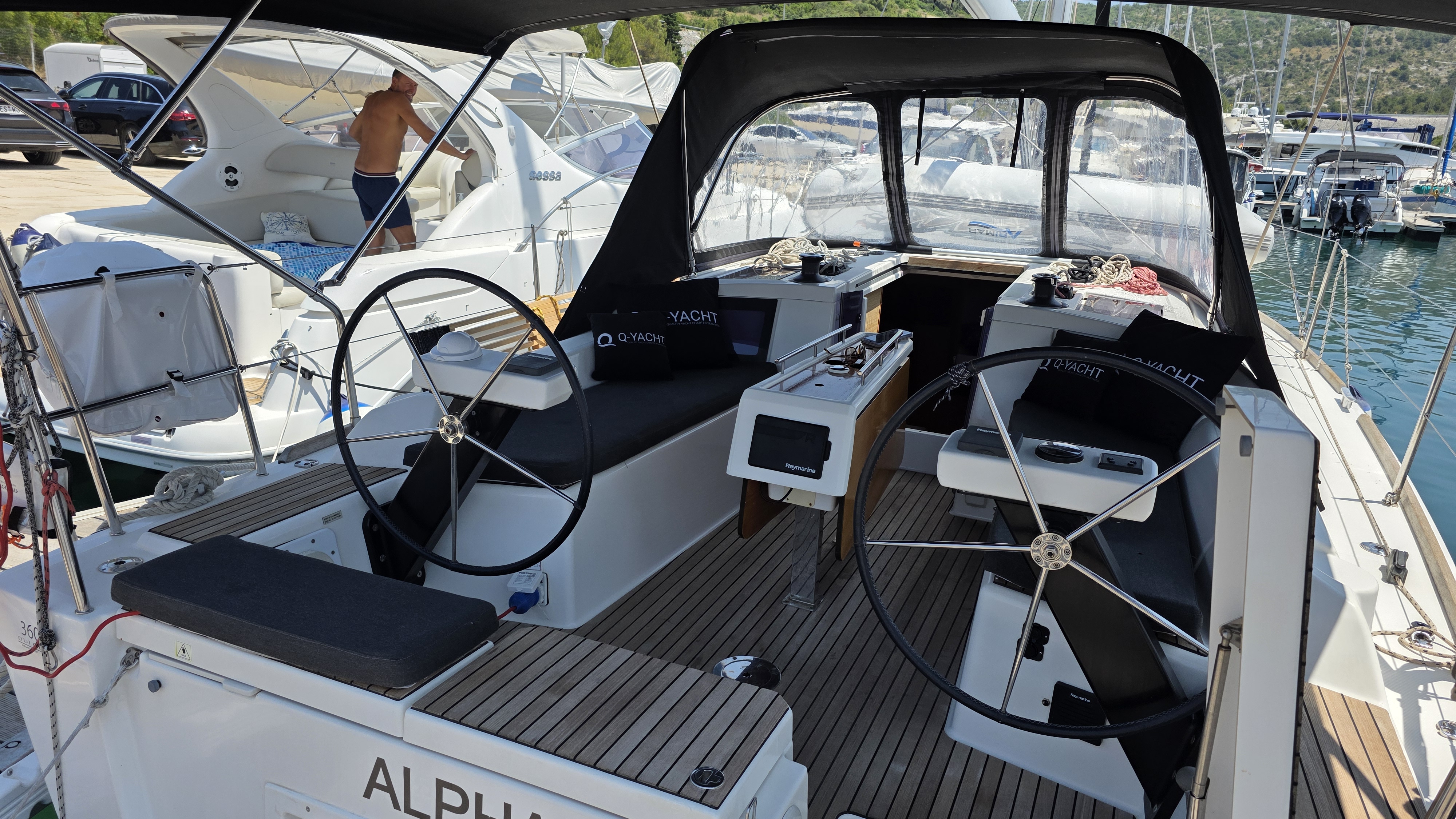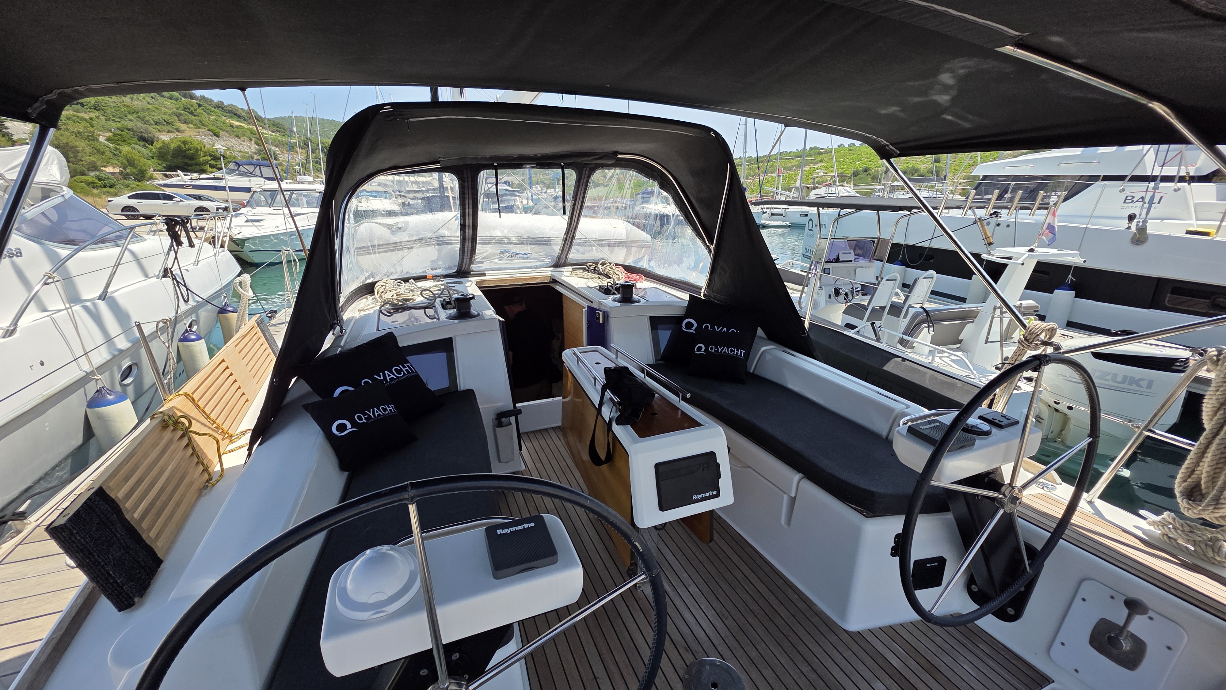 | Outside | 220 V-Landanschluss, Anker mit Kette, Badeplattform, Biminitop, Bootshaken, Cockpitdusche, Cockpitlautsprecher, Cockpitpolster, Cockpittisch, Dieselkanister , elektr. Ankerwinsch, Fender, Festmacherleinen, Gangway, Grill, Kugelfender, Kunststoff-Eimer (Pütz), Sprayhood, Teak im Cockpit, Wasserkanister , Wasserschlauch |