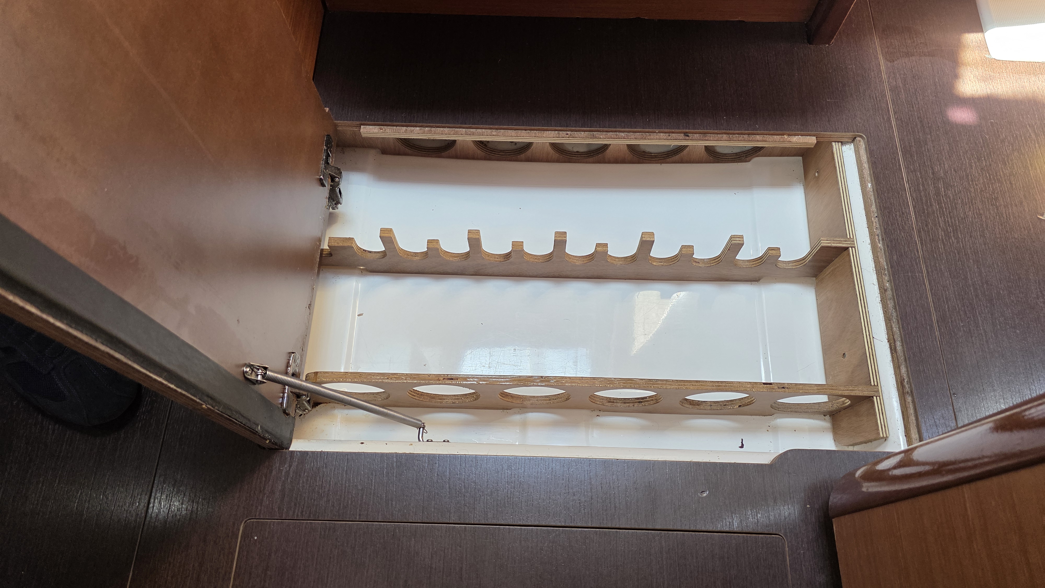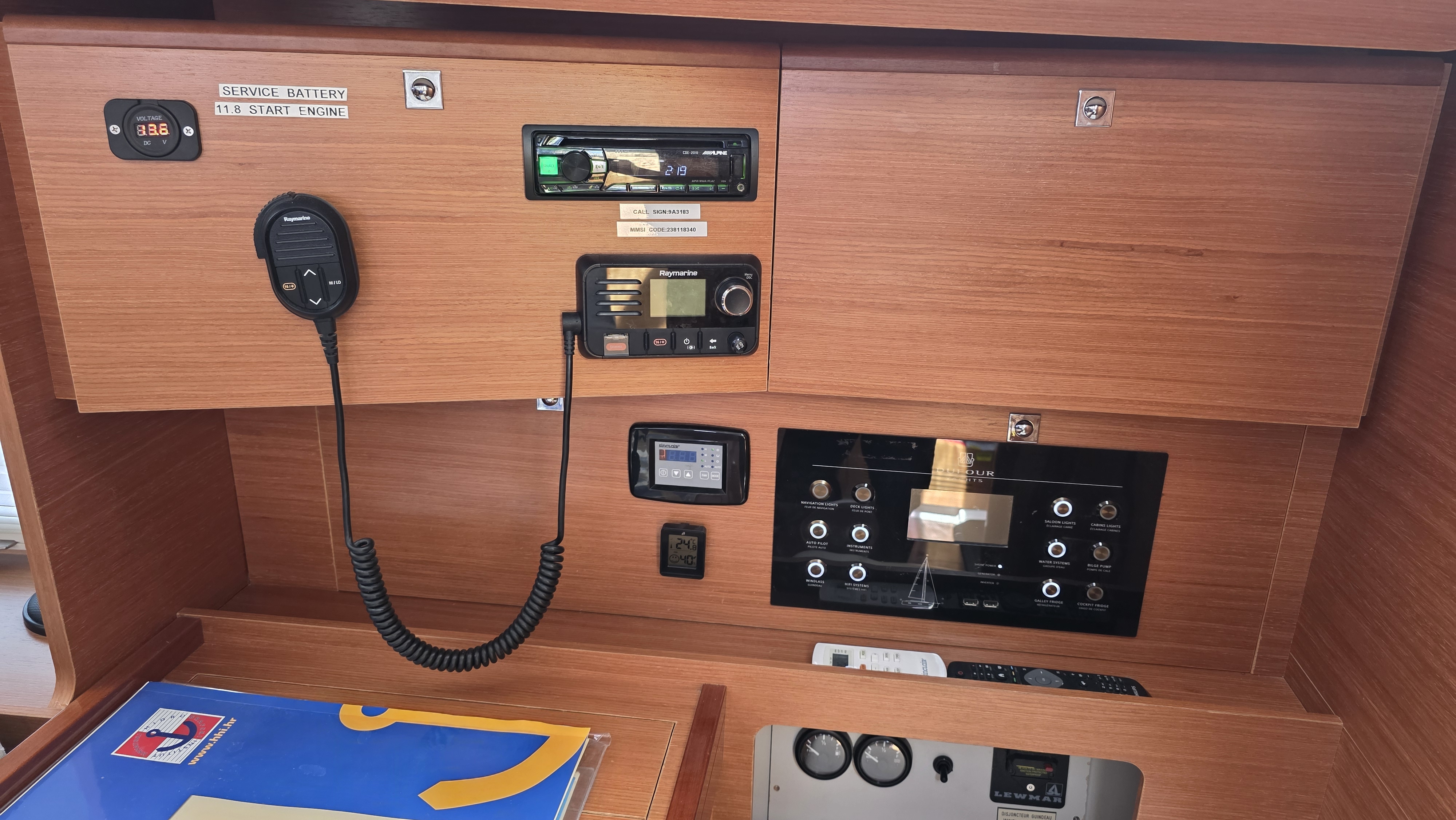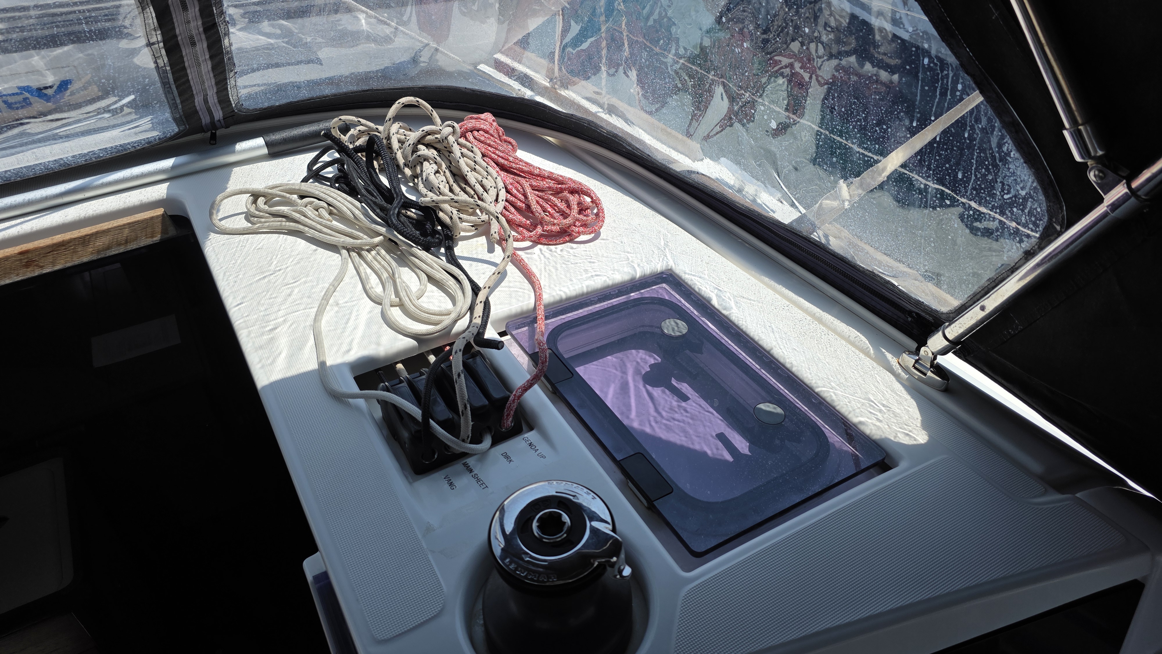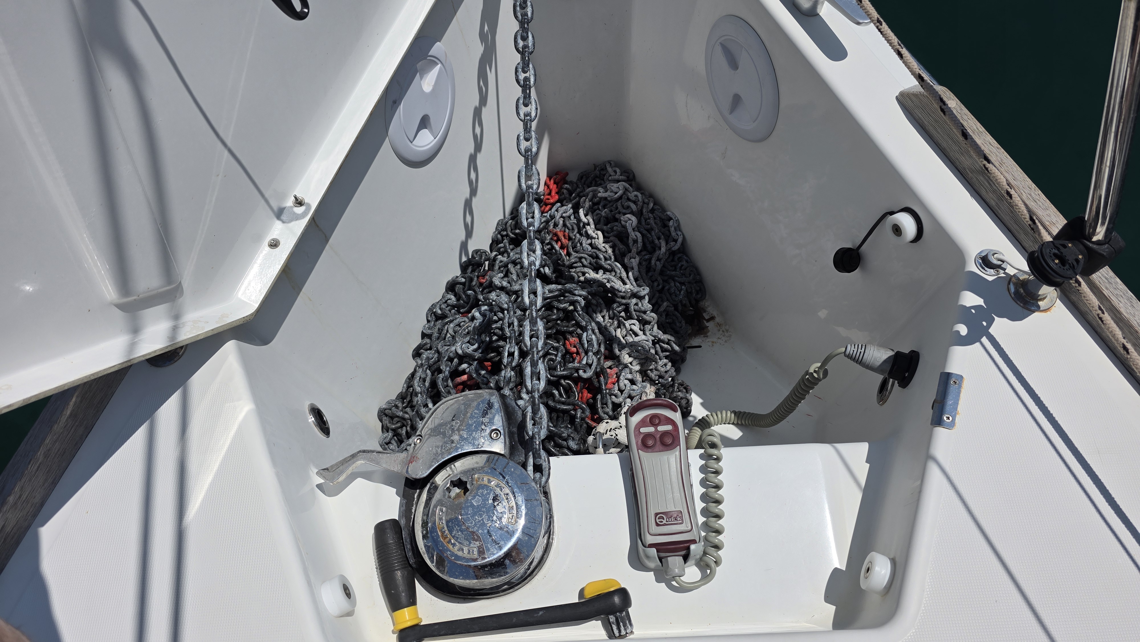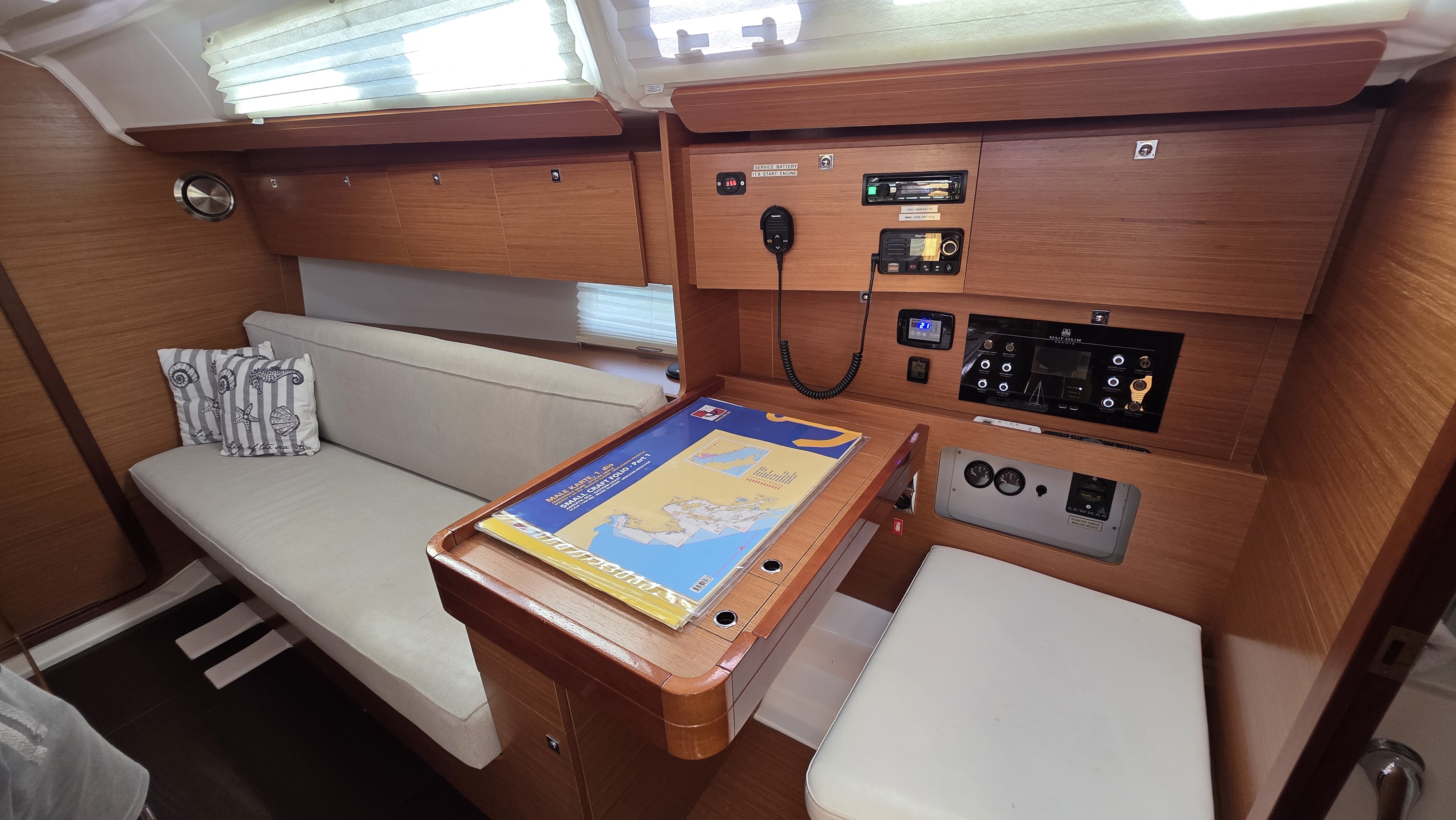 | Navigation | Fernglas mit Peilkompass, GPS mit Kartenplotter im Cockpit, Hafenhandbücher, Navigationsbesteck, Seekarten, Tridata (Log, Echolot, Windm.) |