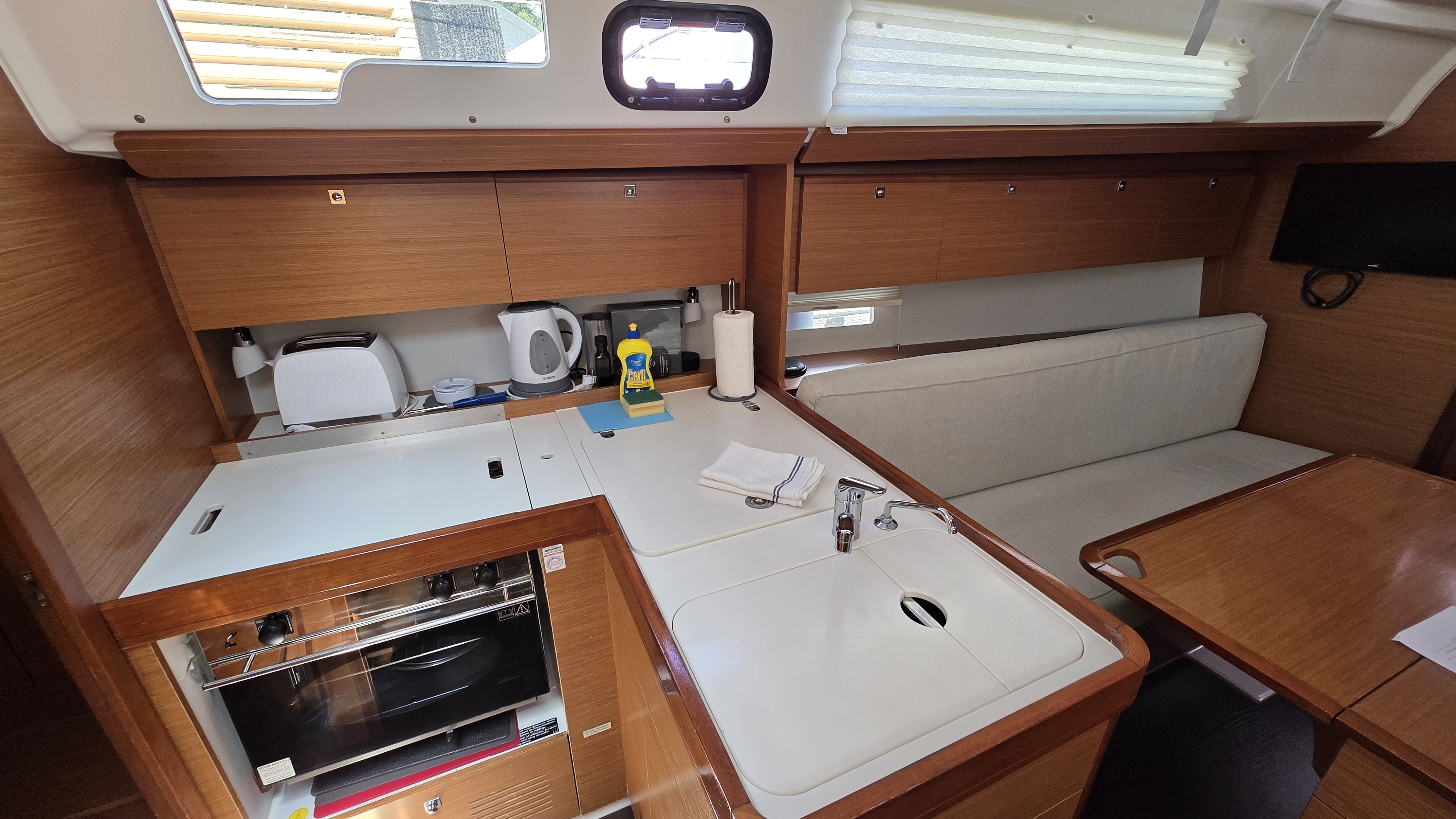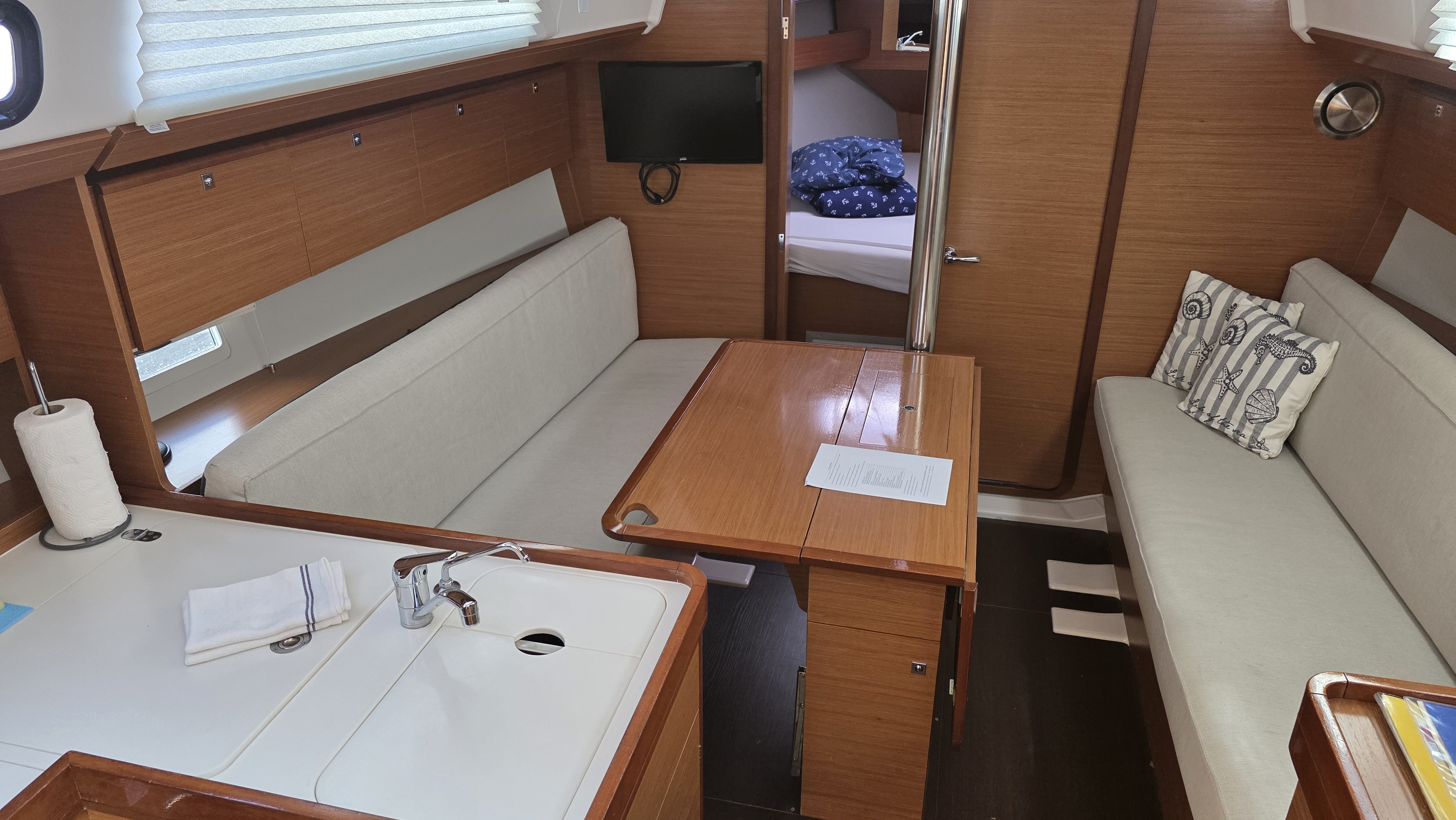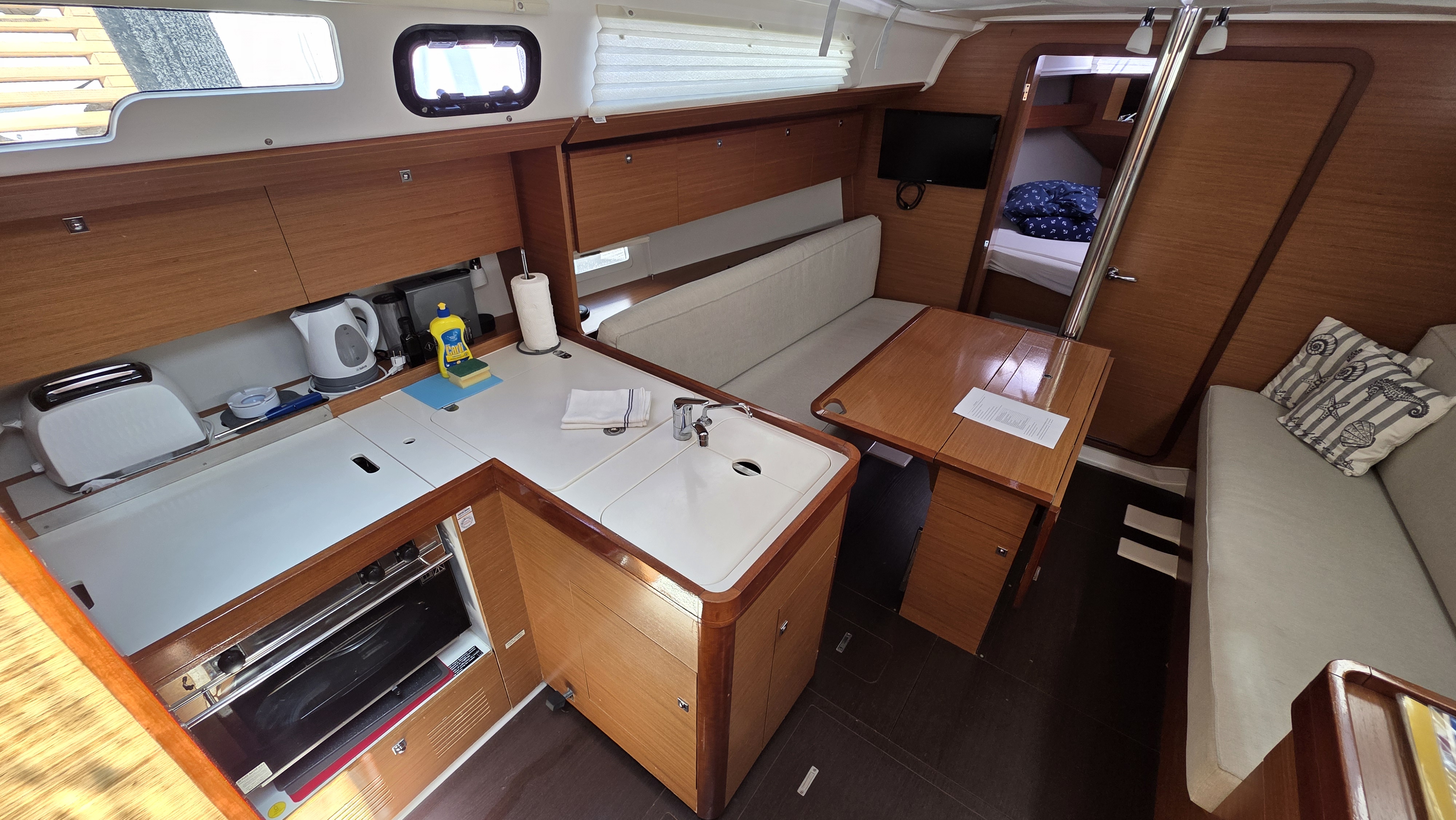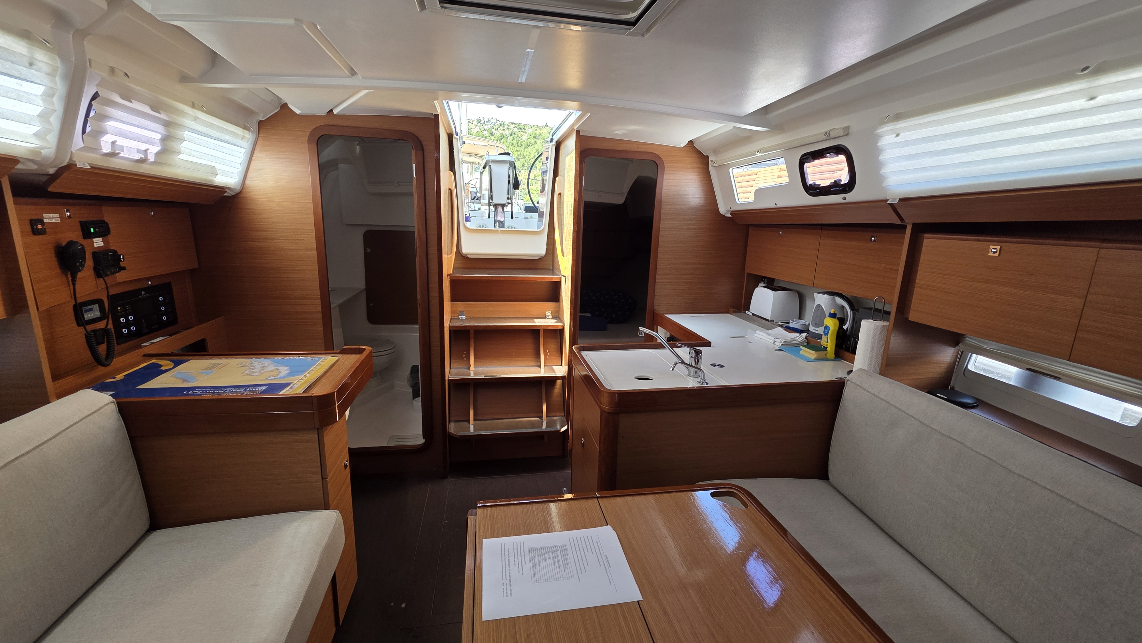 | Inside | Dusche, Heizung, Klimaanlage (Landstrom), Kühlschrank, Ladegerät, Luftpumpe für Beiboot, Pantryausstattung, Radio mit CD oder MP3, Salontisch absenkbar, Warmwasser |