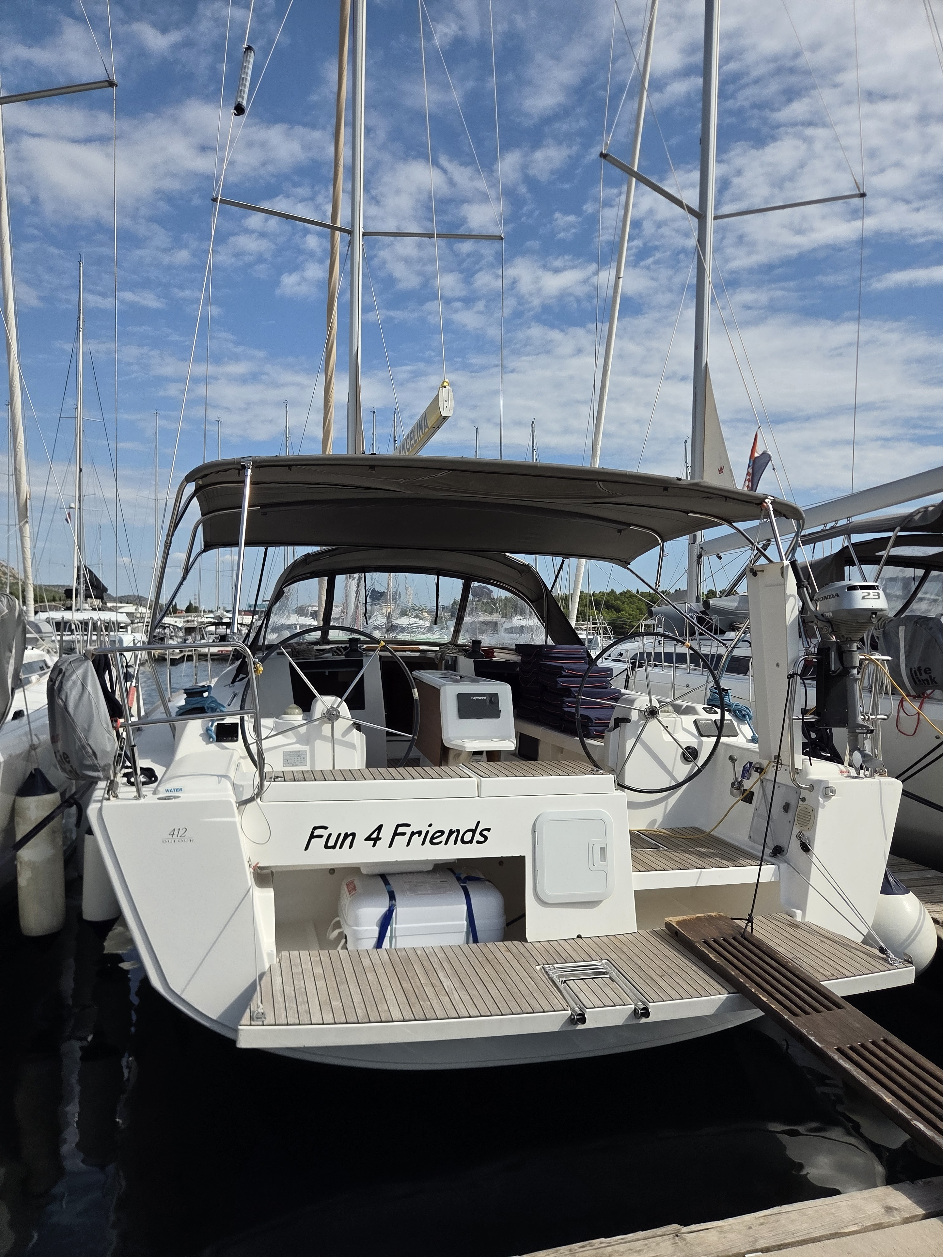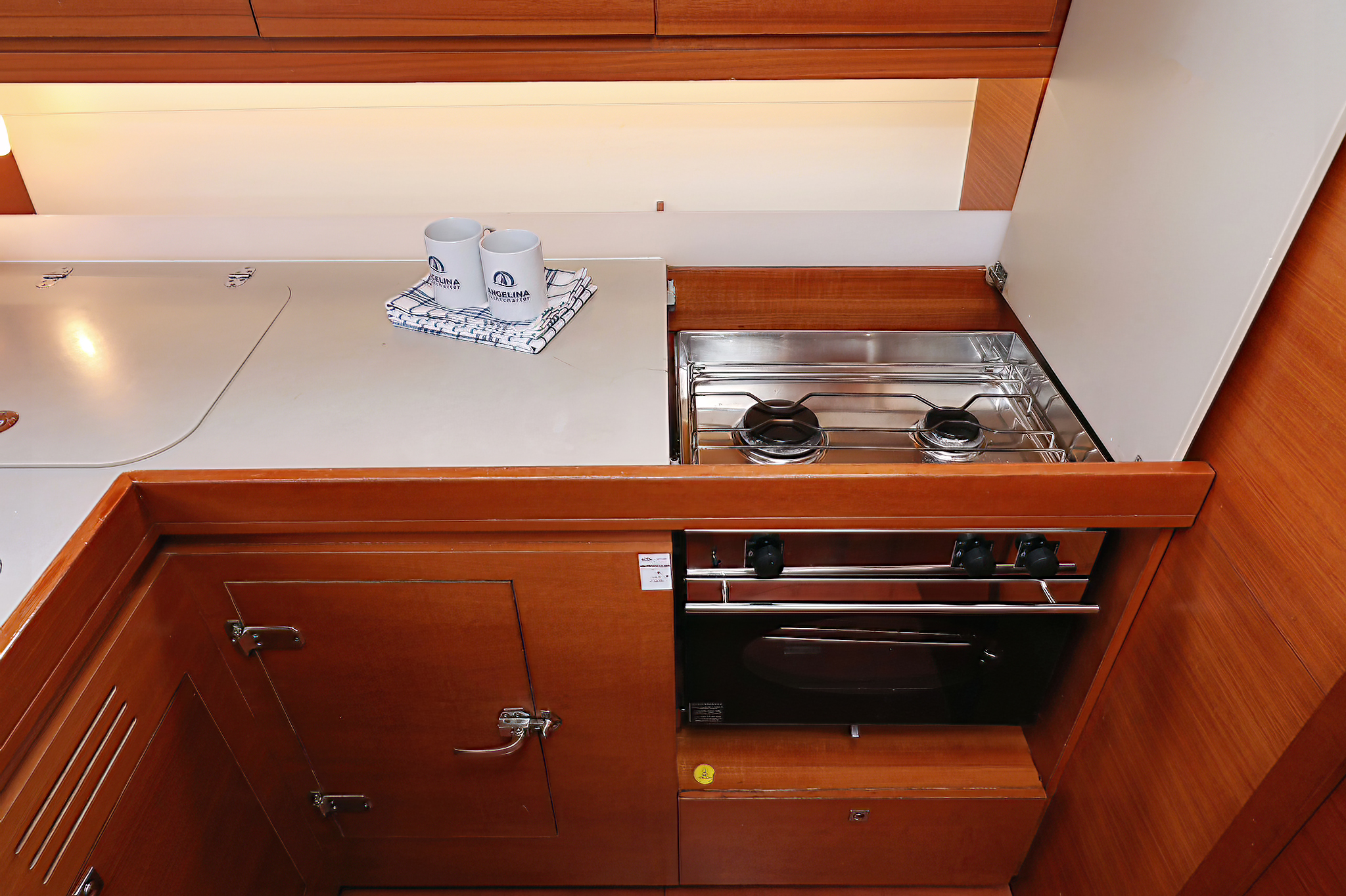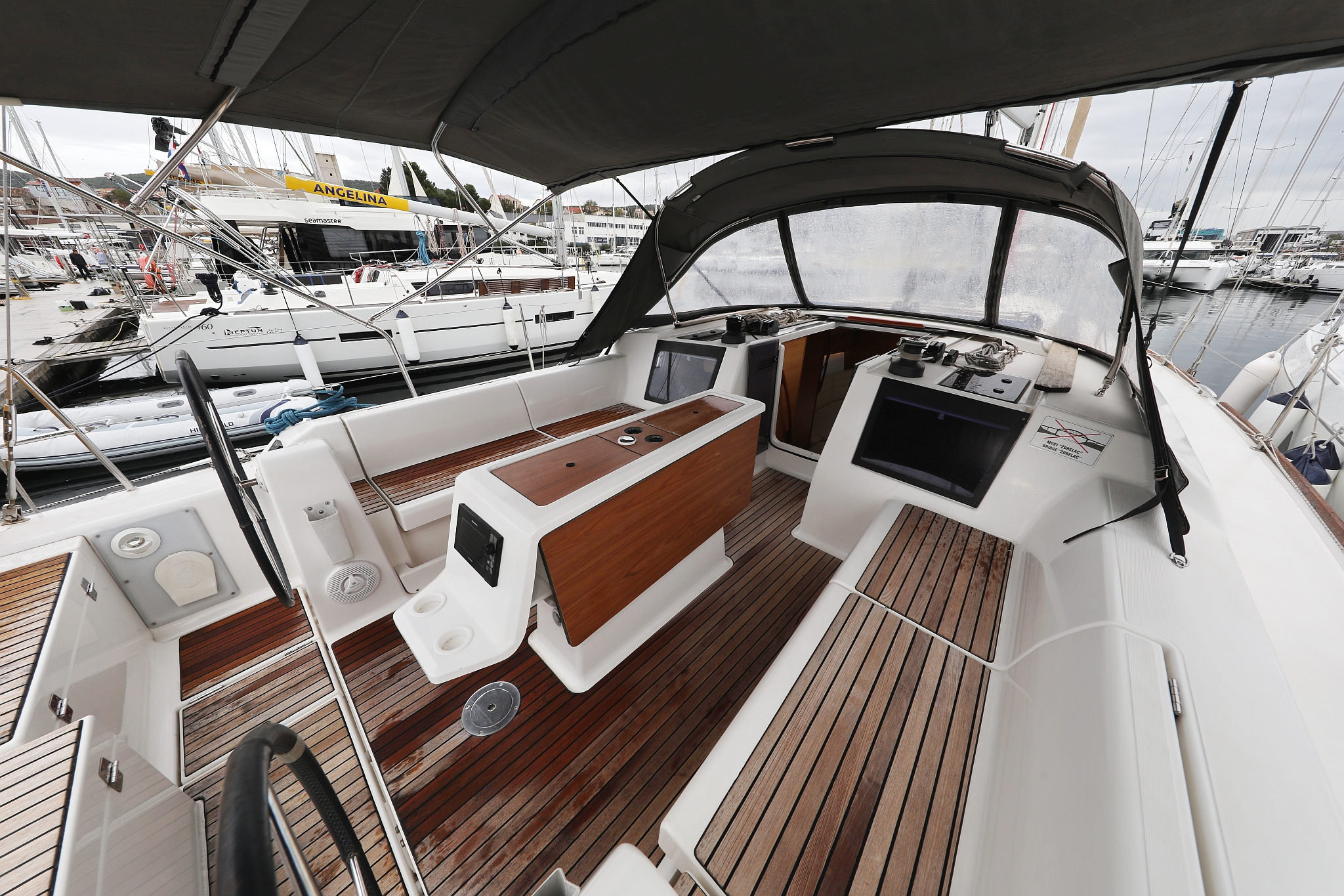 | Outside | Anker mit Kette, Badeplattform, Biminitop, Bootshaken, Cockpitdusche, Cockpitlautsprecher, Cockpitpolster, Cockpittisch, elektr. Ankerwinsch, Fender, Festmacherleinen, Gangway, Grill, Kugelfender, Solaranlage, Sprayhood, Spülbecken im Cockpit, Teak im Cockpit, Wasserschlauch, Winschen |