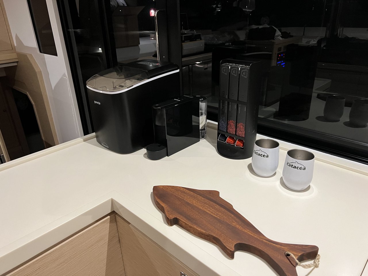| Inside | Backofen, Borduhr, Eiswürfelmaschine, Gasherd, Kaffeemaschine, Klimaanlage (Landstrom), Ladegerät, Moskitonetze, Spülbecken, Warmwasser, Weinkühlschrank |