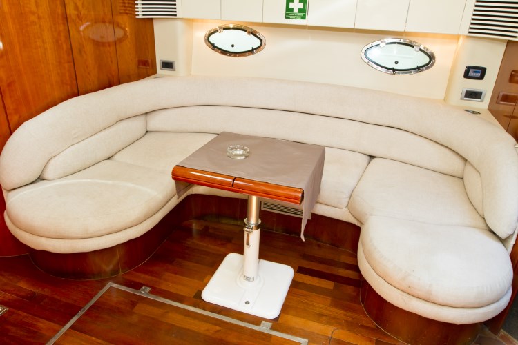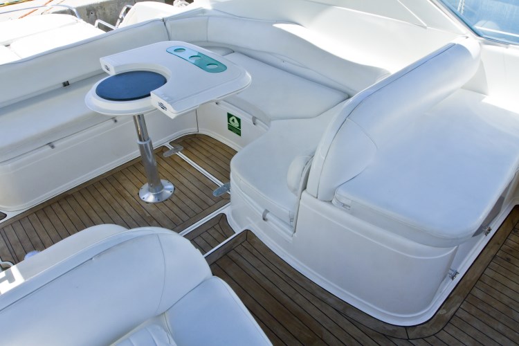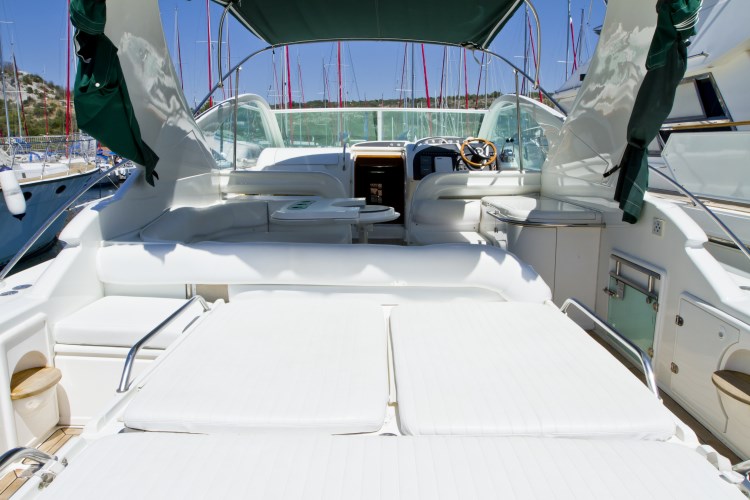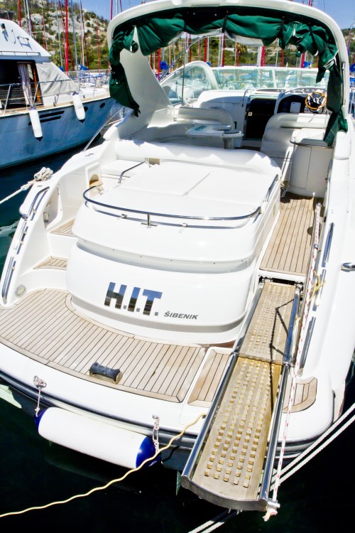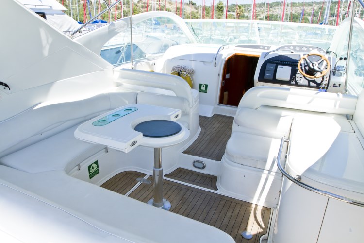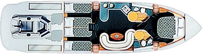| Outside | 220 V-Landanschluss, Anker mit Kette, Ankerkettenzähler, Badeleiter, Badeplattform, Biminitop, Cockpitdusche, Cockpitkühlschrank, Cockpittisch, elektr. Ankerwinsch, Fender, Festmacherleinen, hydraul. Gangway, Sonnendeck, Tendergarage |