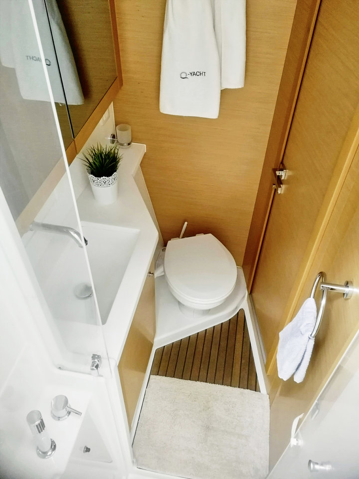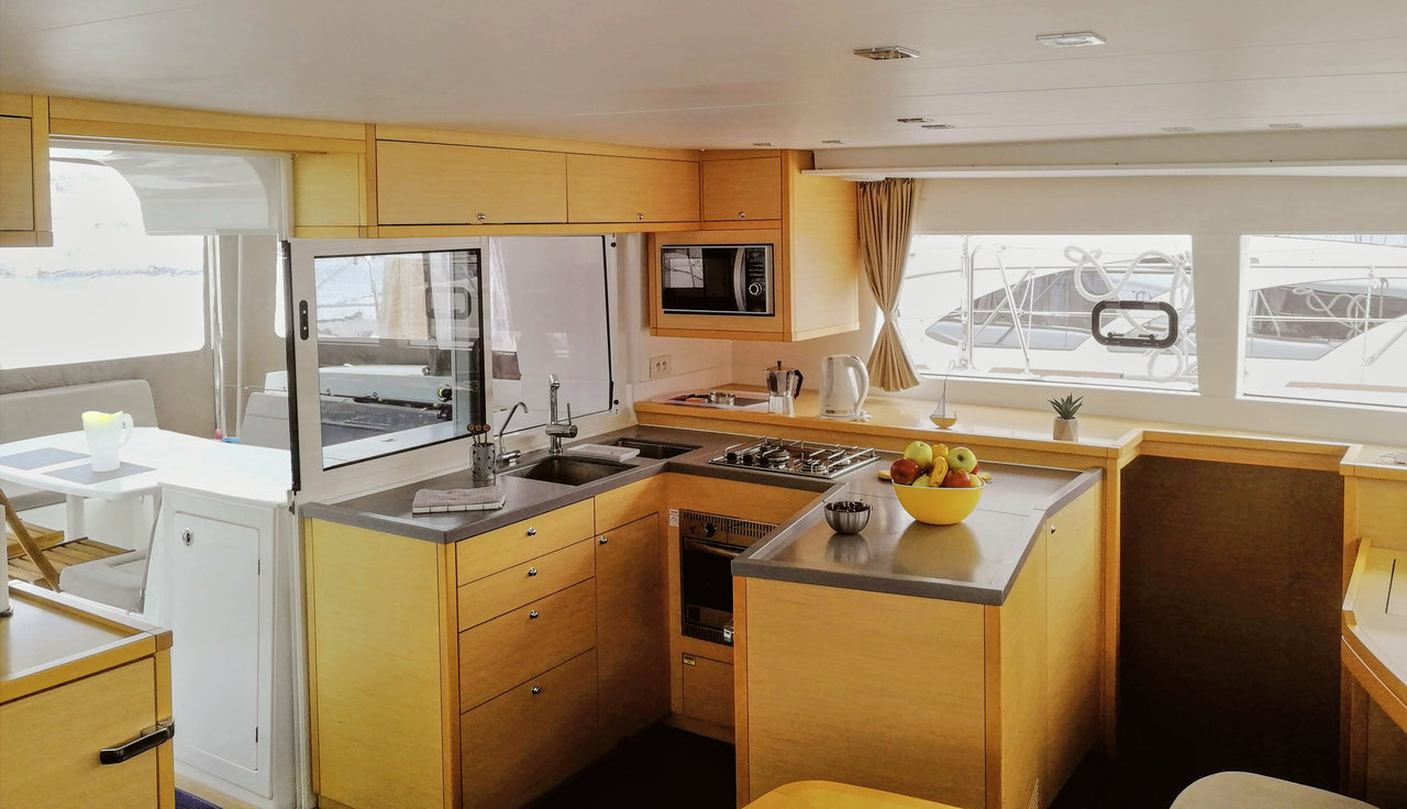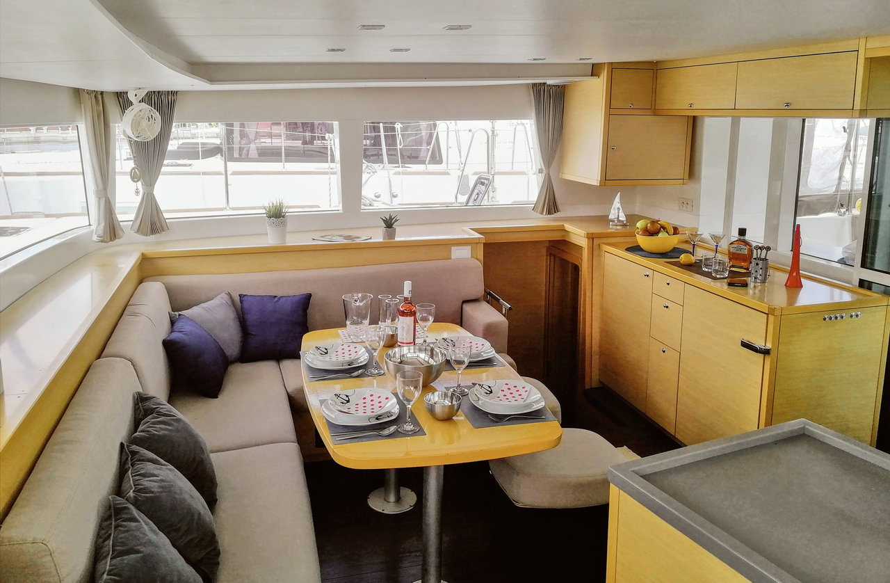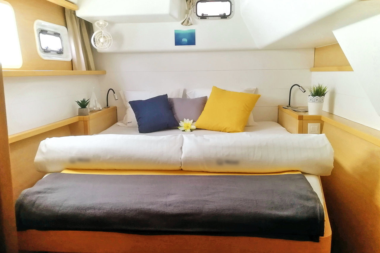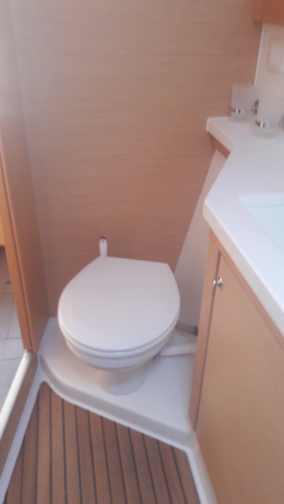 | Inside | 2. Kühlschrank, Backofen, Gasherd, Generator, Heizung, Kaffeemaschine, Klimaanlage (ohne Landstrombedarf), Kühlschrank, Ladegerät, Luftpumpe für Beiboot, Pantryausstattung, Radio mit Bluetooth, Salontisch absenkbar, Ventilatoren in Kabinen, Warmwasser, WC (elektr.) |