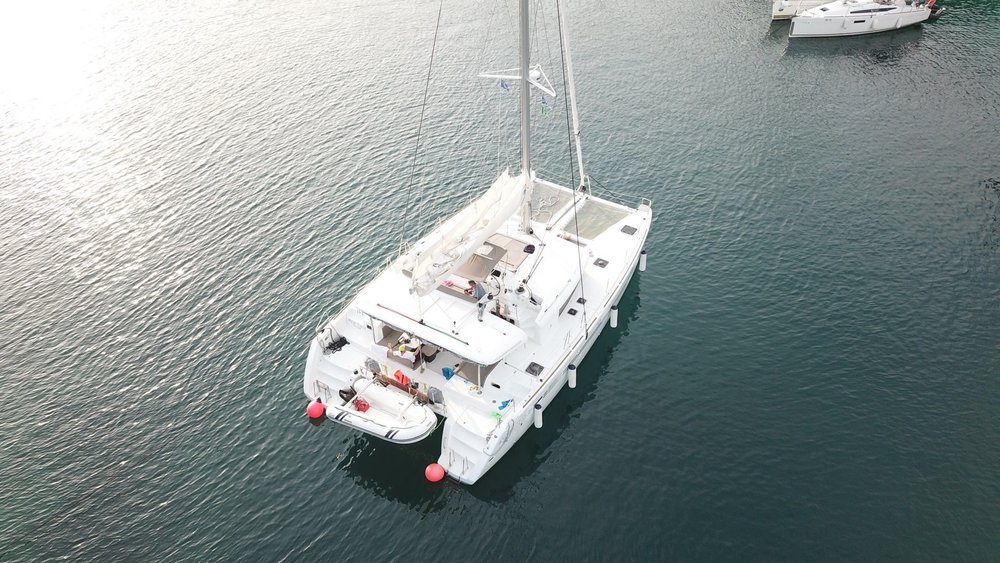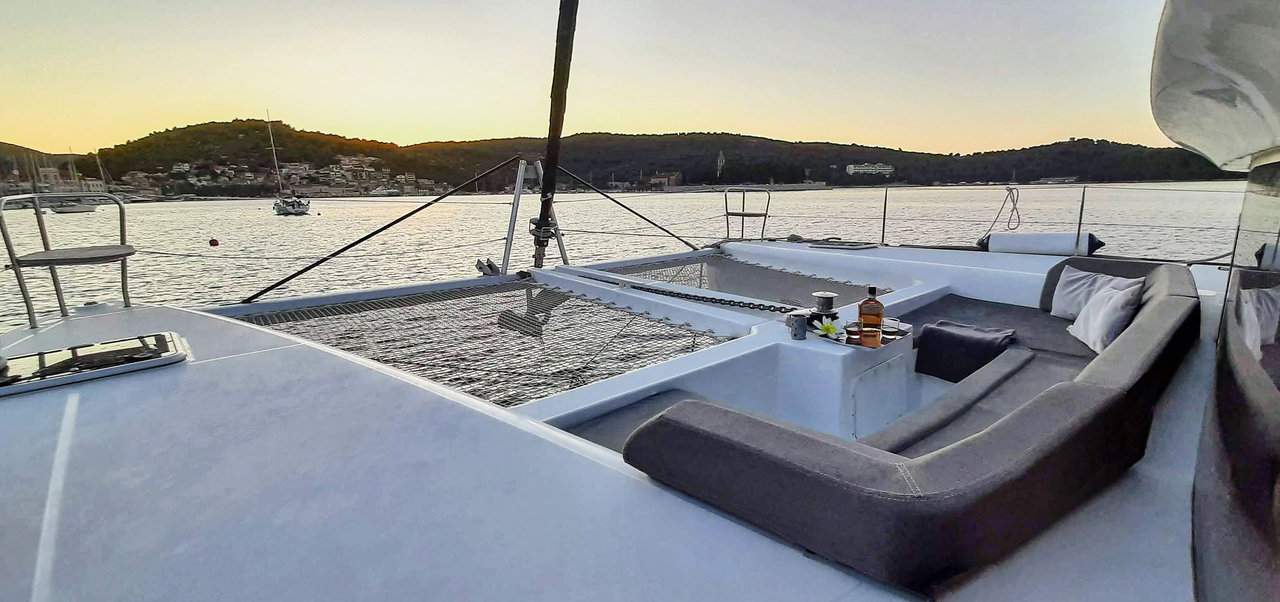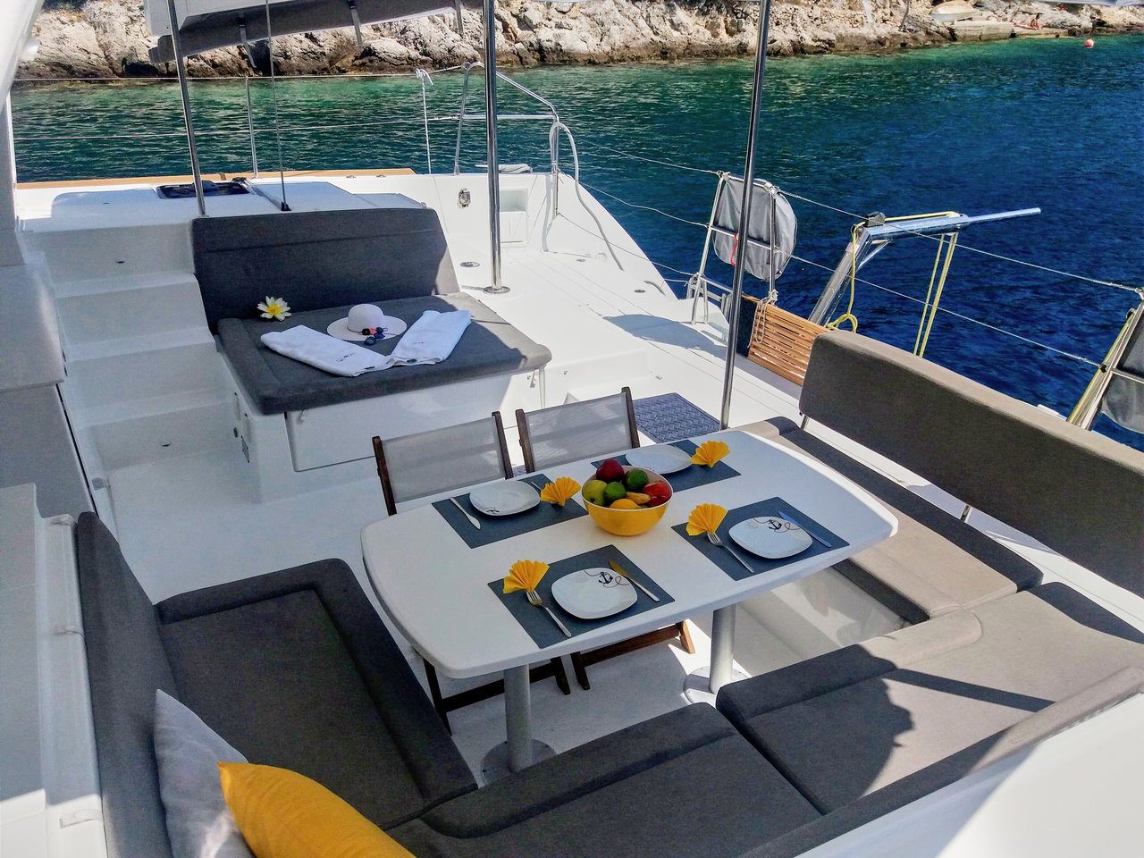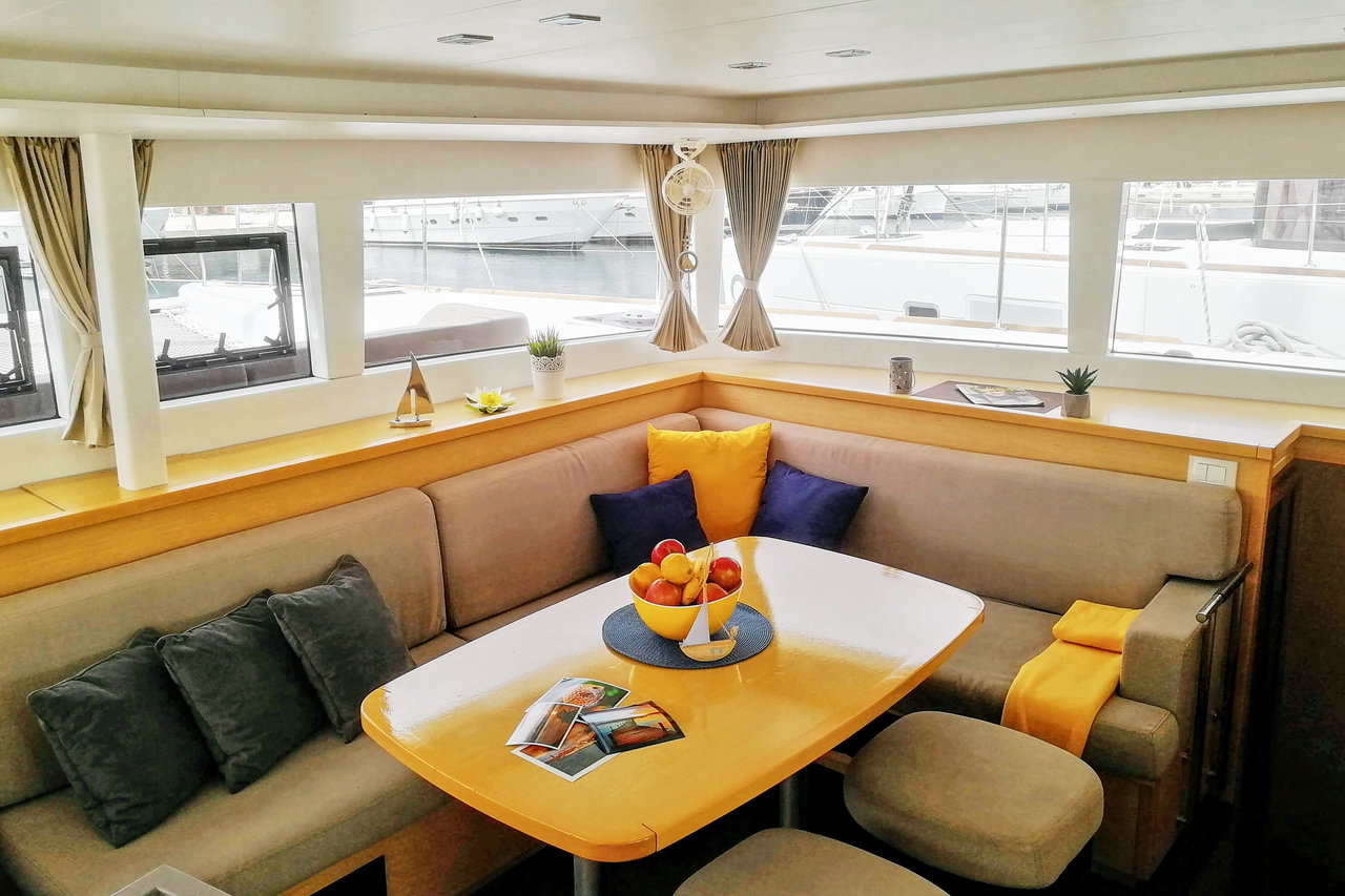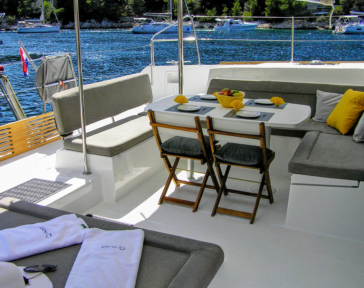 | Inside | 2. Kühlschrank, Backofen, Gasherd, Generator, Heizung, Kaffeemaschine, Klimaanlage (ohne Landstrombedarf), Kühlschrank, Ladegerät, Luftpumpe für Beiboot, Pantryausstattung, Radio mit Bluetooth, Salontisch absenkbar, Ventilatoren in Kabinen, Warmwasser, WC (elektr.) |