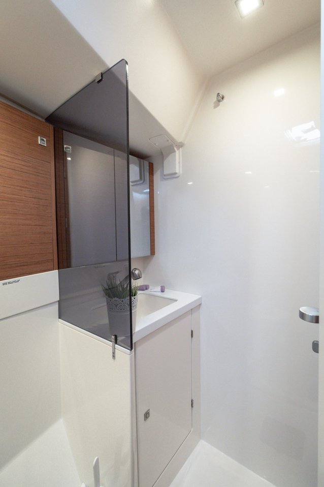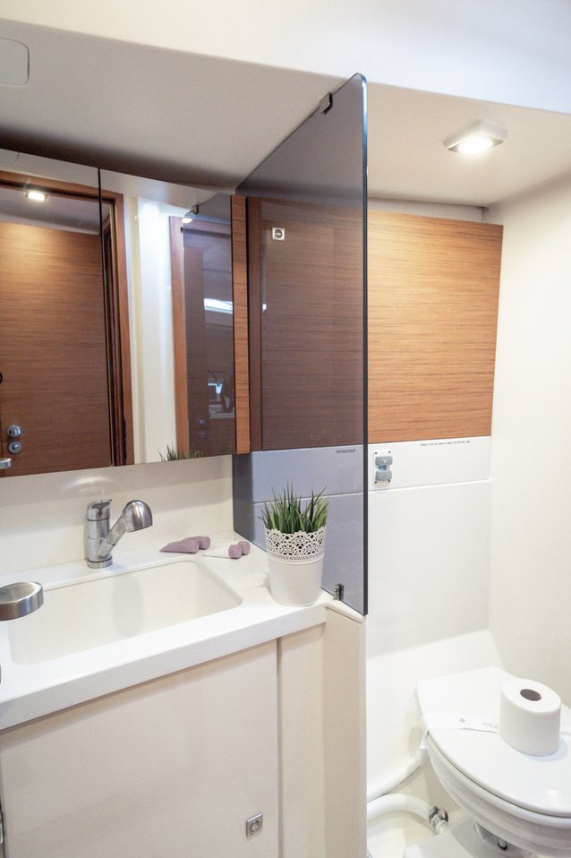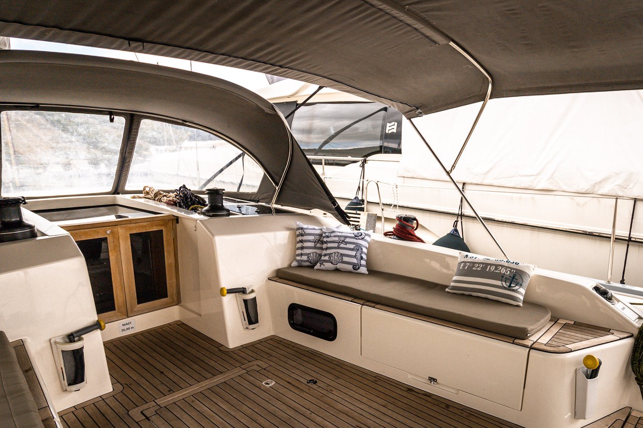 | Outside | Biminitop, Cockpitdusche, Cockpittisch, elektr. Ankerwinsch, elektr. Winsch, Gangway, Sprayhood, Teak im Cockpit |