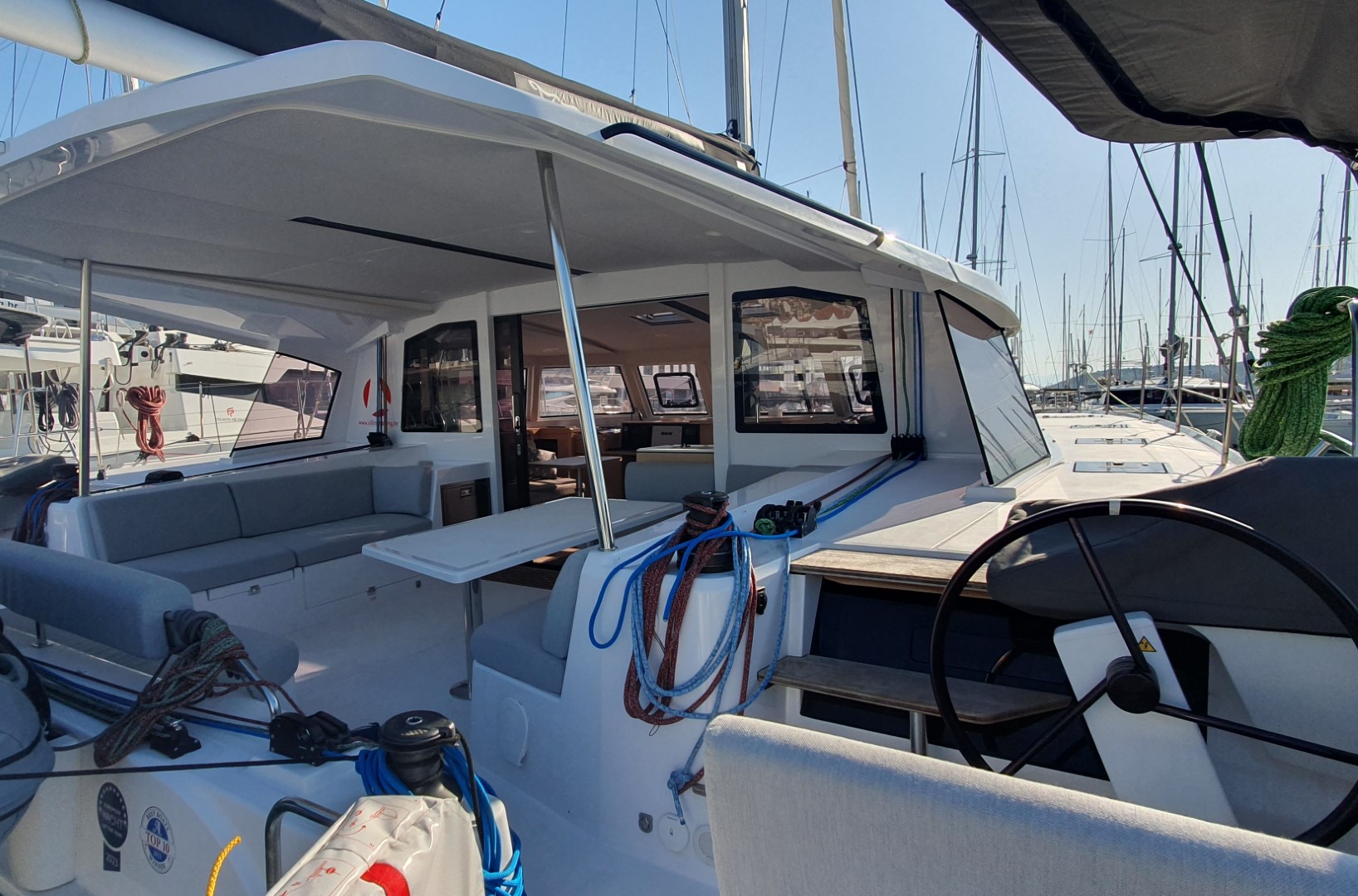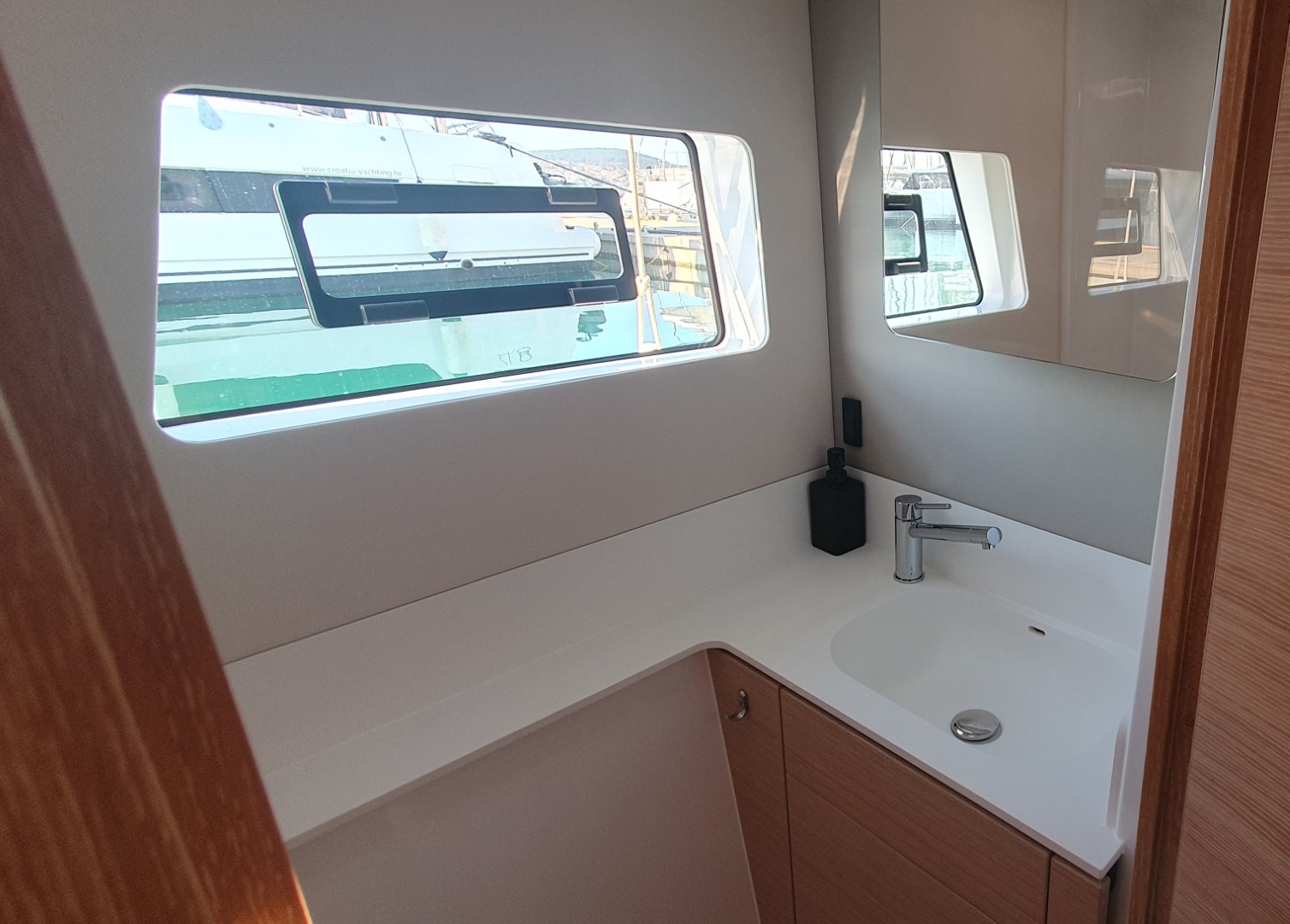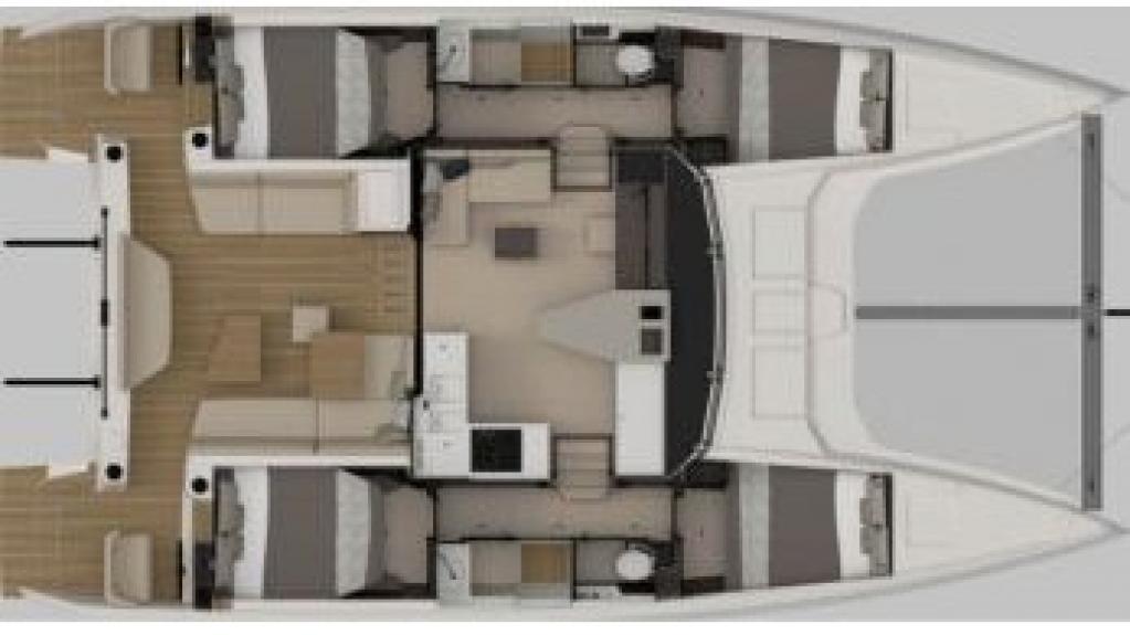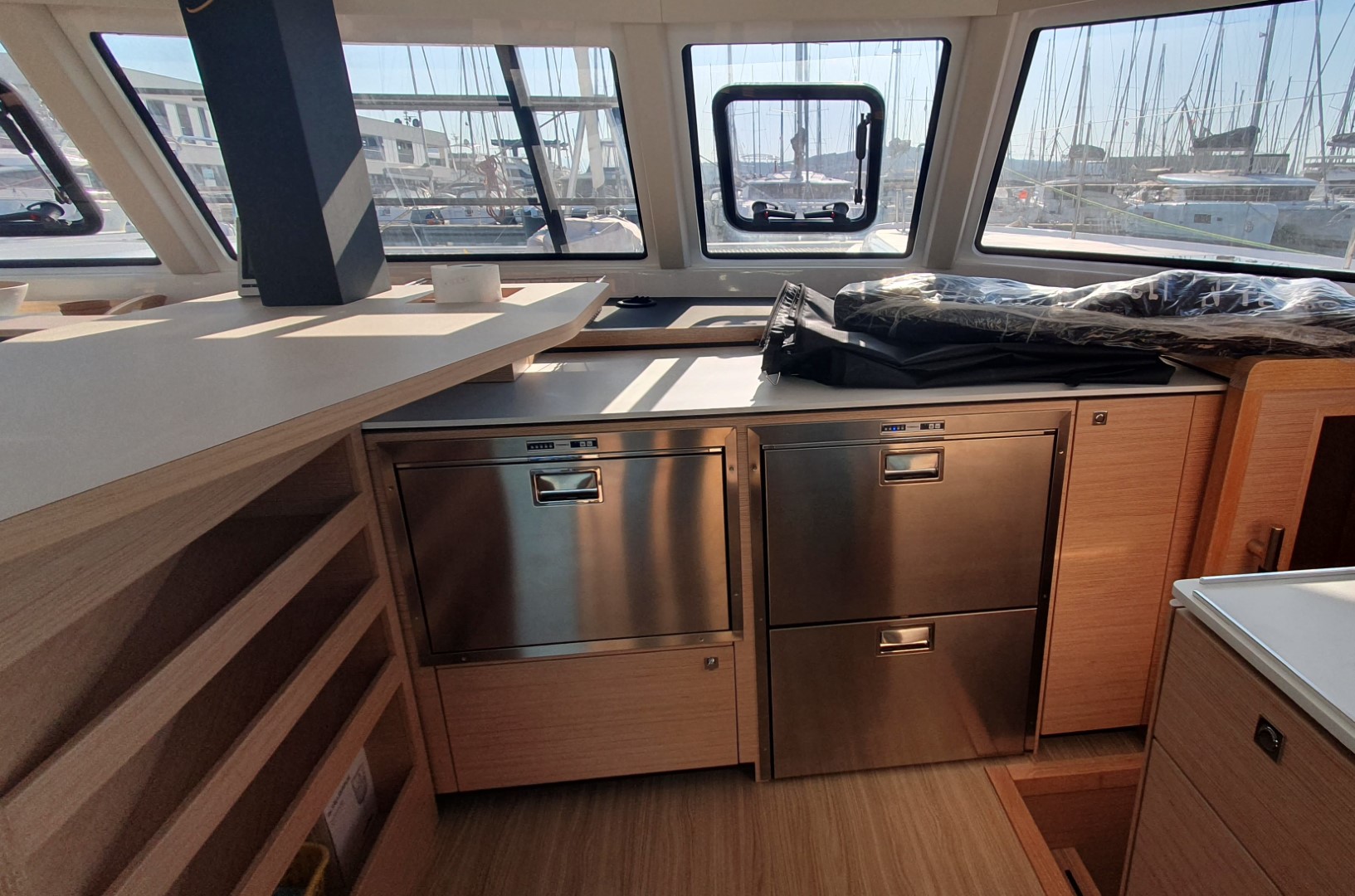 | Inside | FUSION Sound System, Gasherd mit Backofen, Gefrierschrank, Generator, Heizung, Klimaanlage (Landstrom), Kühlschrank, Ladegerät, Mikrowelle, Pantryausstattung, Radio mit CD und USB, TV, Ventilatoren in Salon und Kabinen, Warmwasser, Watermaker |