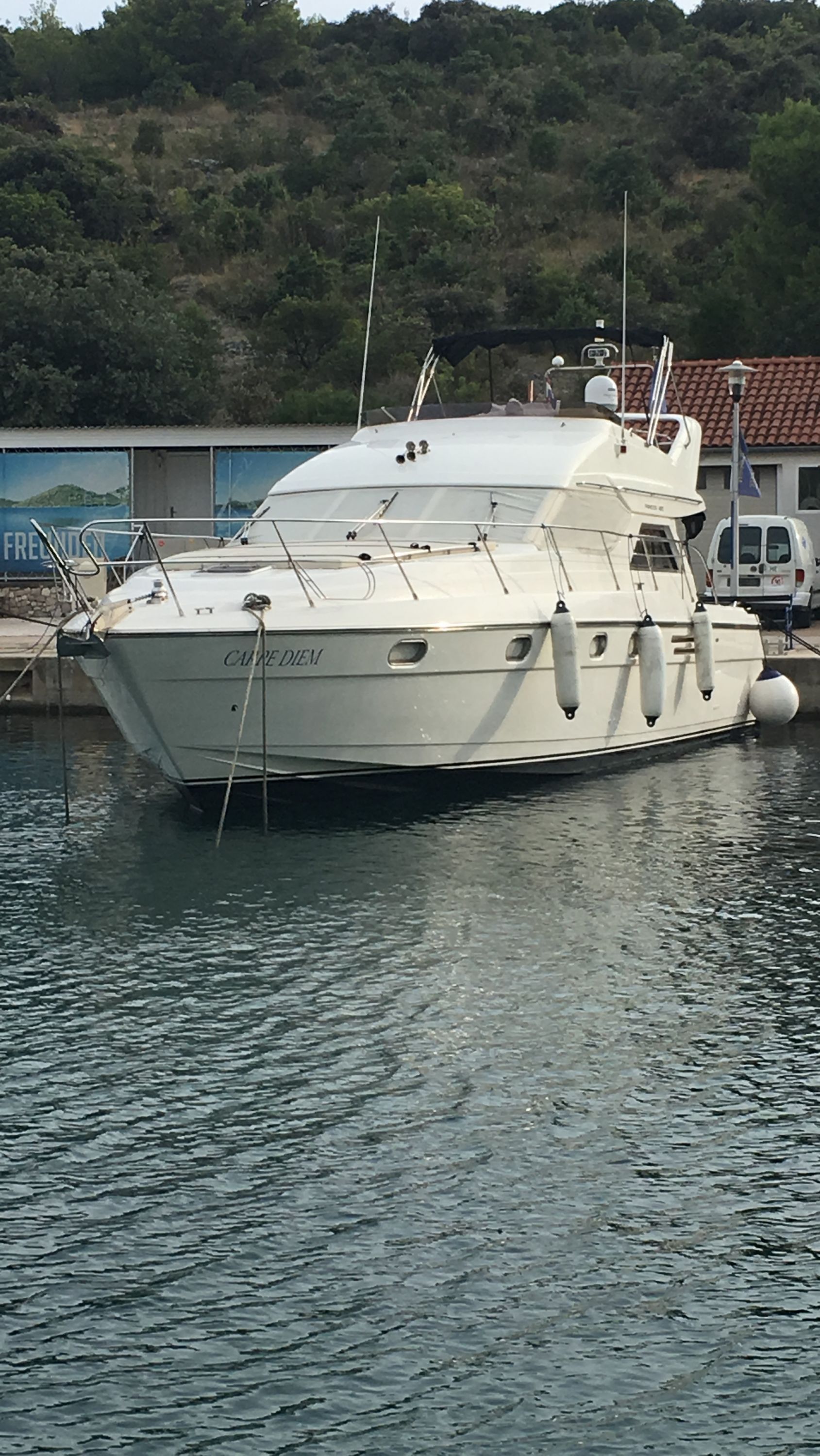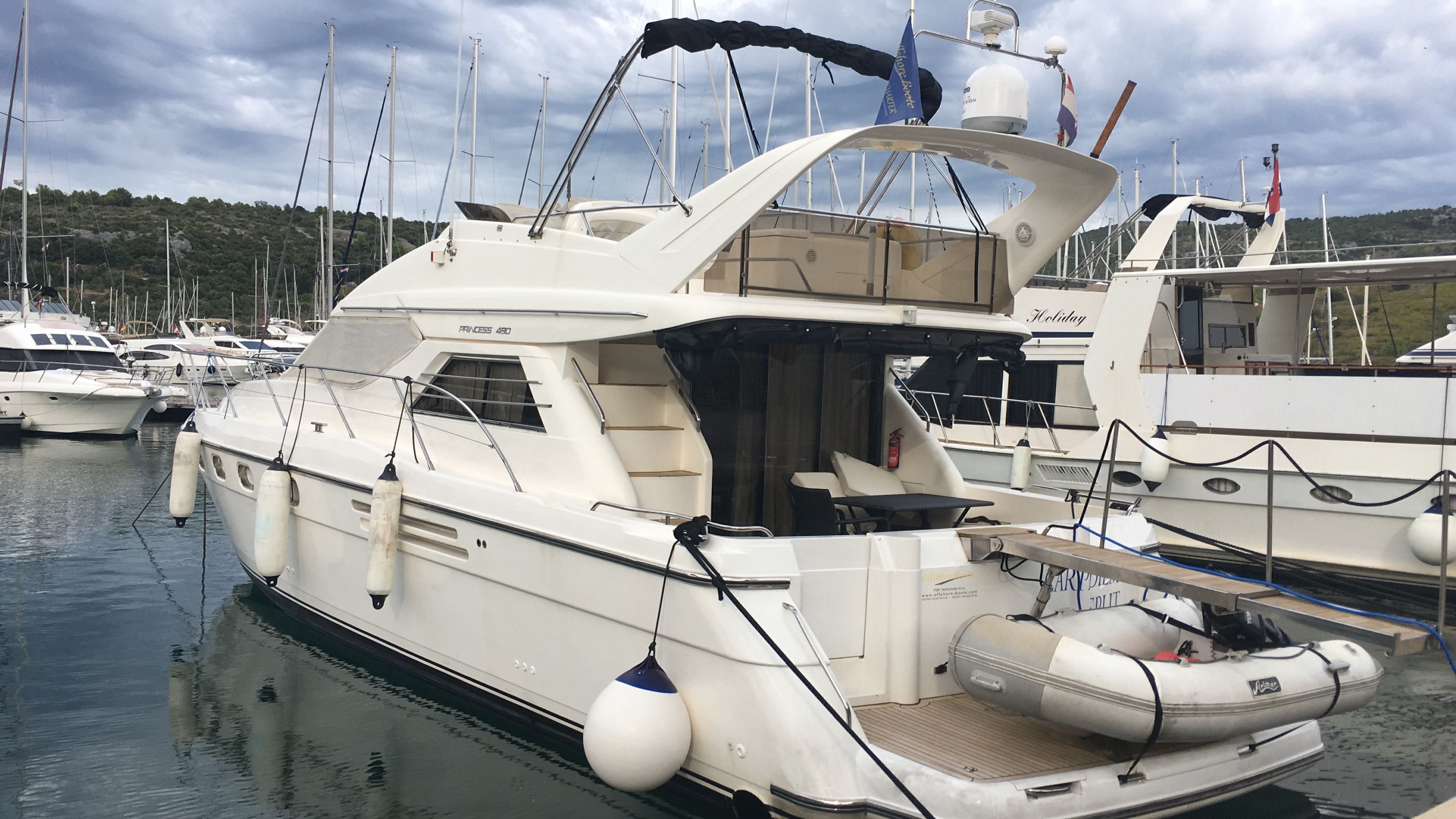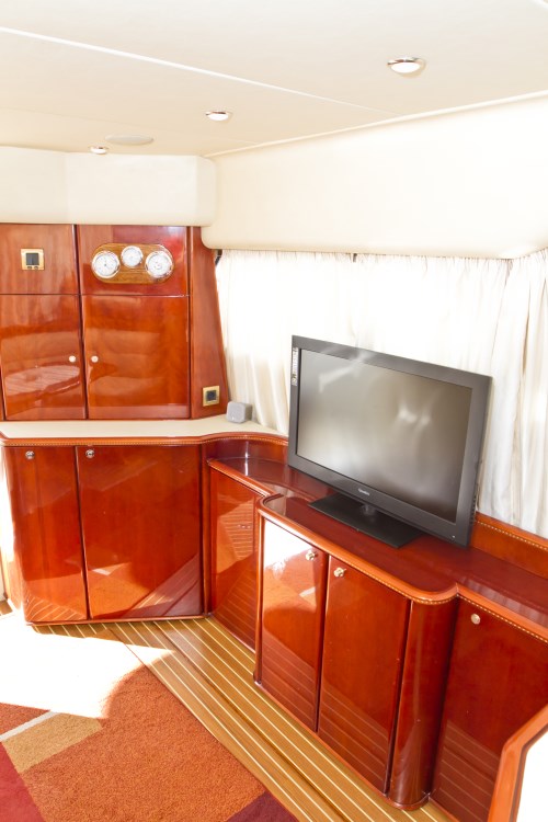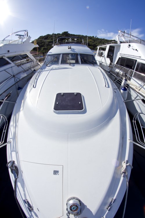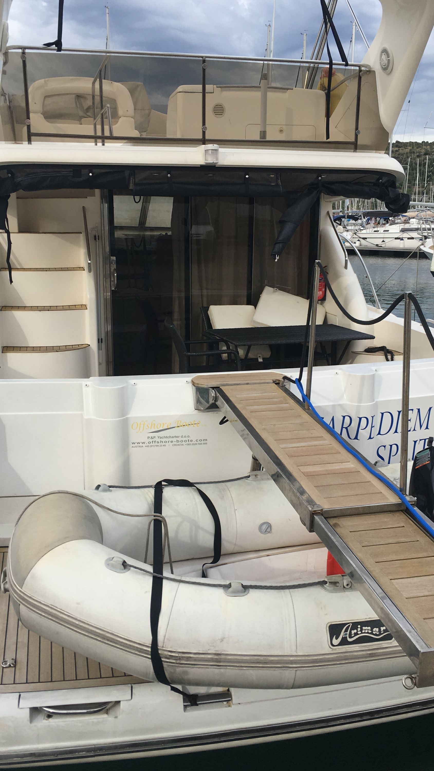 | Outside | 220 V-Landanschluss, Anker mit Kette, Badeleiter, Badeplattform, Biminitop, Cockpitdusche, elektr. Ankerwinsch, Fender, Festmacherleinen, Flybridge, hydraul. Gangway, Kühlschrank auf Flybridge, Sonnendeck |
