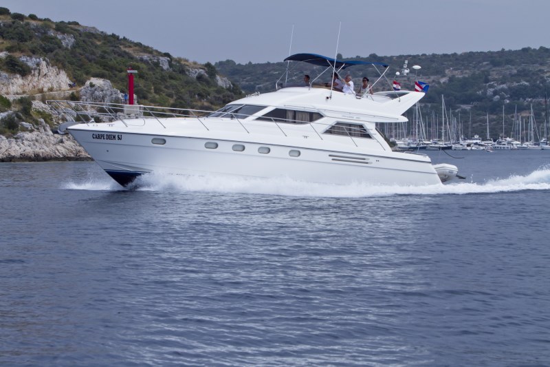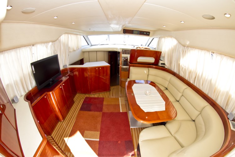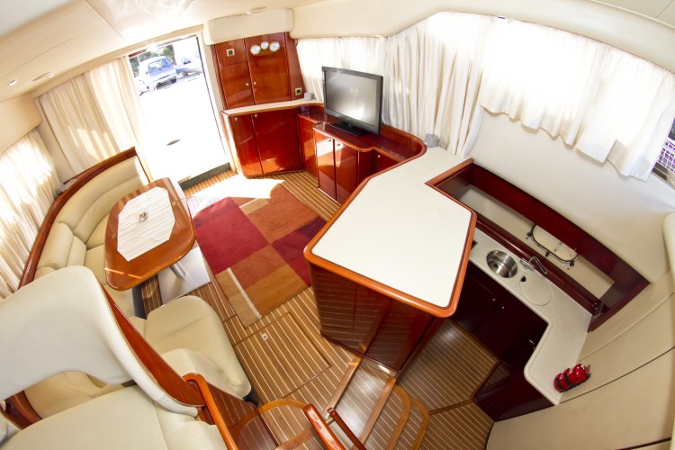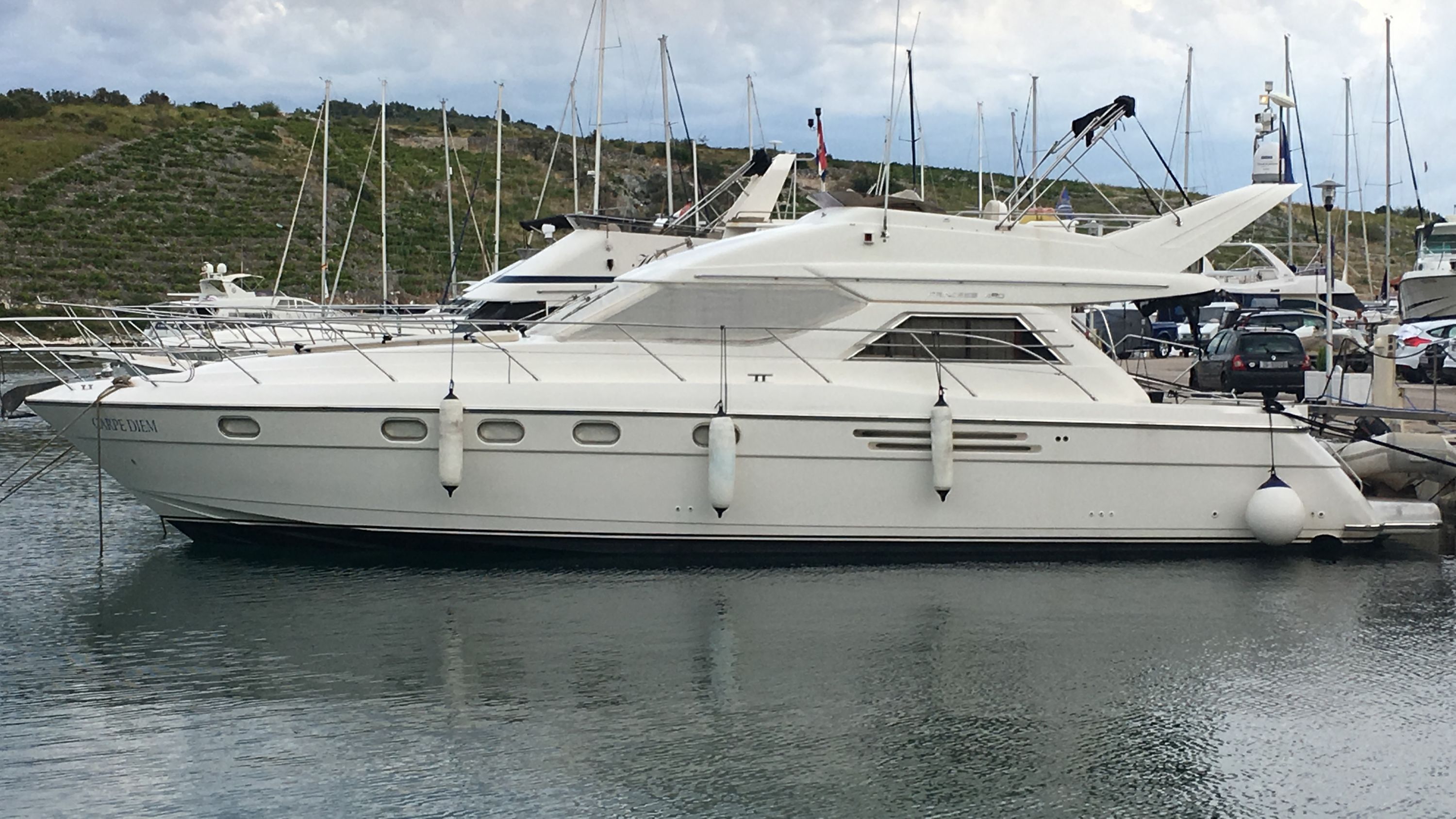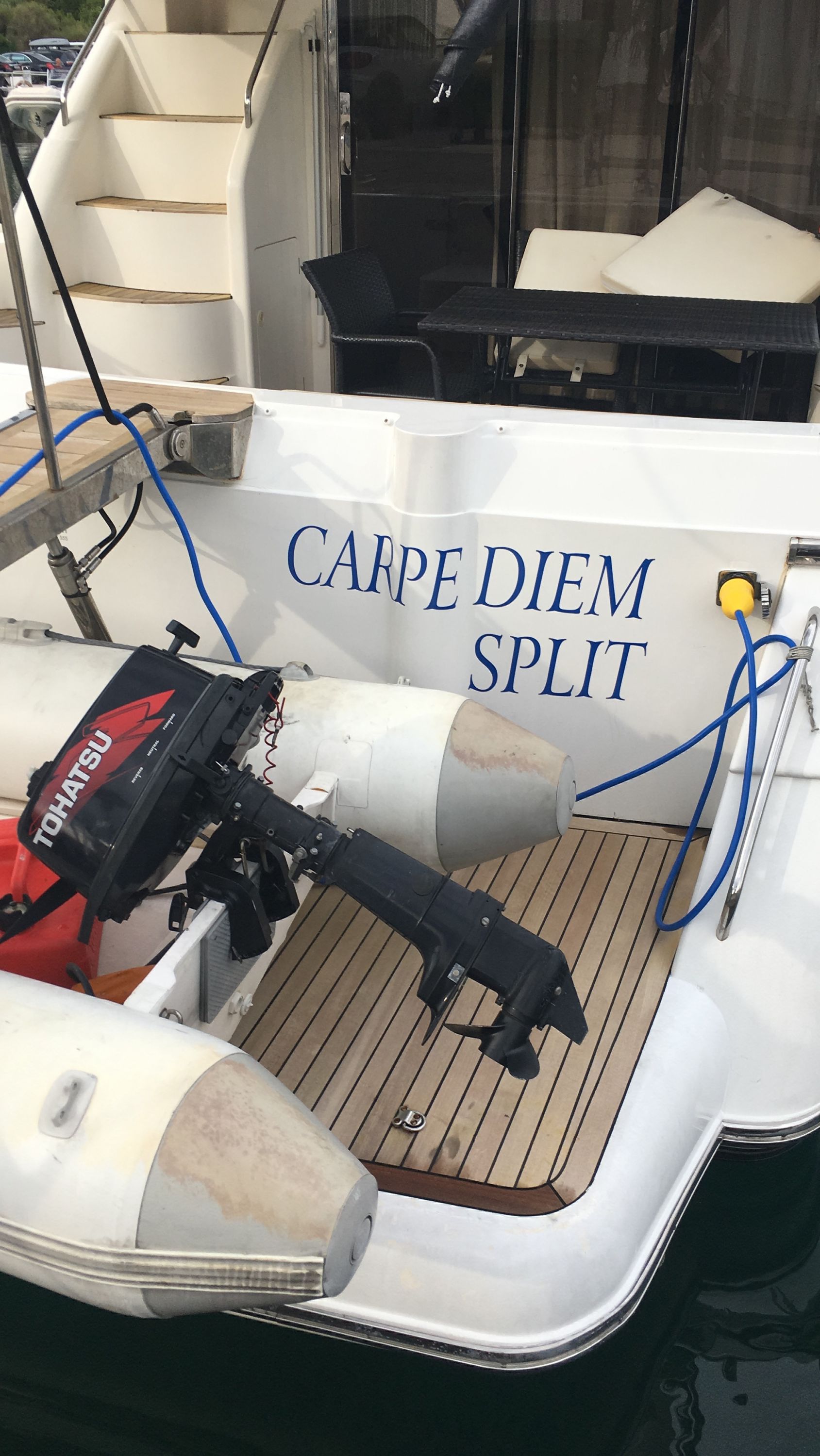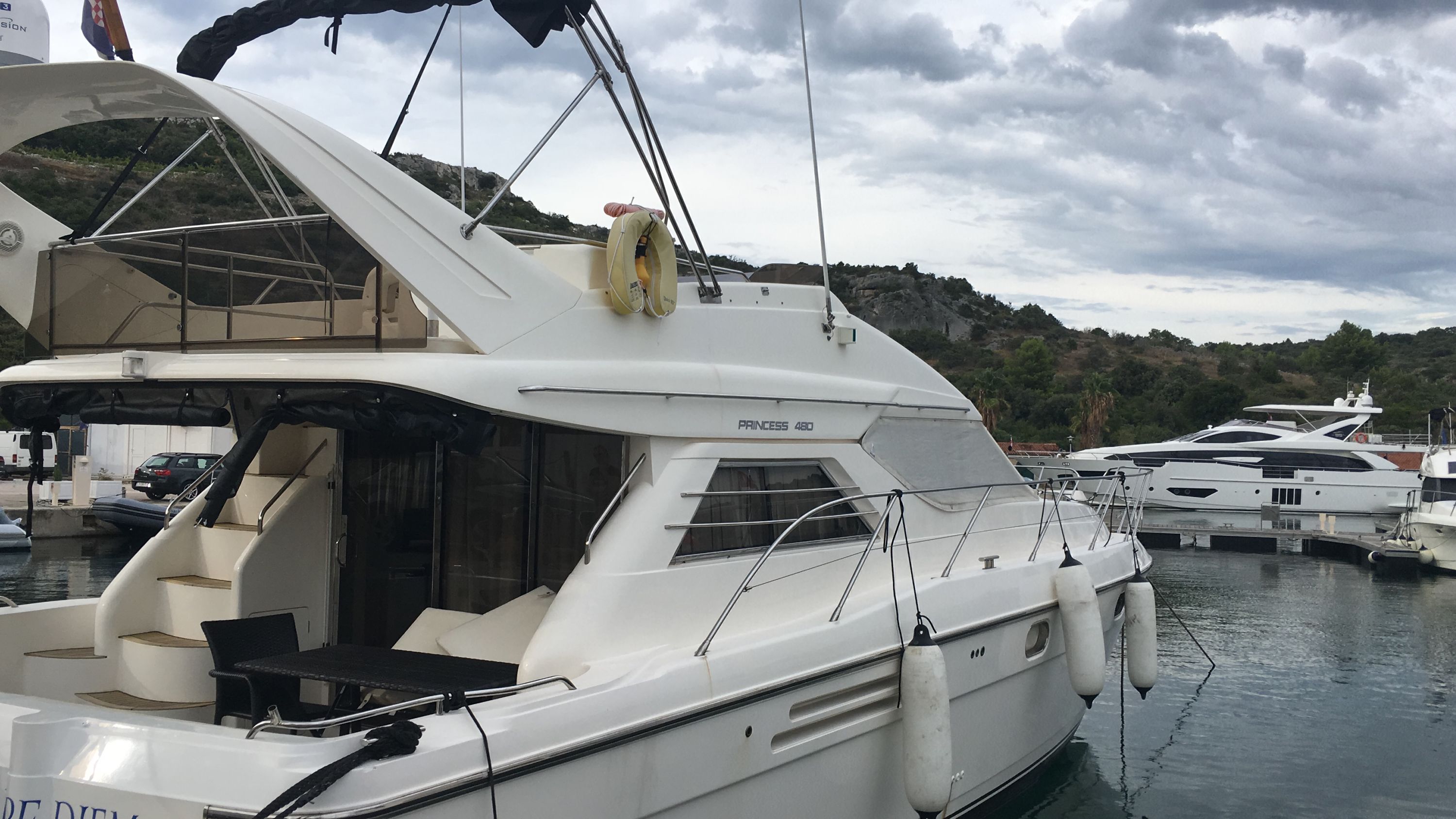 | Outside | 220 V-Landanschluss, Anker mit Kette, Badeleiter, Badeplattform, Biminitop, Cockpitdusche, elektr. Ankerwinsch, Fender, Festmacherleinen, Flybridge, hydraul. Gangway, Kühlschrank auf Flybridge, Sonnendeck |