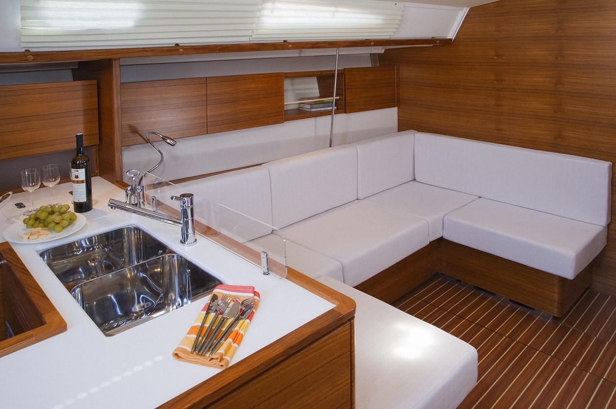 | Outside | Biminitop, Cockpitdusche, Cockpittisch, elektr. Ankerwinsch, Gangway, Sprayhood, Teak im Cockpit |