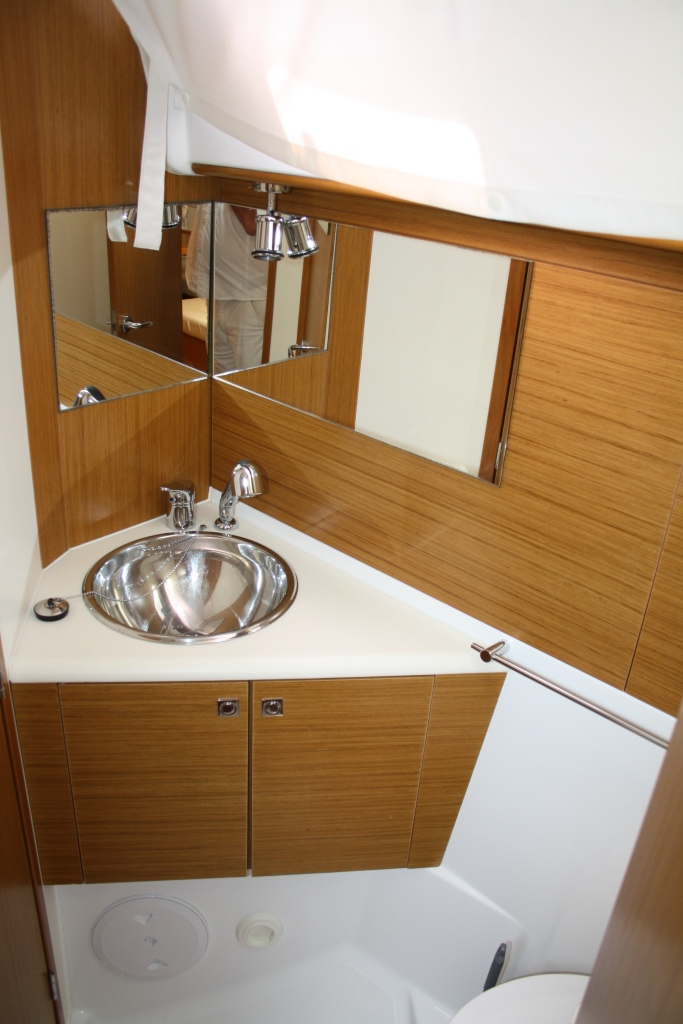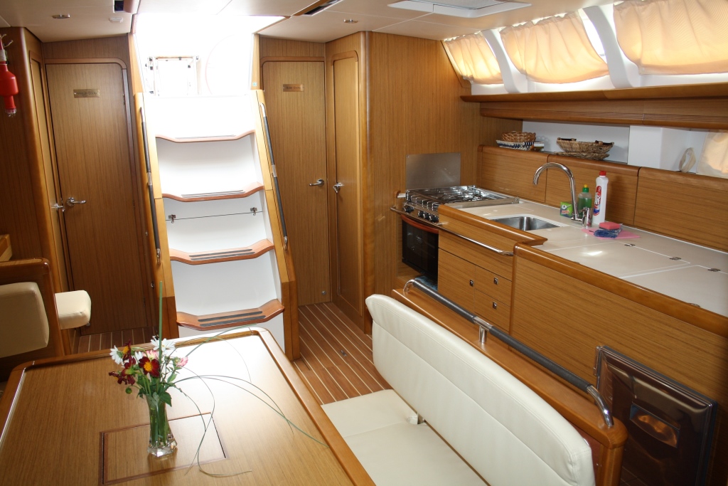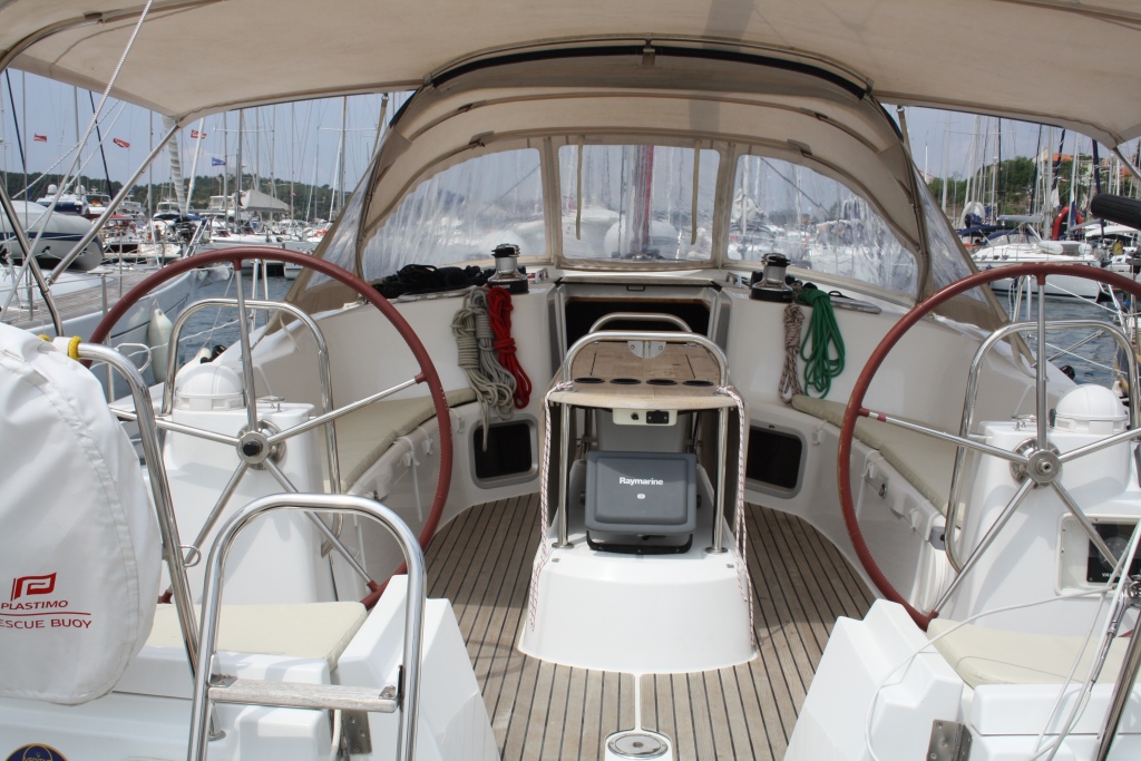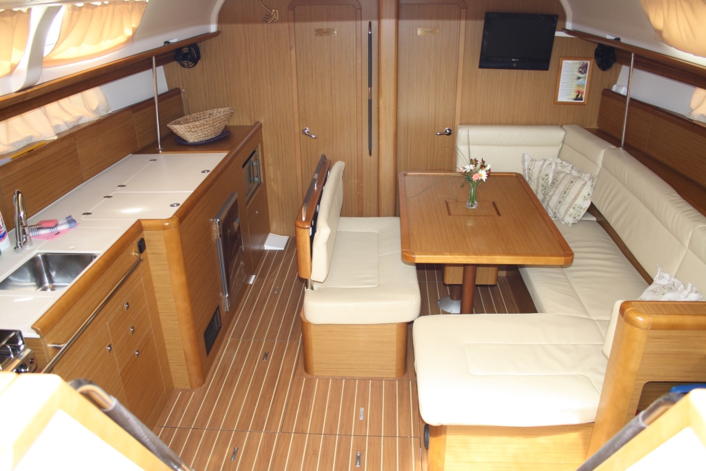 | Outside | 12 V-Anschluss, 220 V-Landanschluss, Anker mit Kette, Badeleiter, Biminitop, Cockpitdusche, Cockpitlautsprecher, Cockpittisch, elektr. Ankerwinsch, elektr. Winsch, Gangway, Heckdusche, Solaranlage, Sprayhood, Teakdeck, Treibanker, Windex |