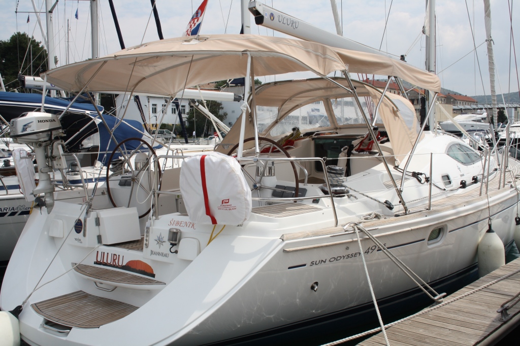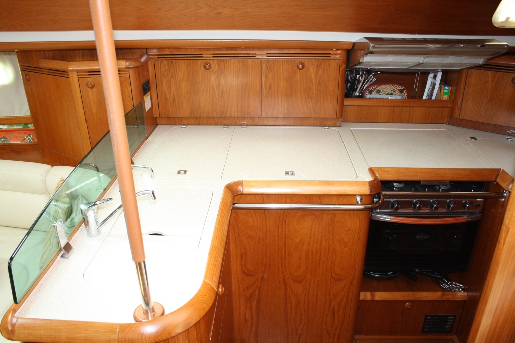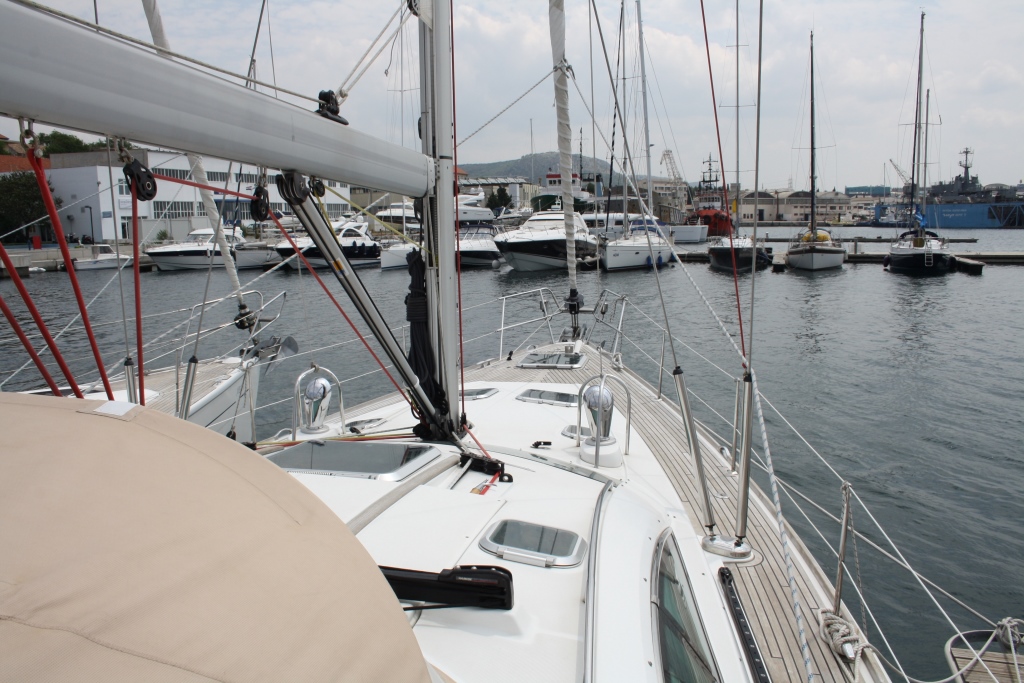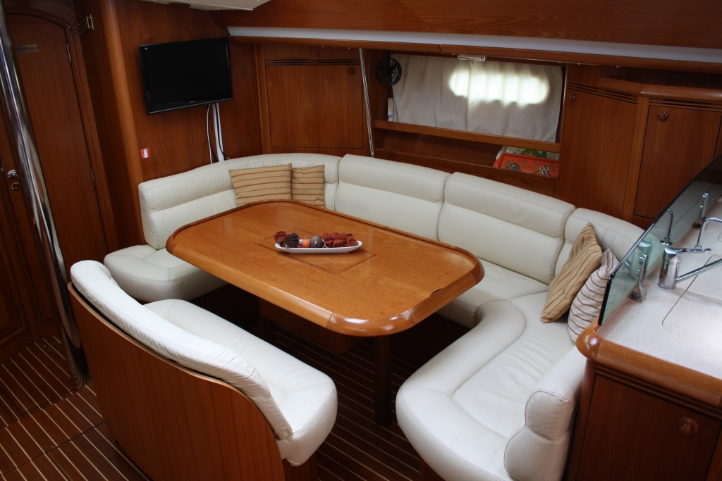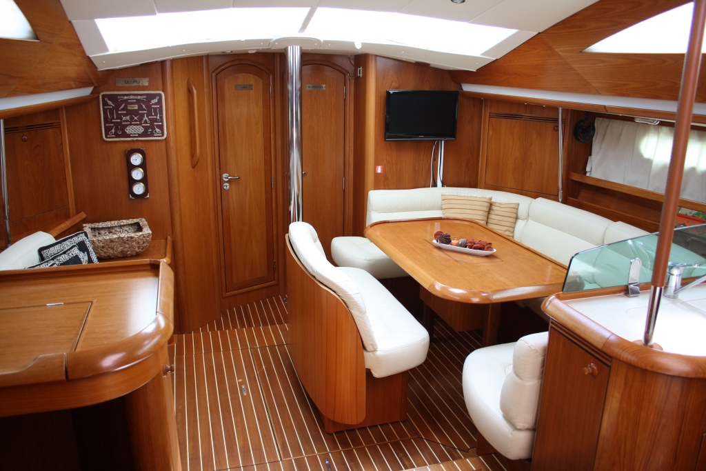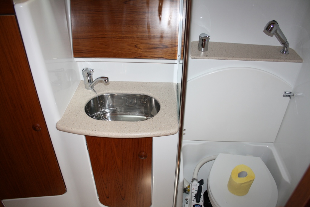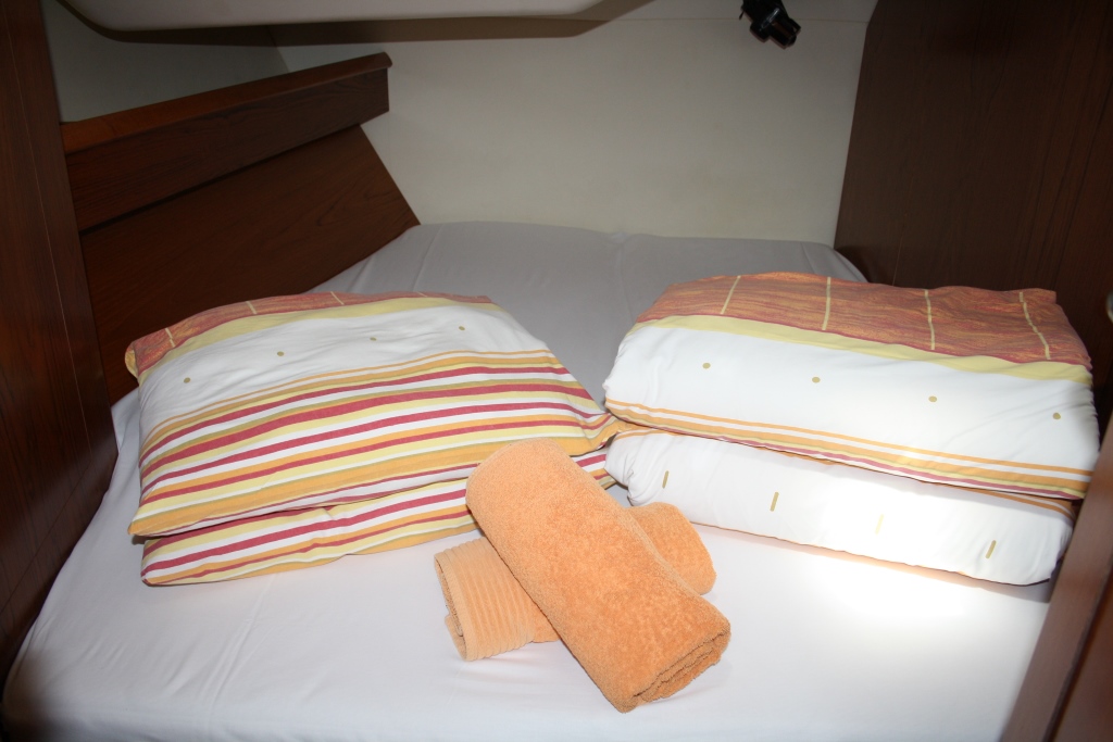 | Outside | 12 V-Anschluss, 220 V-Landanschluss, Anker mit Kette, Badeleiter, Biminitop, Cockpitdusche, Cockpitlautsprecher, Cockpittisch, elektr. Ankerwinsch, Gangway, Heckdusche, Solaranlage, Sprayhood, Teakdeck, Treibanker, Windex |