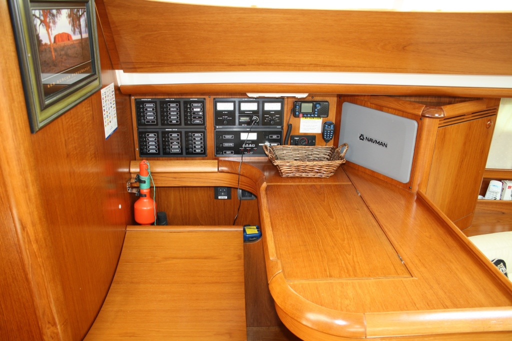 | Navigation | Barometer, Echolot, elektr. Seekarten, Fernglas, GPS mit Farbkartenplotter im Cockpit, Hafenhandbücher, Handpeilkompass, Kartenplotter im Salon, Kompass, Seekarten, Sumlog, Windmesser |