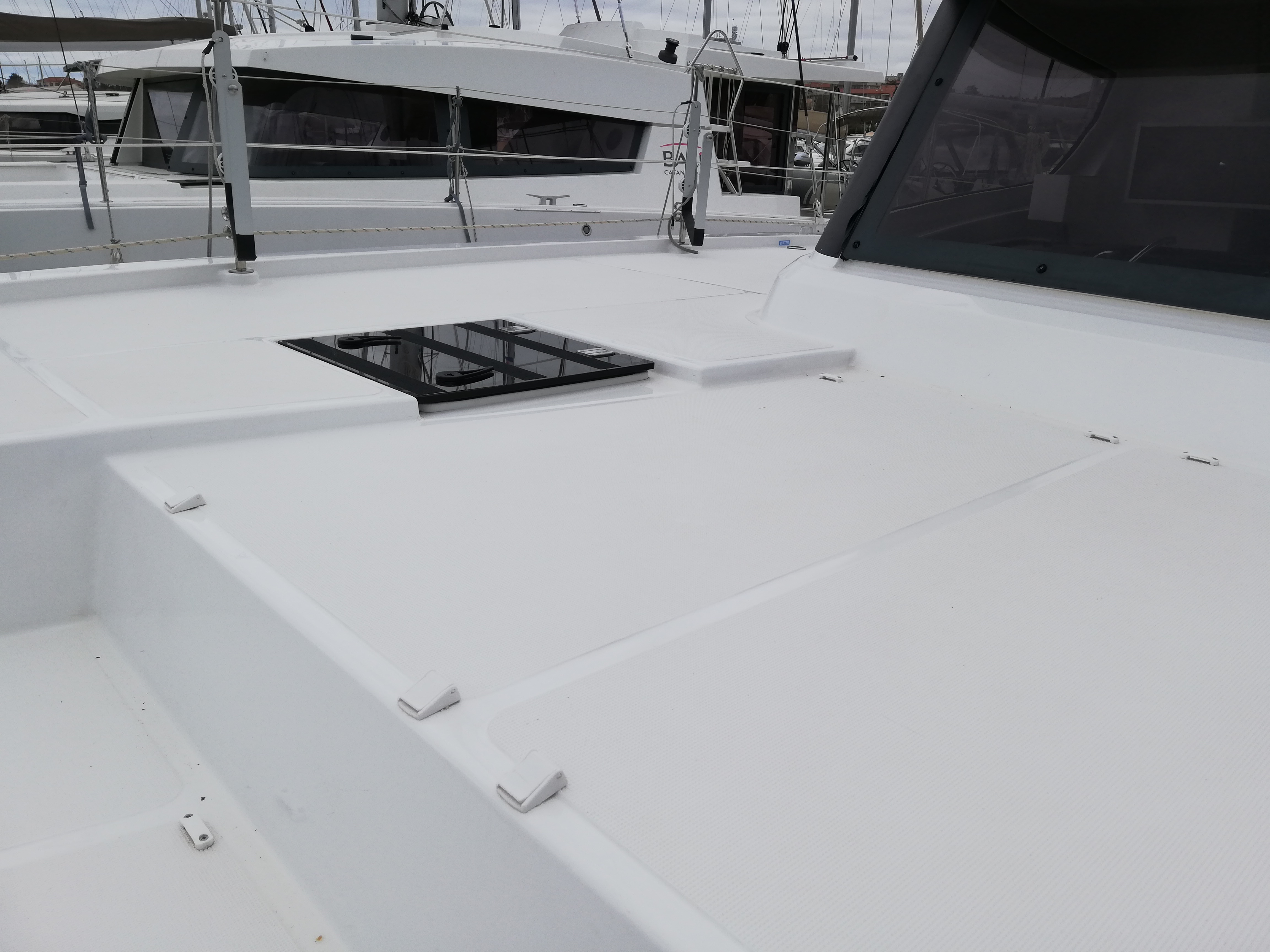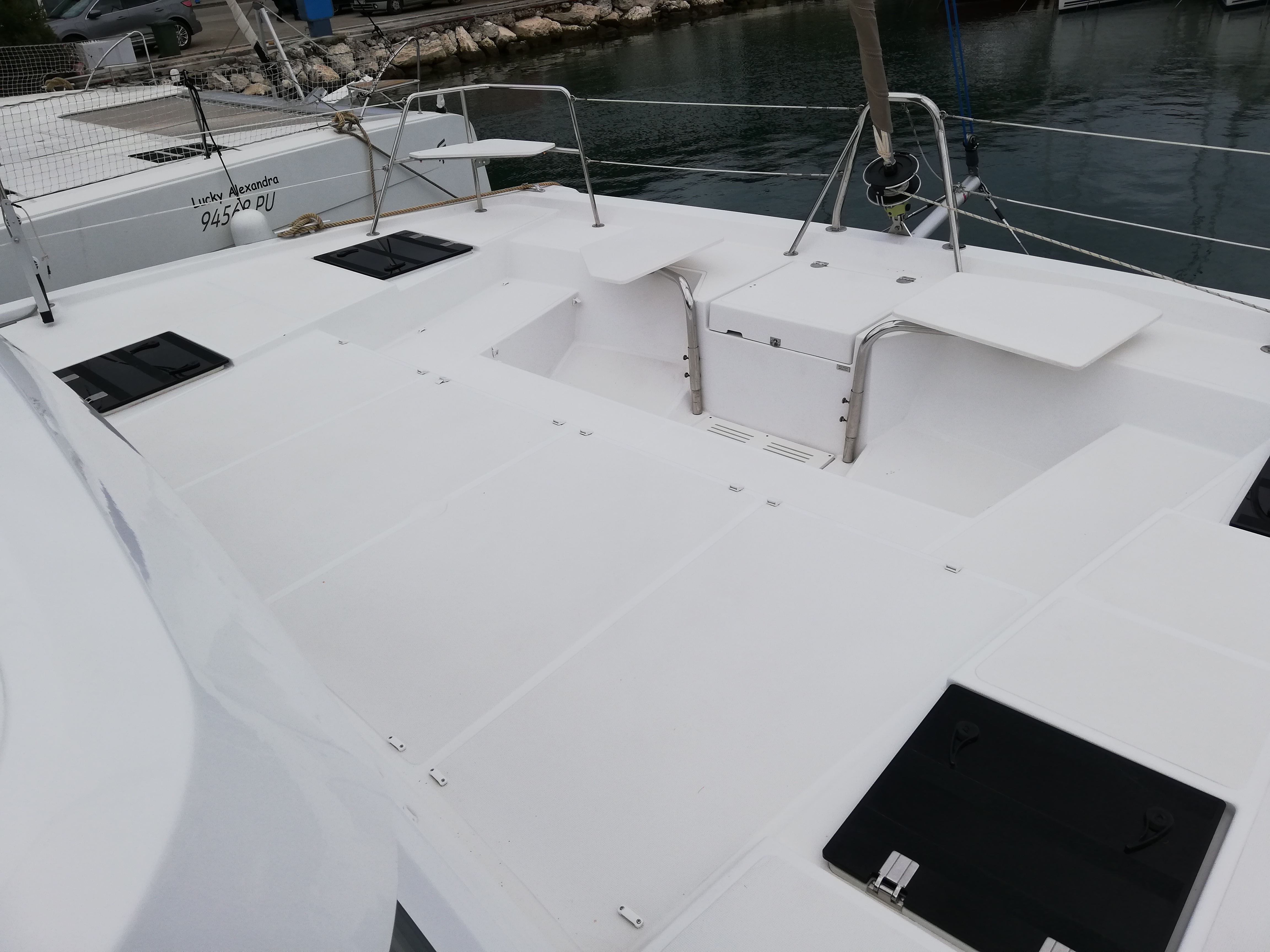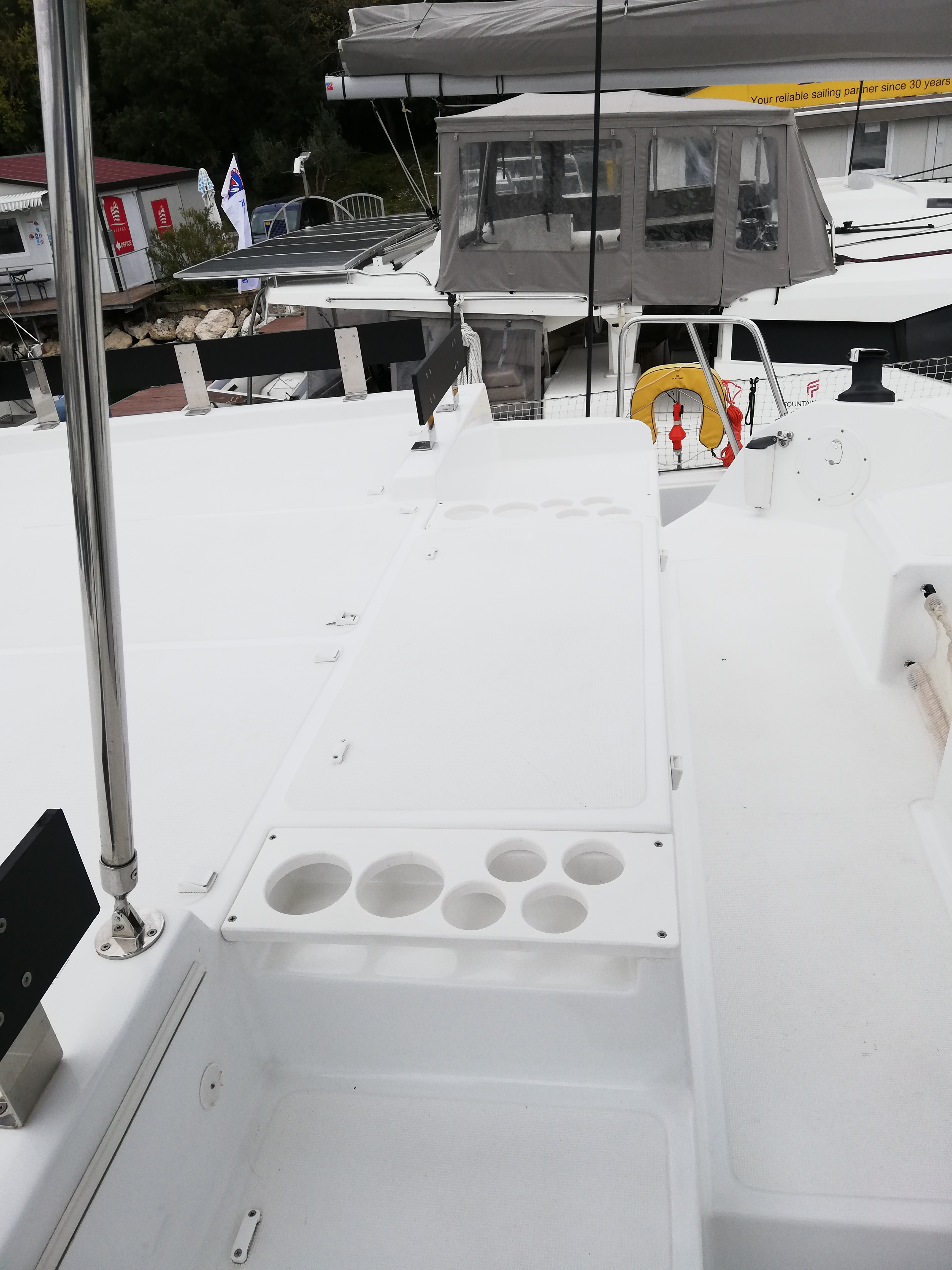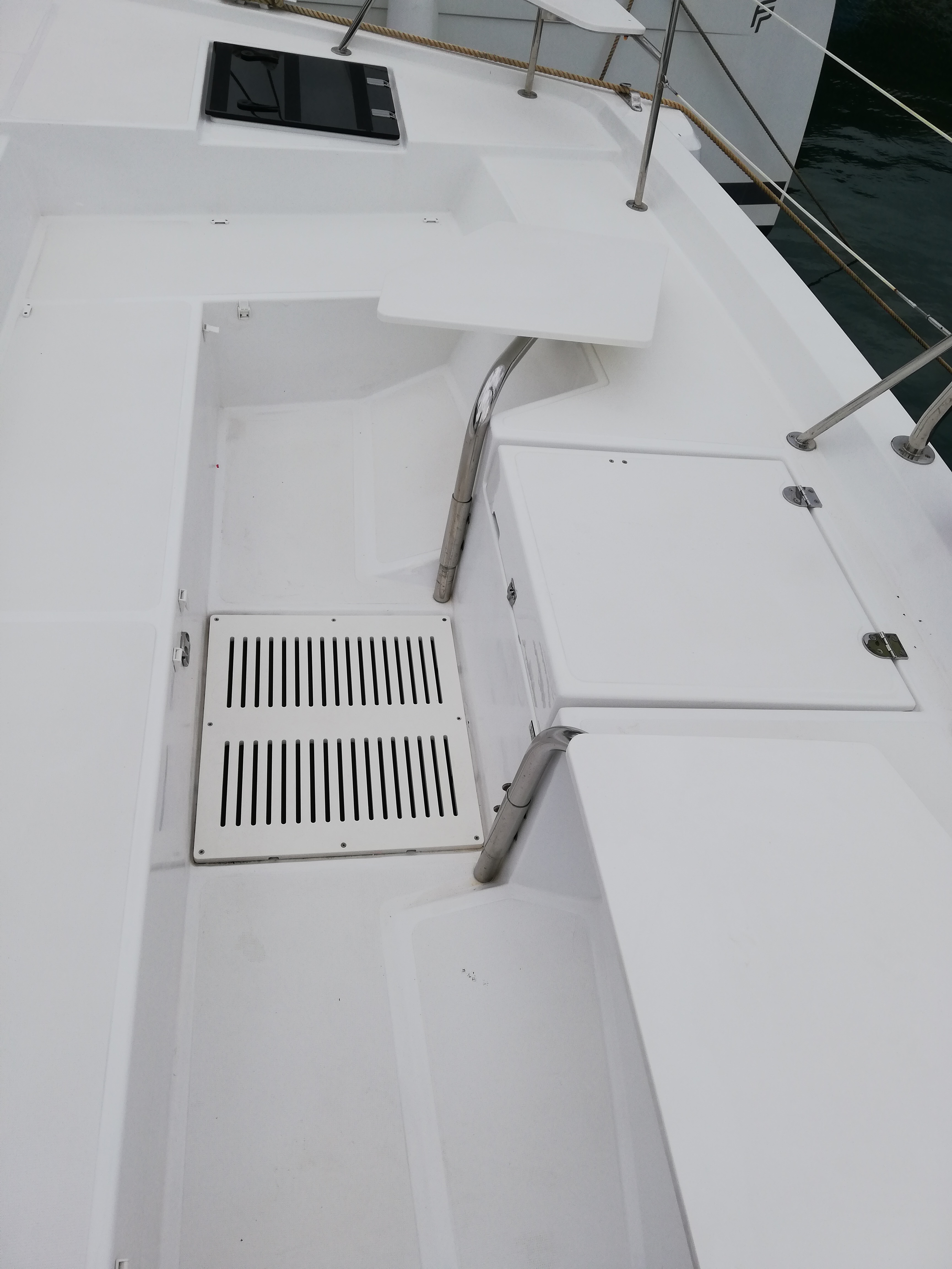 | Outside | 220 V-Landanschluss, Badeplattform, Biminitop, Cockpitdusche, Cockpitlautsprecher, Cockpitpolster, Cockpittisch, Delta-Anker, elektr. Ankerwinsch, Gangway, Gas-Barbecue-Grill im Cockpit, Solaranlage |
