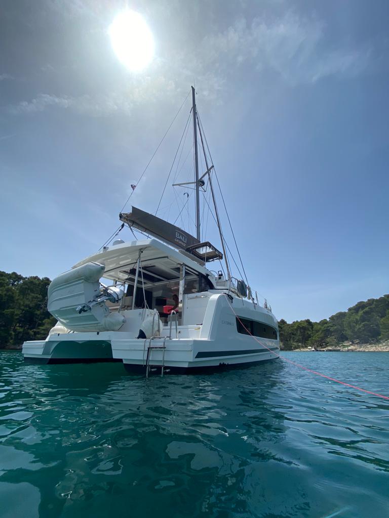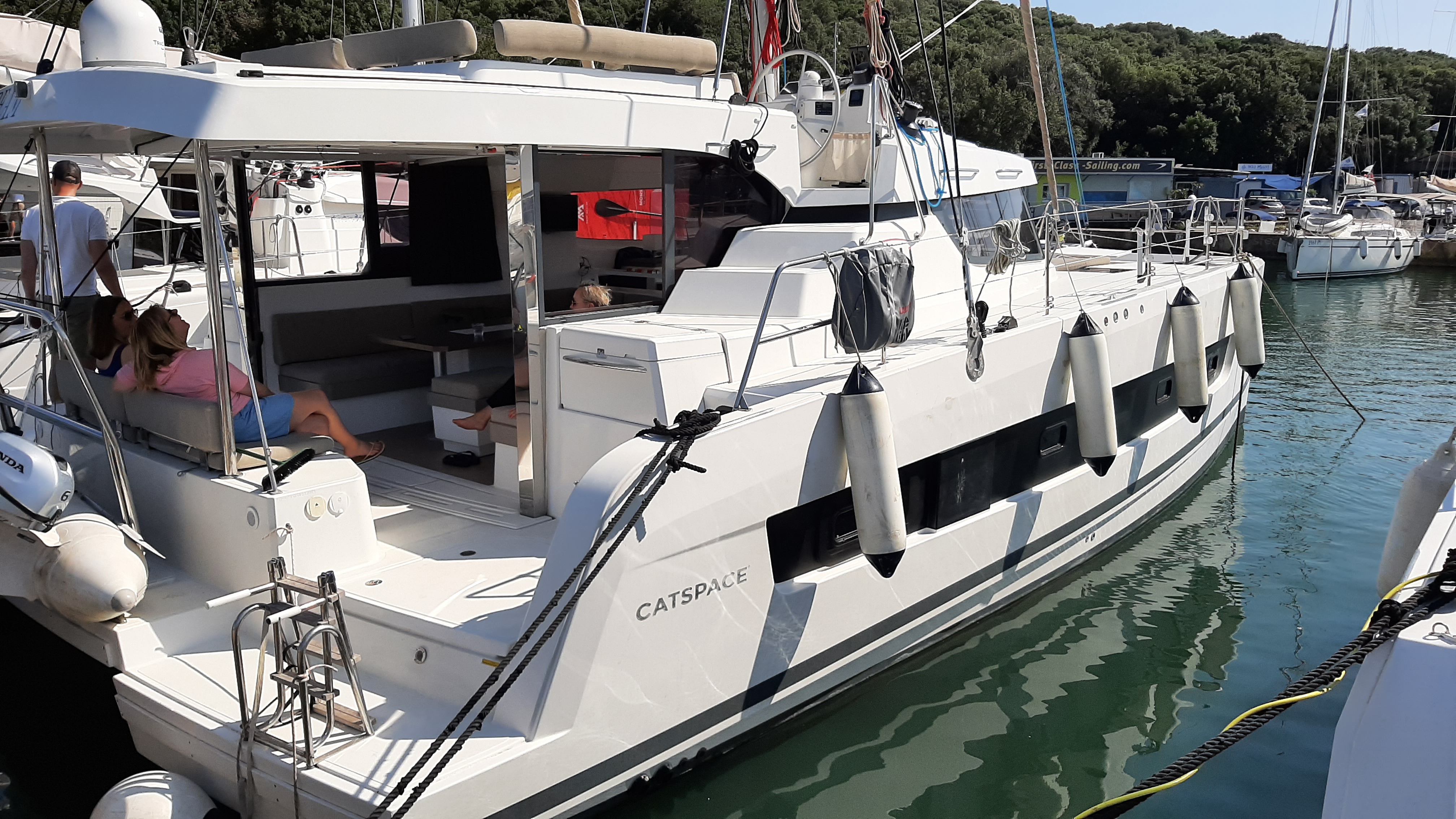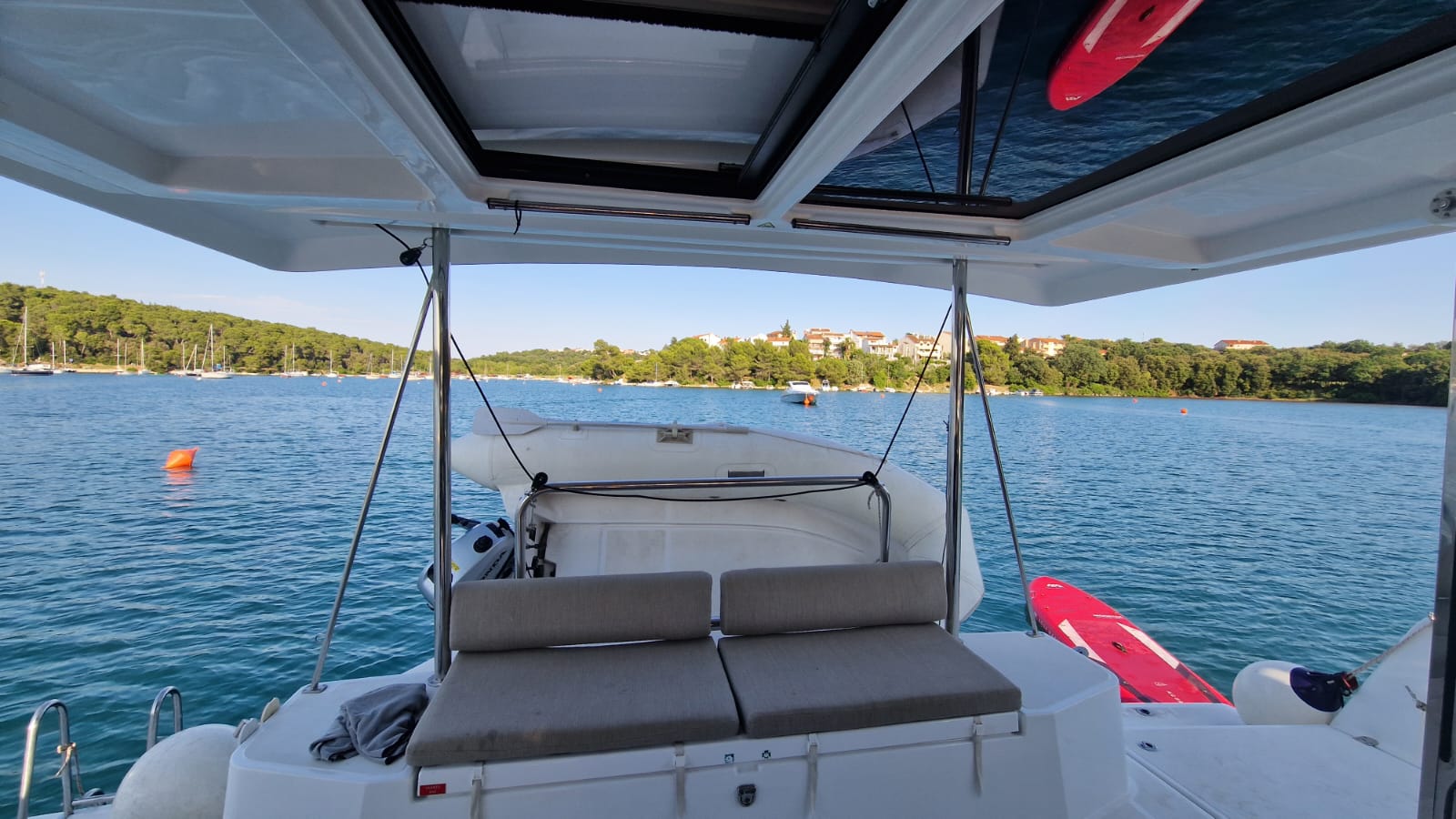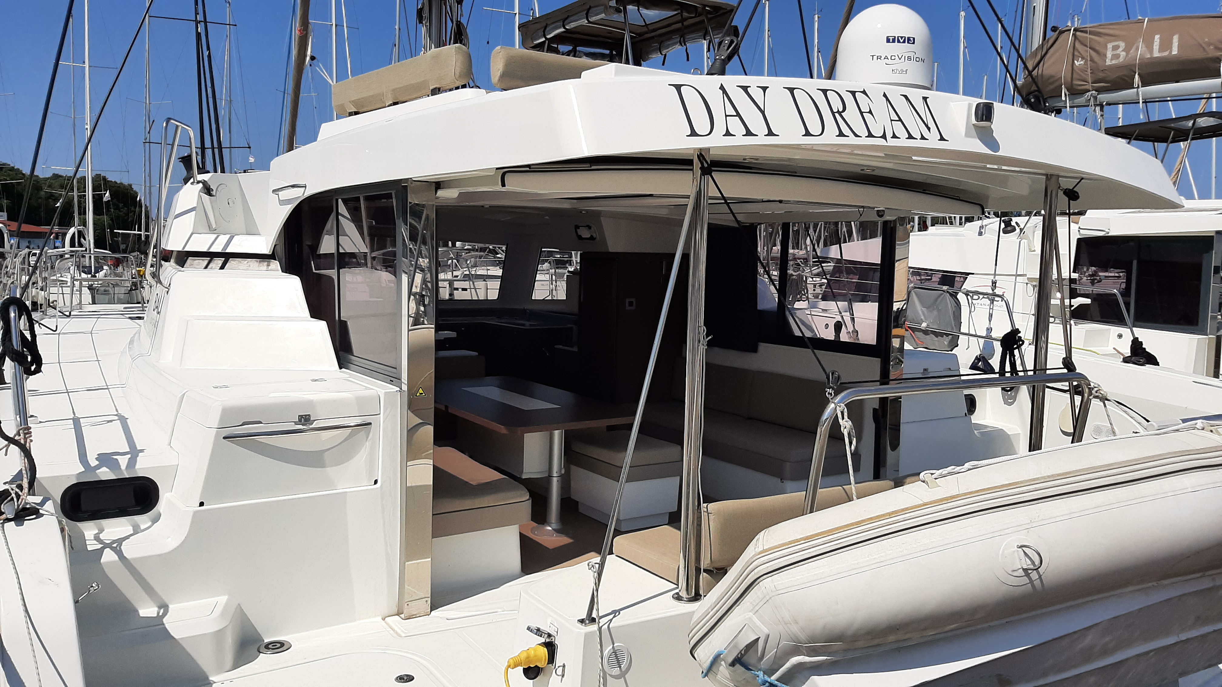 | Outside | 220 V-Landanschluss, Badeplattform, Biminitop, Cockpitdusche, Cockpitlautsprecher, Cockpitpolster, Cockpittisch, Delta-Anker, elektr. Ankerwinsch, Gangway, Gas-Barbecue-Grill im Cockpit, Solaranlage |