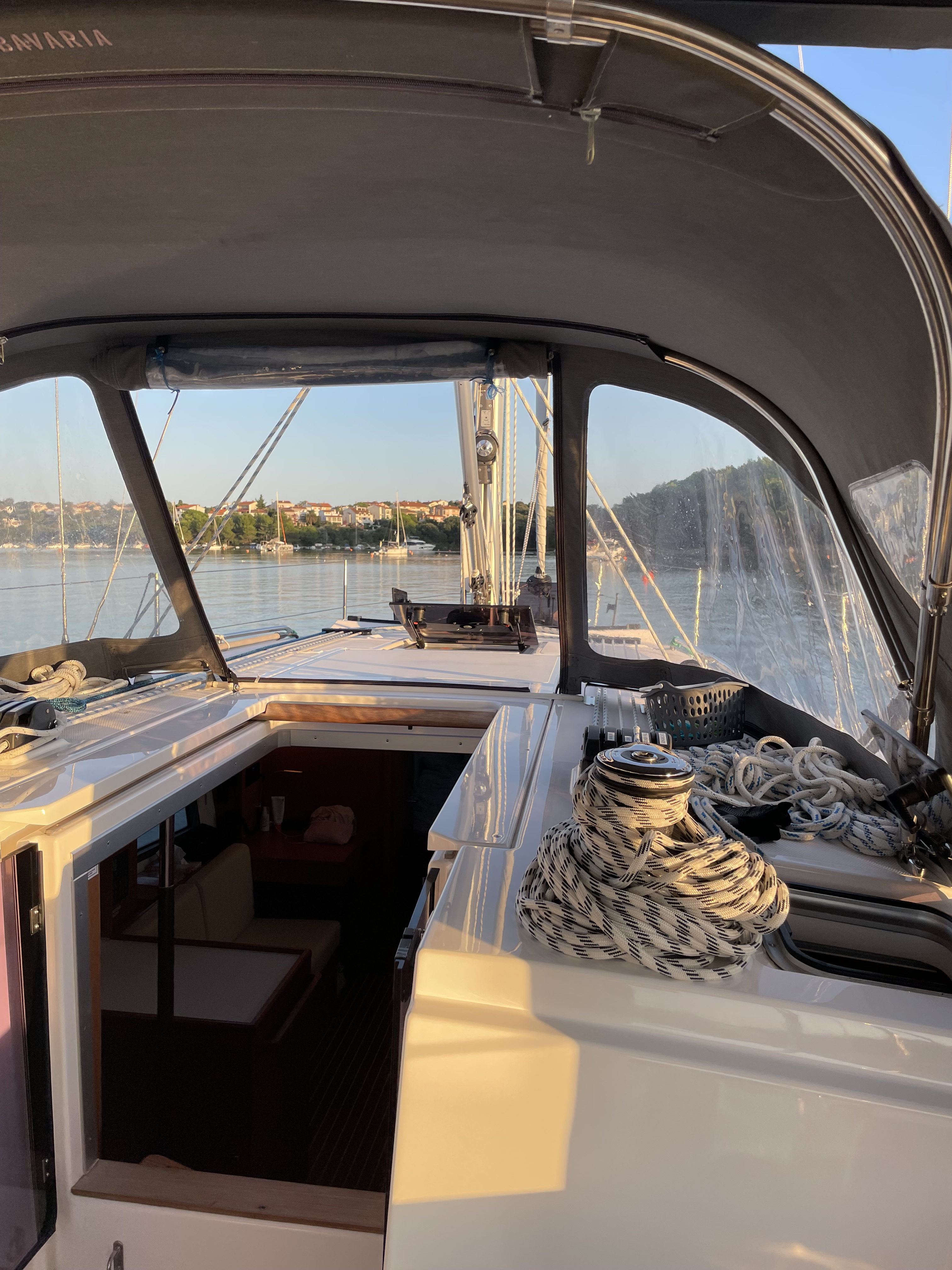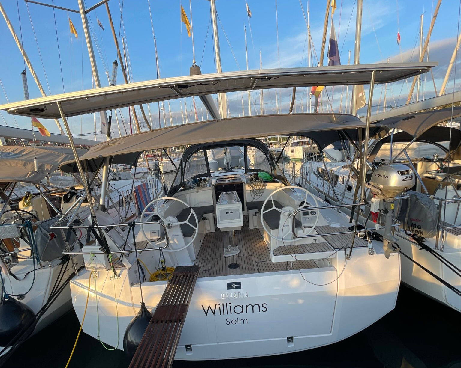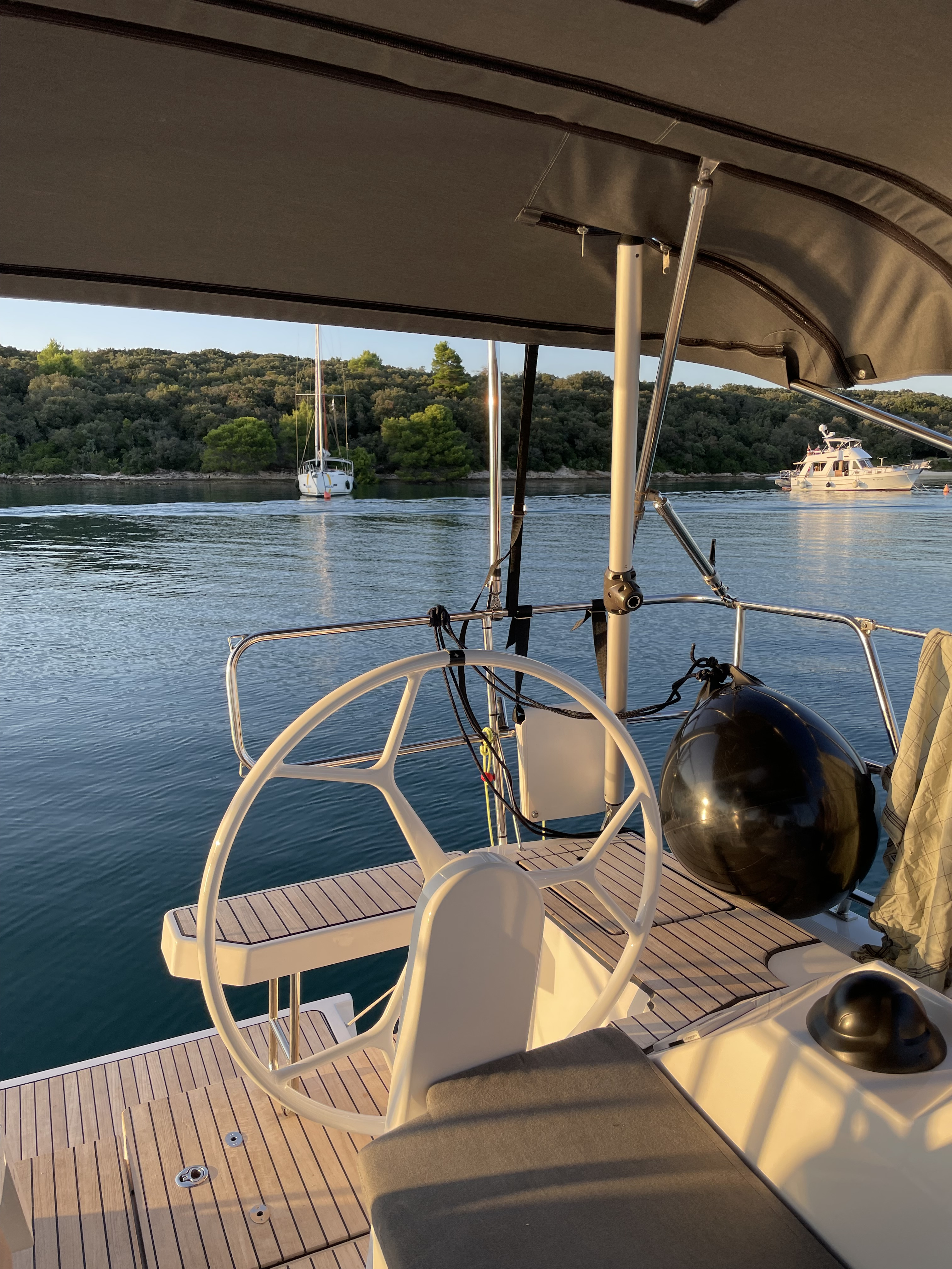| Outside | 12 V-Anschluss, 220 V-Landanschluss, Anker mit Kette, Badeleiter, Badeplattform, Biminitop, Bootshaken, Cockpitdusche, Cockpitpolster, Cockpittisch, Deckbürste, elektr. Ankerwinsch, Faltpropeller, Fender, Gangway, Lifeline System, Solaranlage, Sprayhood, Teak auf Badeplattform, Teak im Cockpit, Windex |