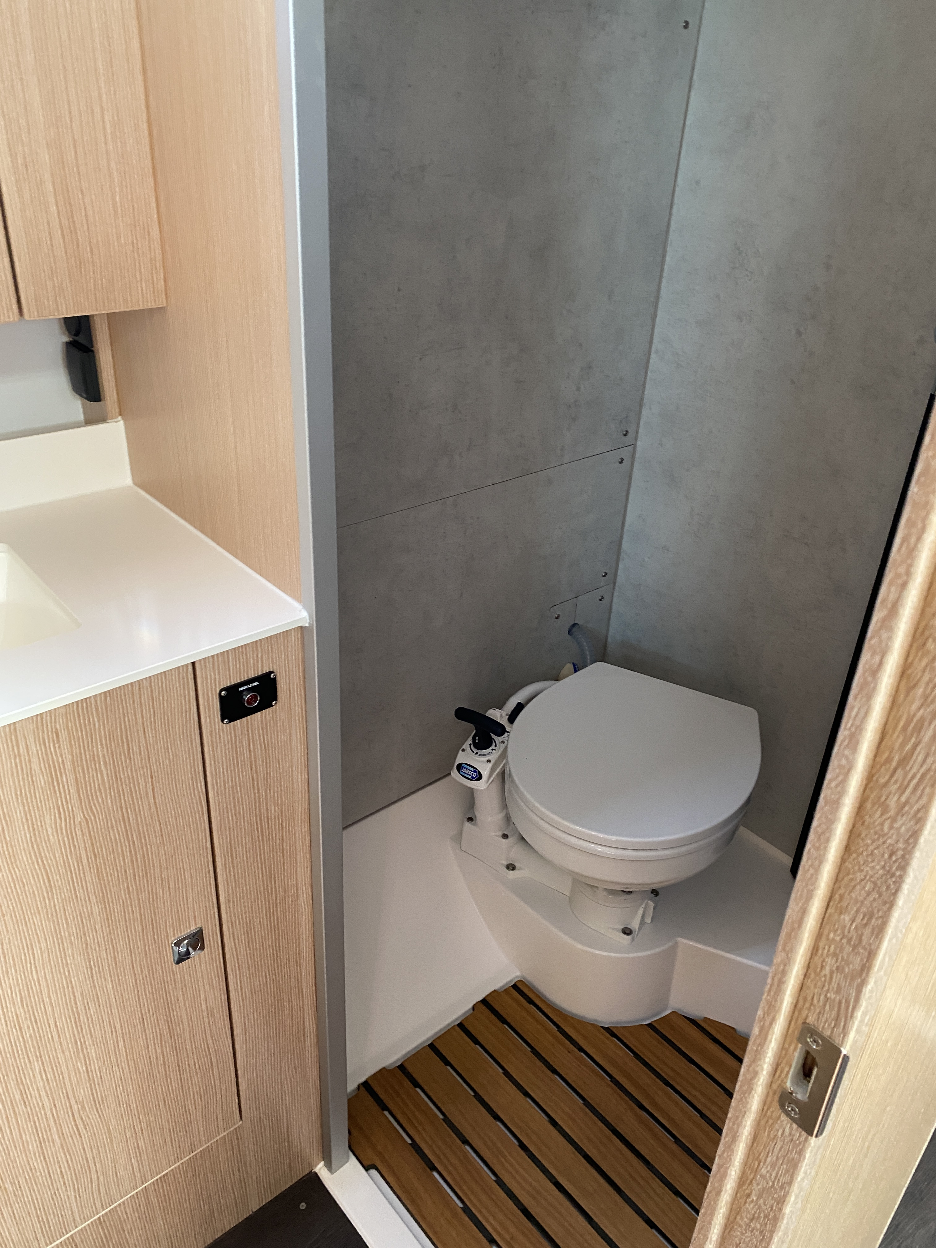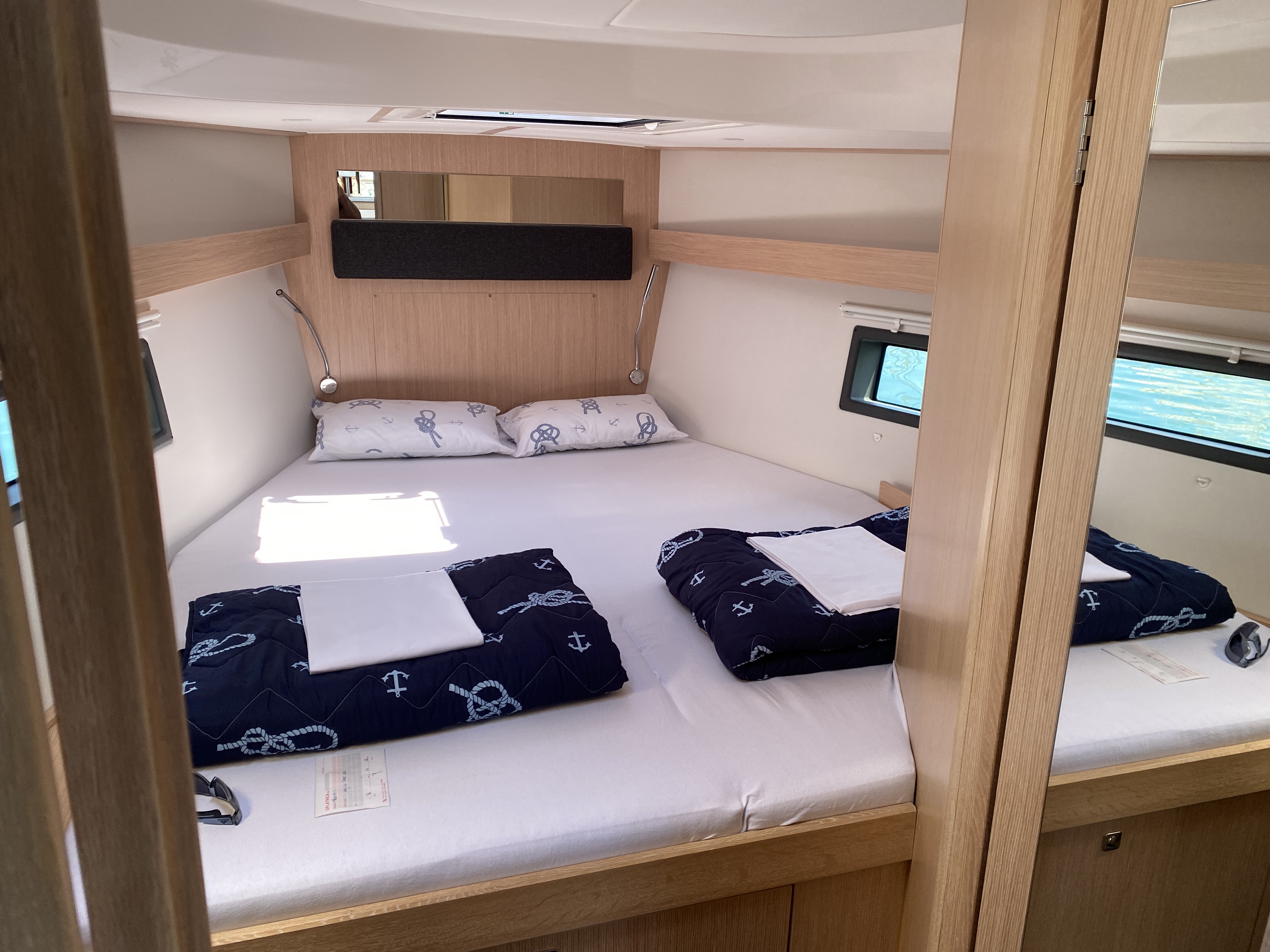 | Inside | 2. Kühlschrank, Borduhr, FUSION Sound System, Heizung, Inverter 12V/220V, Klimaanlage, Kühlschrank, Ladegerät, Luftpumpe für Beiboot, Pantryausstattung, Radio, Salontisch absenkbar, USB Steckdosen in den Kabinen, Warmwasser |