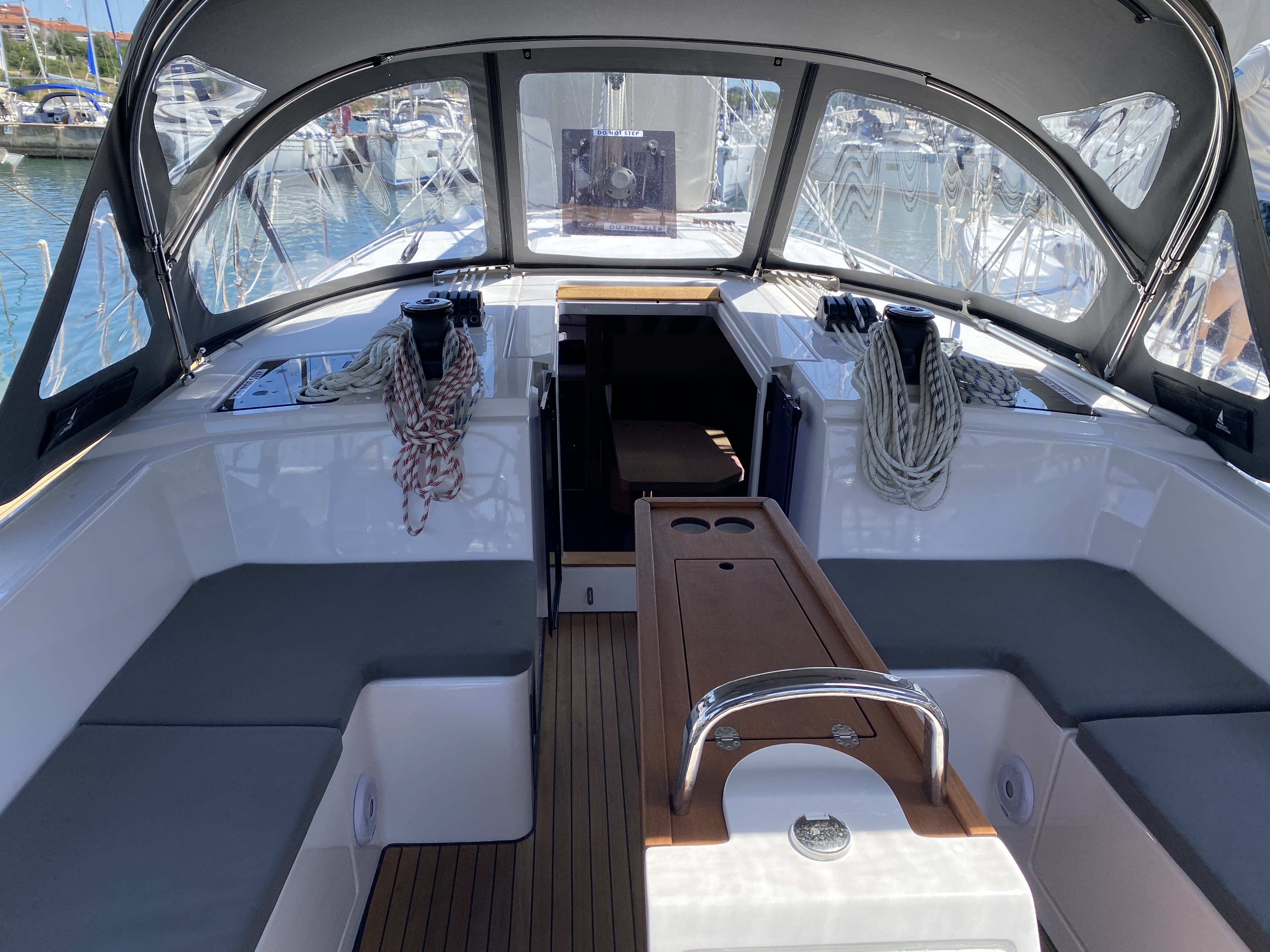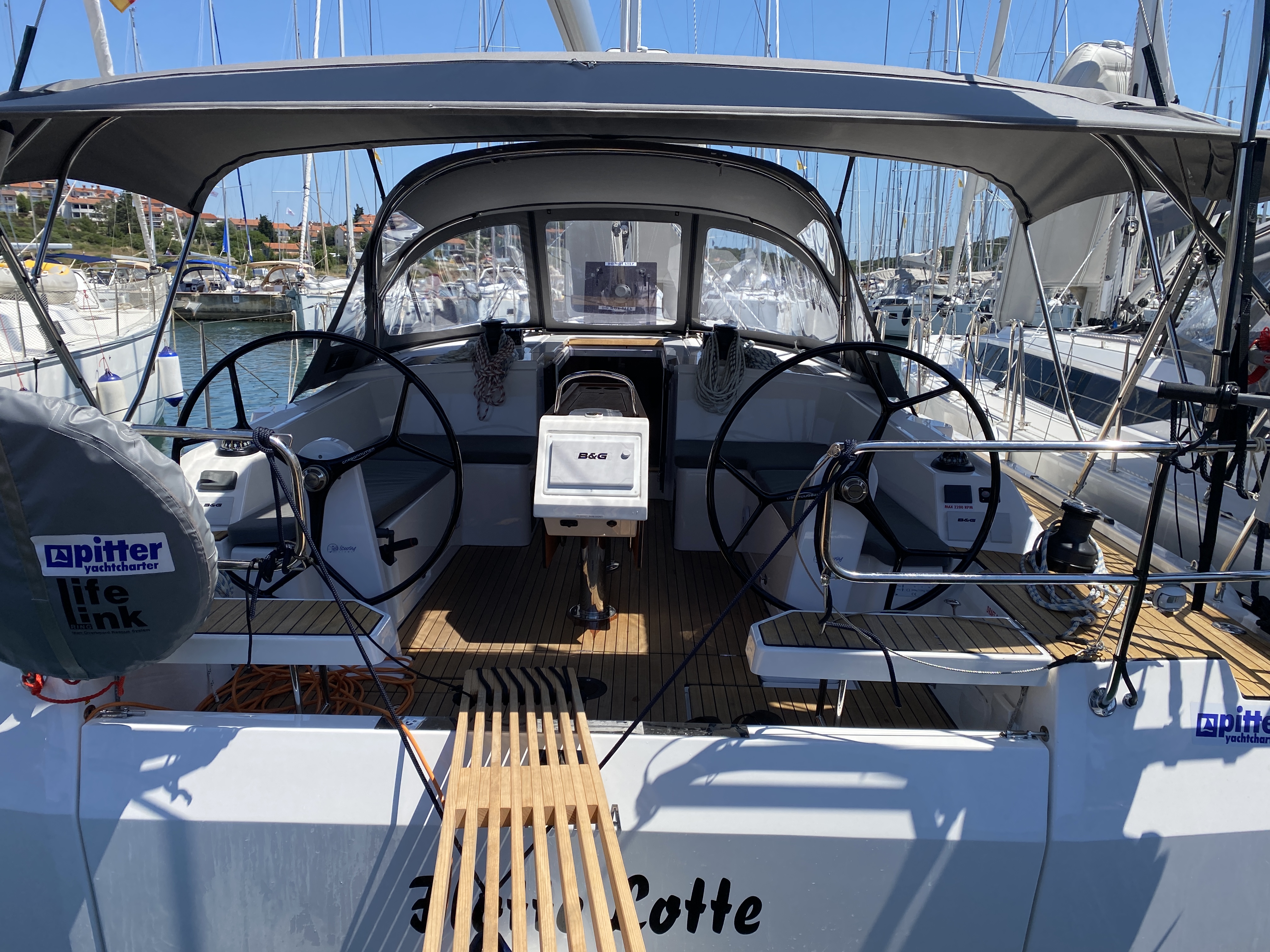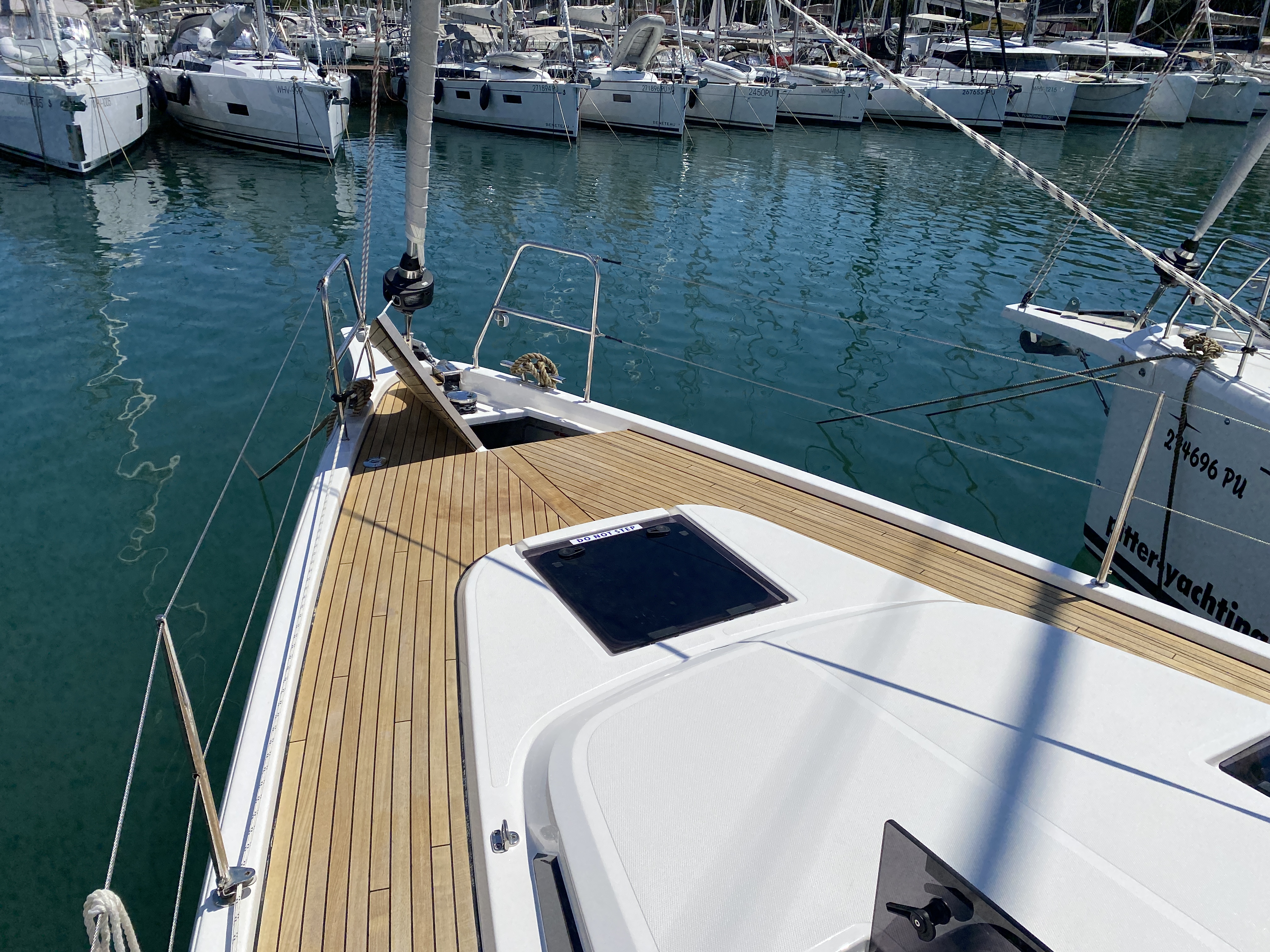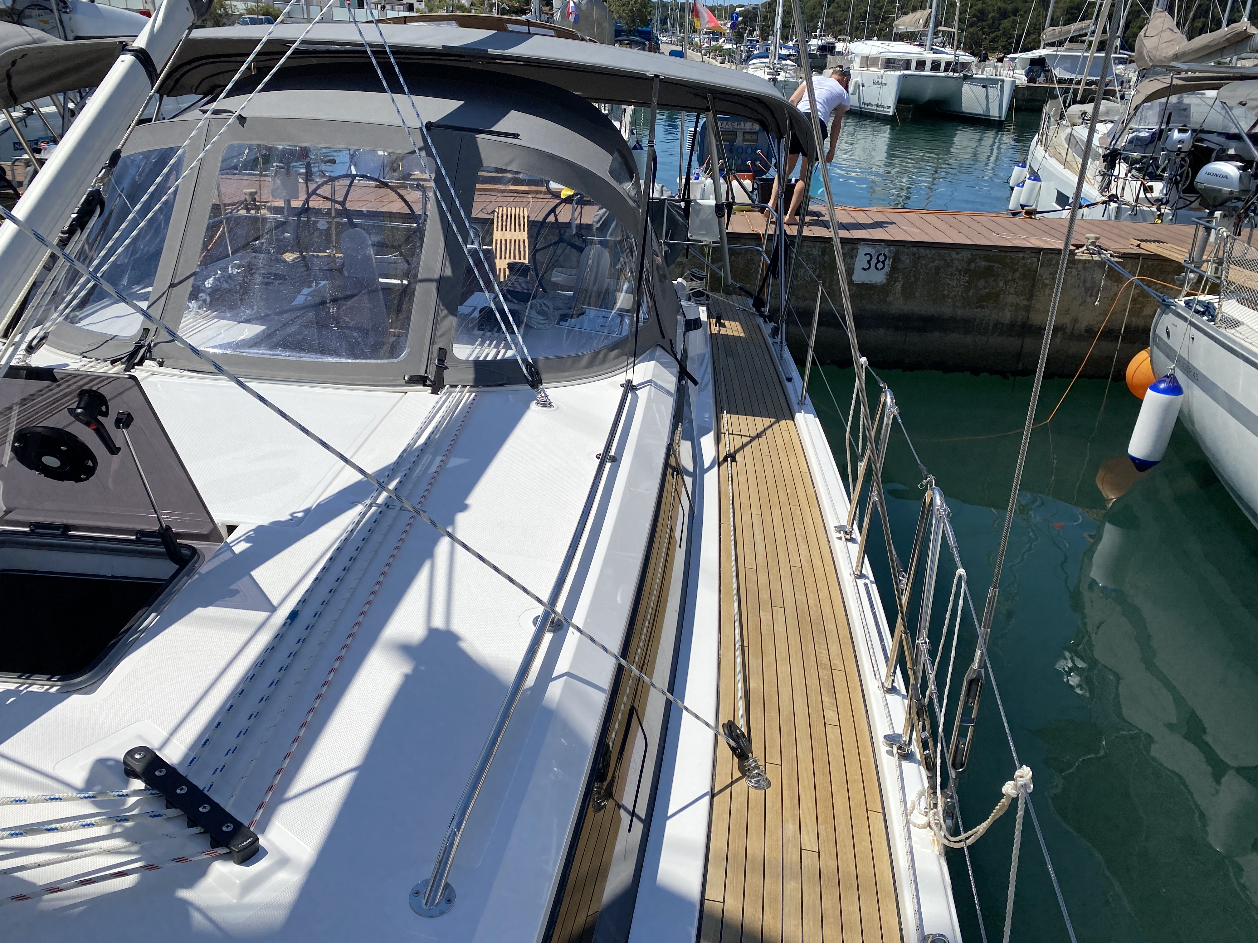 | Outside | 220 V-Landanschluss, Anker mit Kette, Ankerwinsch, Biminitop, Bootshaken, Cockpitdusche, Cockpitlautsprecher, Cockpitpolster, Cockpittisch, Dieselkanister , elektr. Ankerwinsch, Fender, Festmacherleinen, Gangway, Kugelfender, Kunststoff-Eimer (Pütz), Solaranlage, Sprayhood, Teak im Cockpit, Teakdeck, Wantenschneider, Wasserkanister , Wasserschlauch |