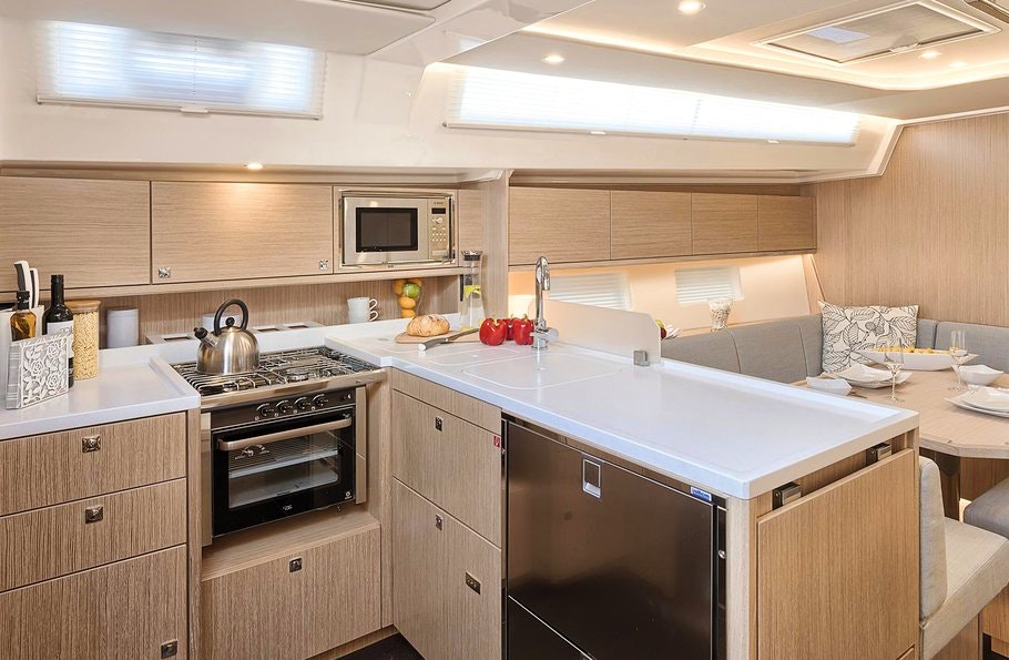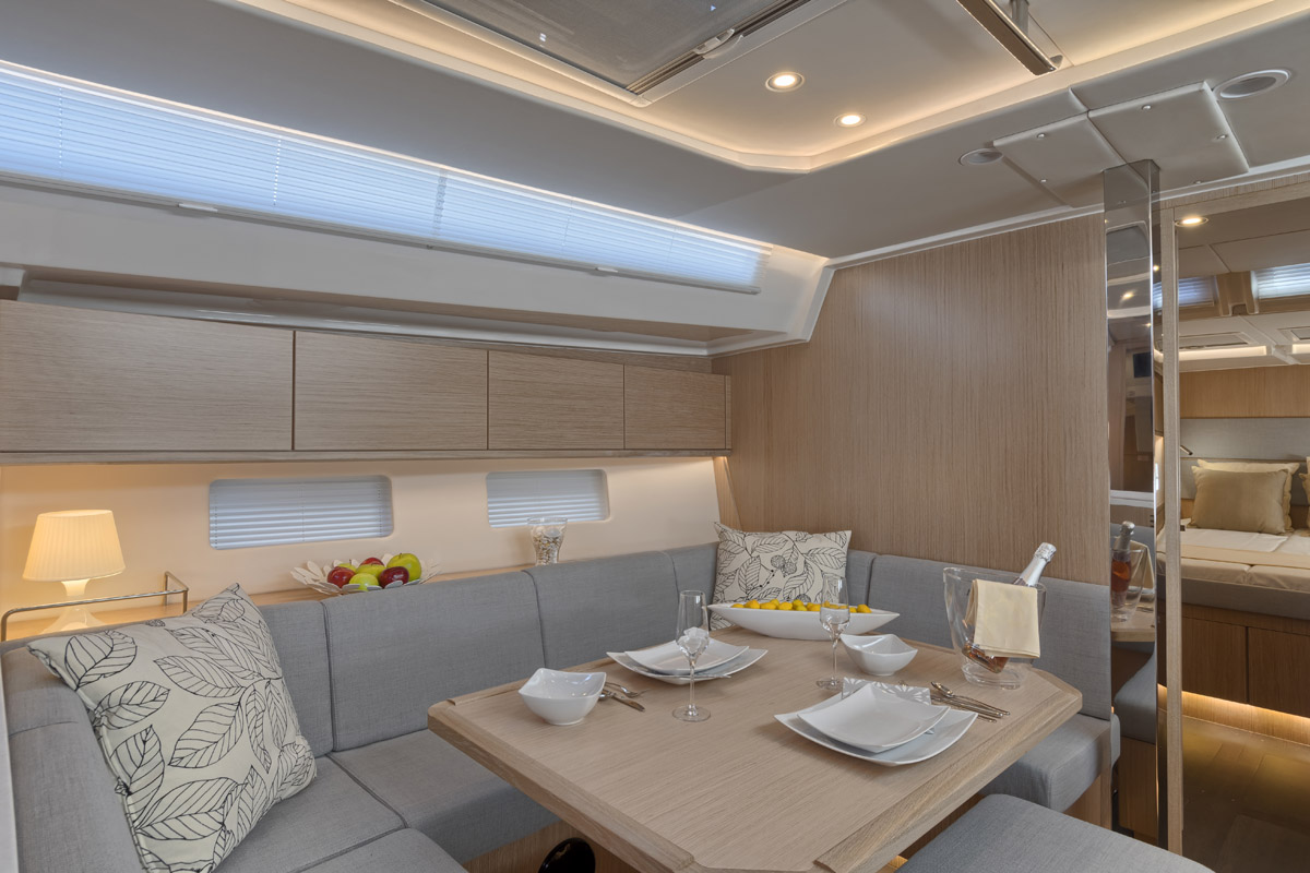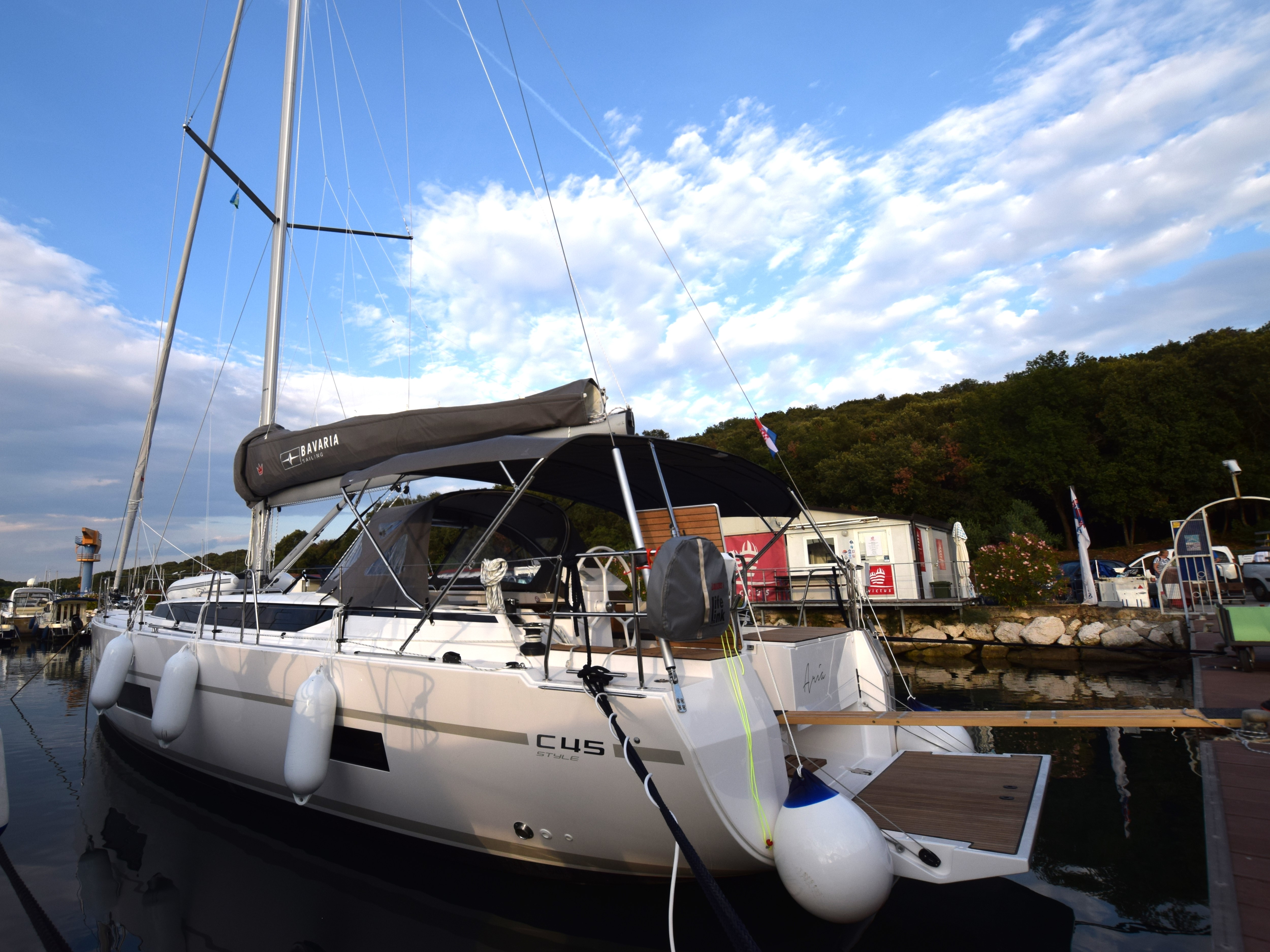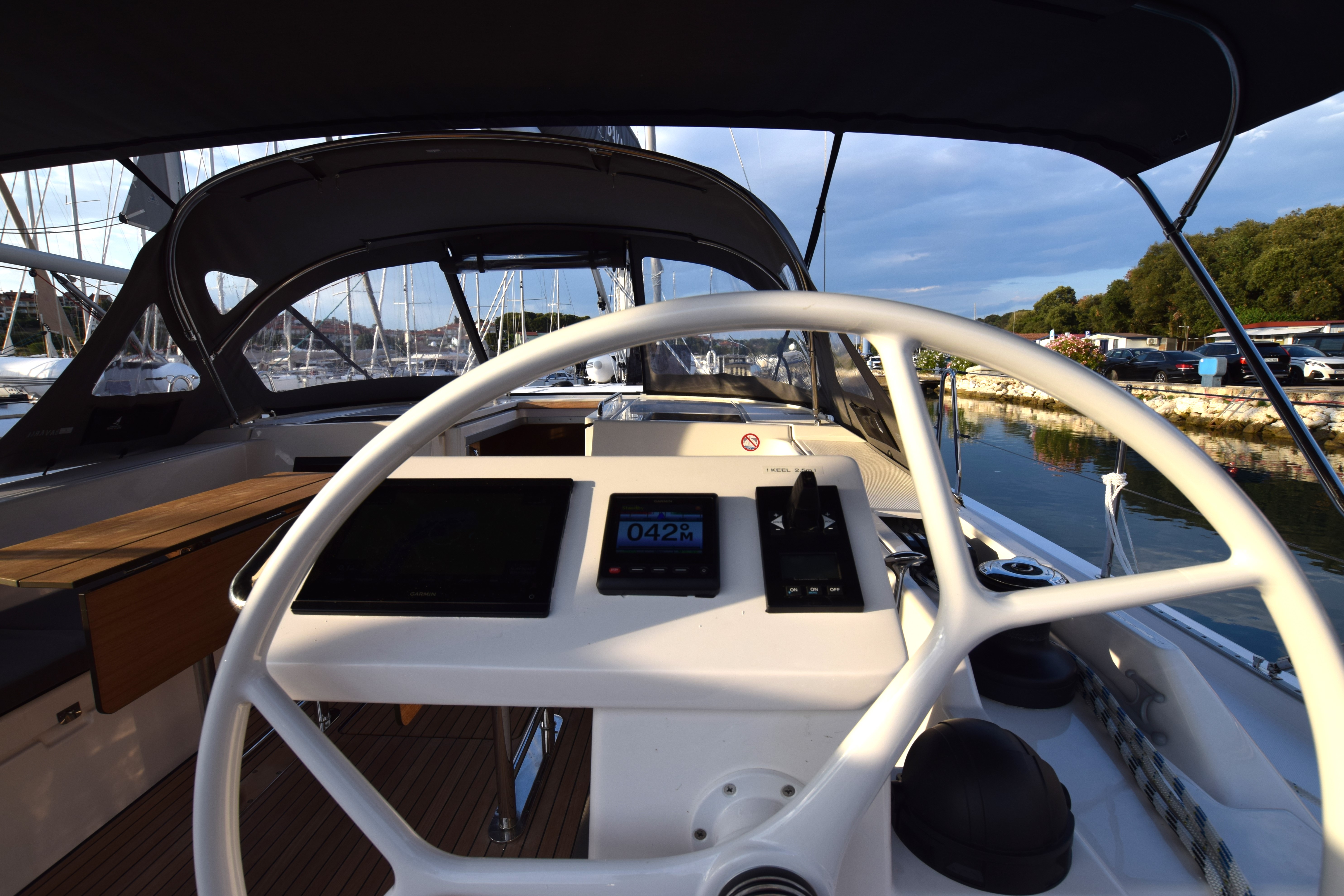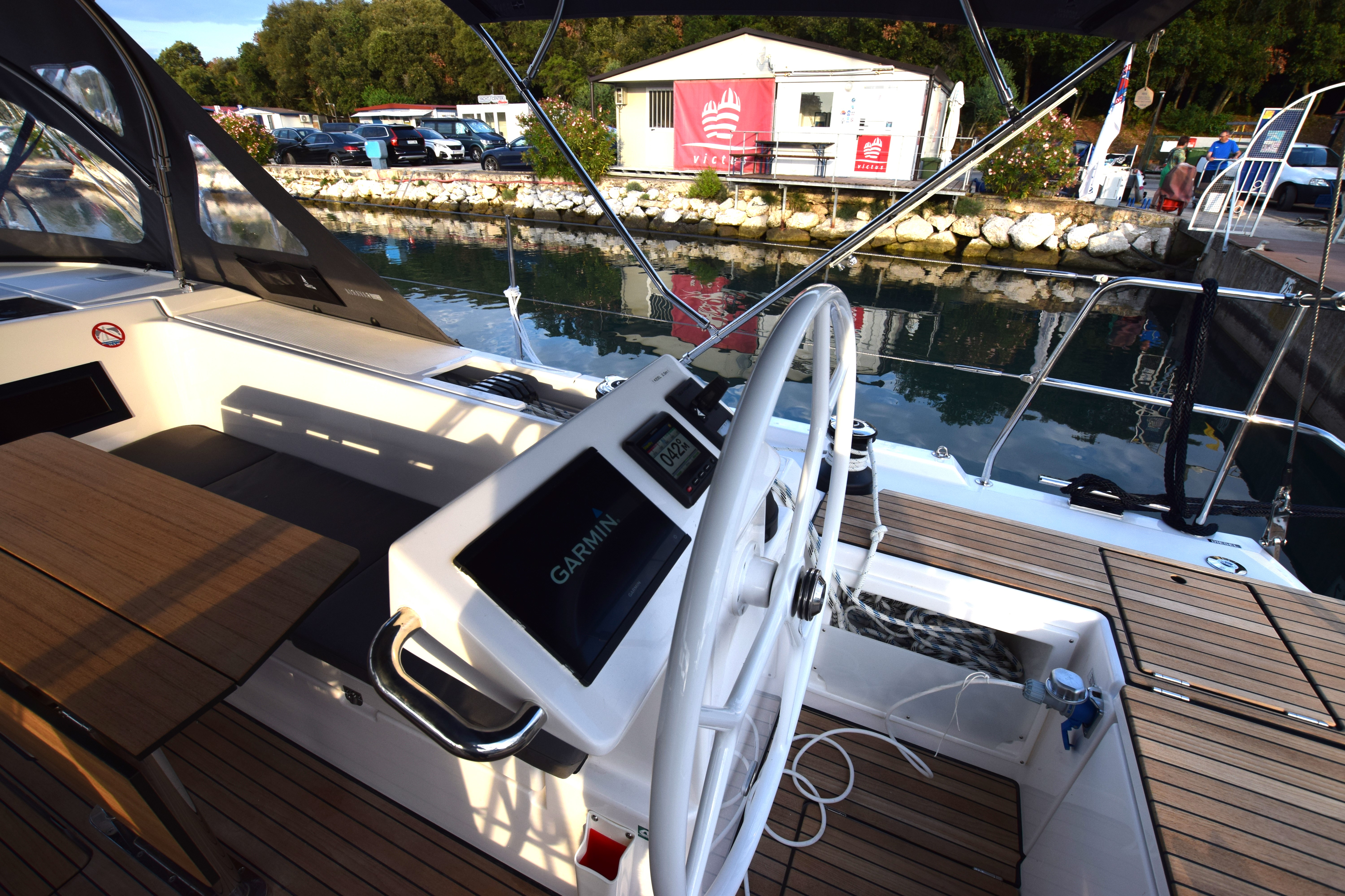 | Outside | Badeplattform, Biminitop, Bootshaken, Cockpitdusche, Cockpitlautsprecher, Cockpitpolster, Cockpittisch, elektr. Ankerwinsch, Fender, Festmacherleinen, Seereling, Solaranlage, Sprayhood, Teak im Cockpit, Windex |