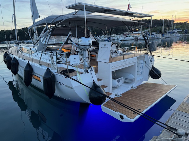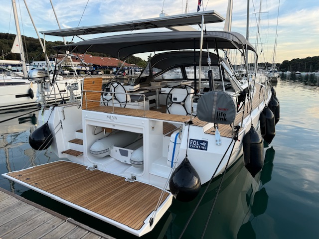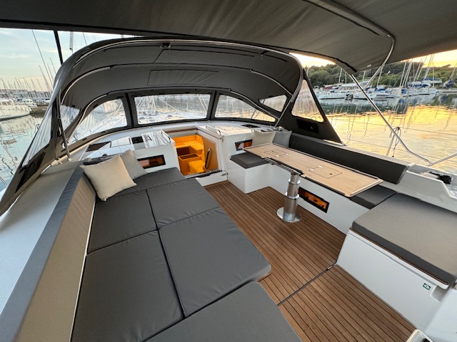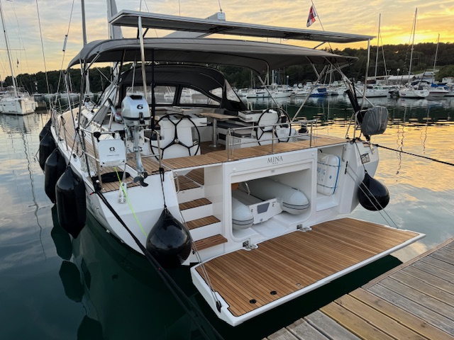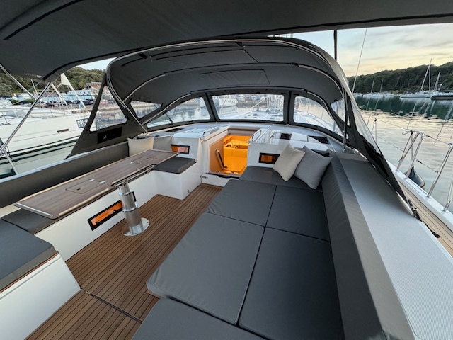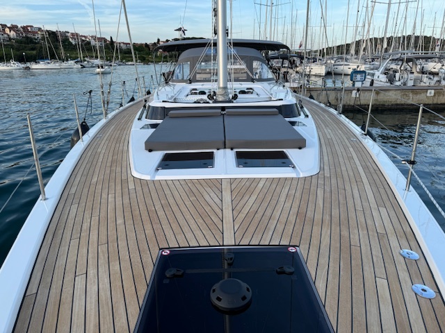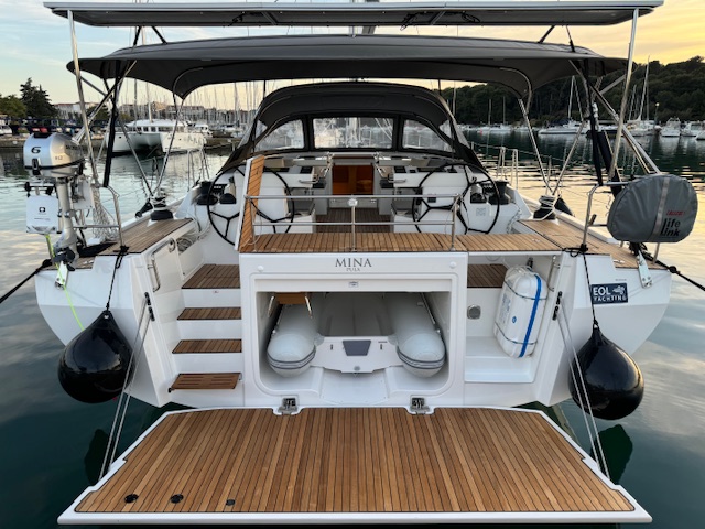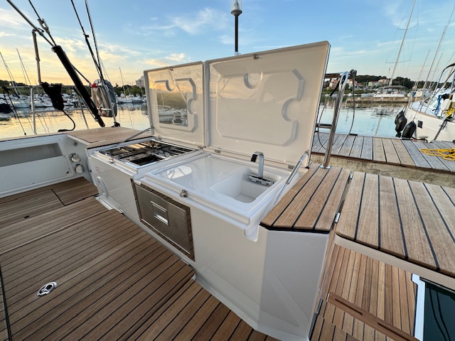 | Outside | 220 V-Landanschluss, Anker mit Kette, Badeleiter, Badeplattform elektr., Biminitop, Bootshaken, Cockpitdusche, Cockpitkühlschrank, Cockpitlautsprecher, Cockpitpolster, Cockpittisch absenkbar, Deckbürste, Deckpolster, Dieselkanister , elektr. Ankerwinsch, Fender, Festmacherleinen, Gangway, Grill, Kugelfender, Kunststoff-Eimer (Pütz), Solaranlage, Sprayhood, Teak im Cockpit, Teakdeck, Tendergarage, Unterwasserbeleuchtung, Wasserschlauch, Winschen |