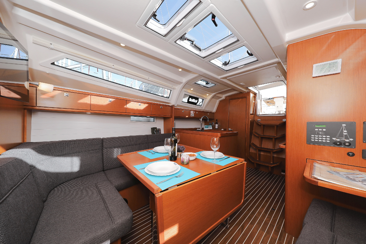 | Outside | 220 V-Landanschluss, Anker mit Kette, Ankerwinsch, Badeplattform, Biminitop, Bootshaken, Cockpitdusche, Cockpitlautsprecher, Cockpitpolster, Cockpittisch, Cockpittisch absenkbar, Dieselkanister , elektr. Ankerwinsch, Fender, Festmacherleinen, Gangway, Kugelfender, Kunststoff-Eimer (Pütz), Solaranlage, Sprayhood, Teak im Cockpit, Teakdeck, Wantenschneider, Wasserkanister , Wasserschlauch, Windex |