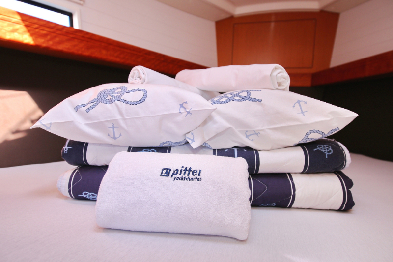Safety Automatikwesten, Autopilot, Blitzboje, Bootsmannstuhl, Bordapotheke, Bordwerkzeug, Bugstrahlruder, Feuerlöscher, Lifebelts, Motor-Ersatzteile, Nebelhorn, Notsignale, Radarreflektor, Reparaturset für Beiboot, Rettungsinsel, Suchscheinwerfer, Taschenlampe, UKW-Funk, Zweitanker