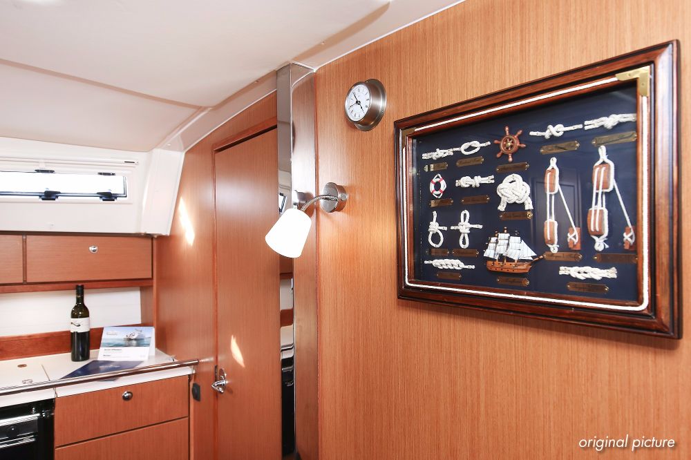 | Navigation | Barometer, Fernglas mit Peilkompass, GPS mit Kartenplotter im Cockpit, Hafenhandbücher, Navigationsbesteck, Seekarten, Tridata (Log, Echolot, Windm.) |