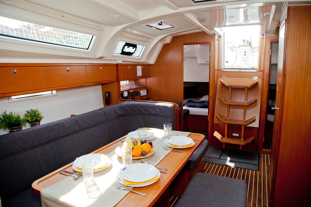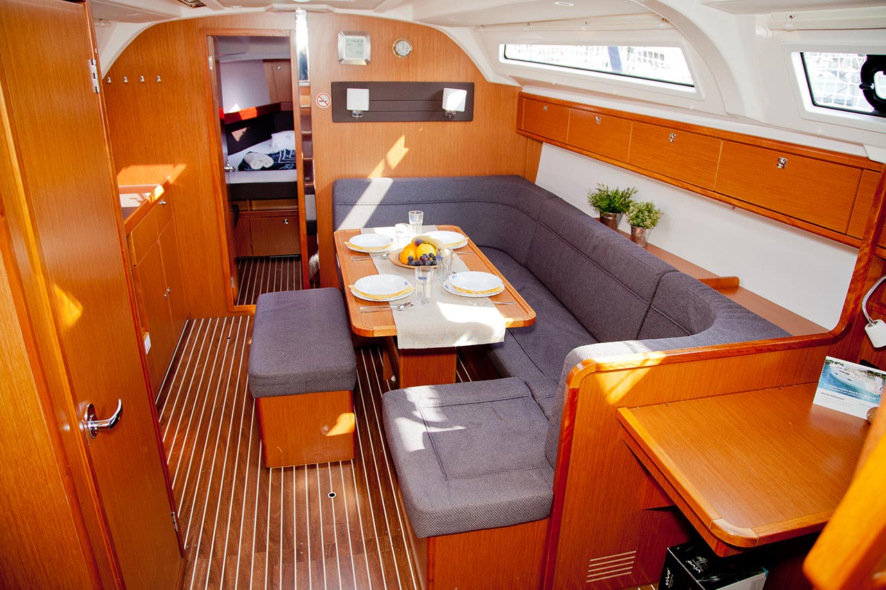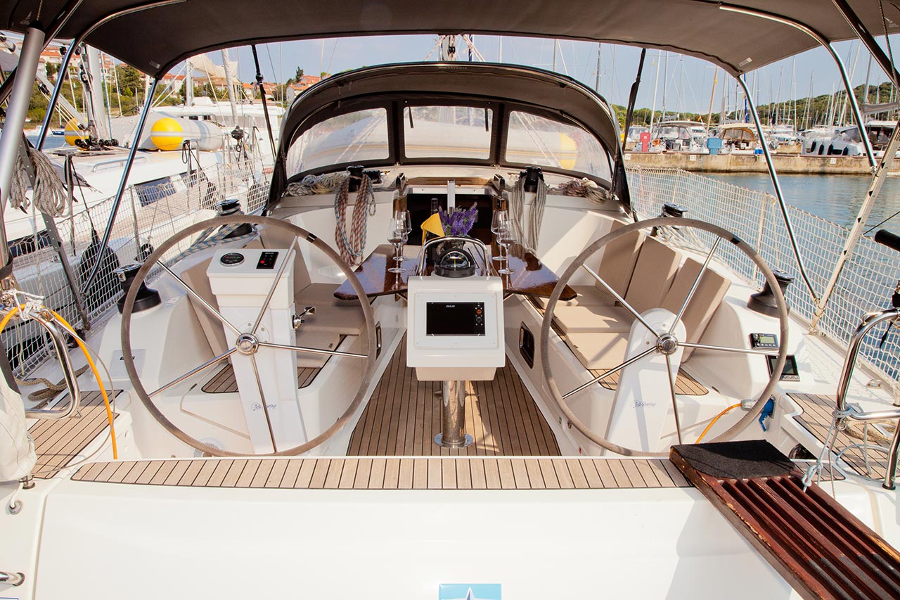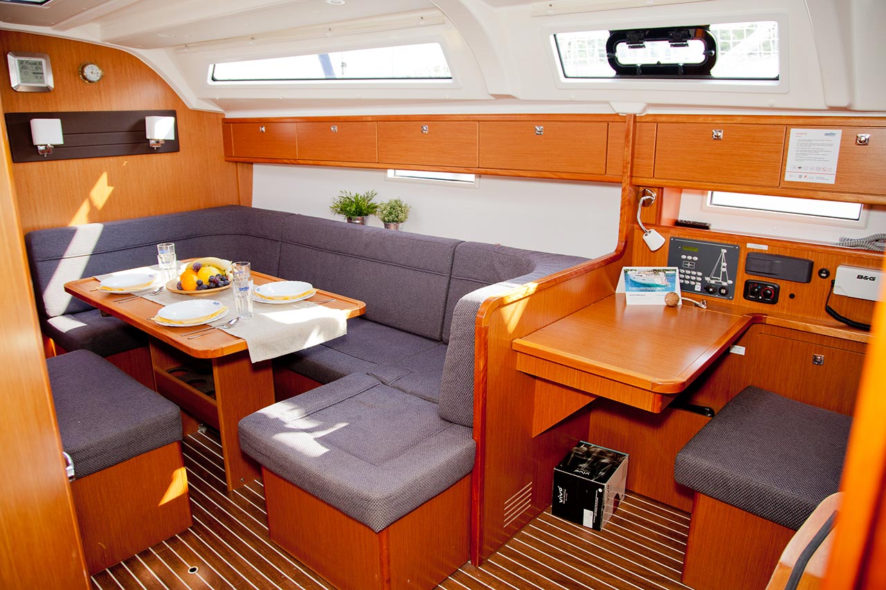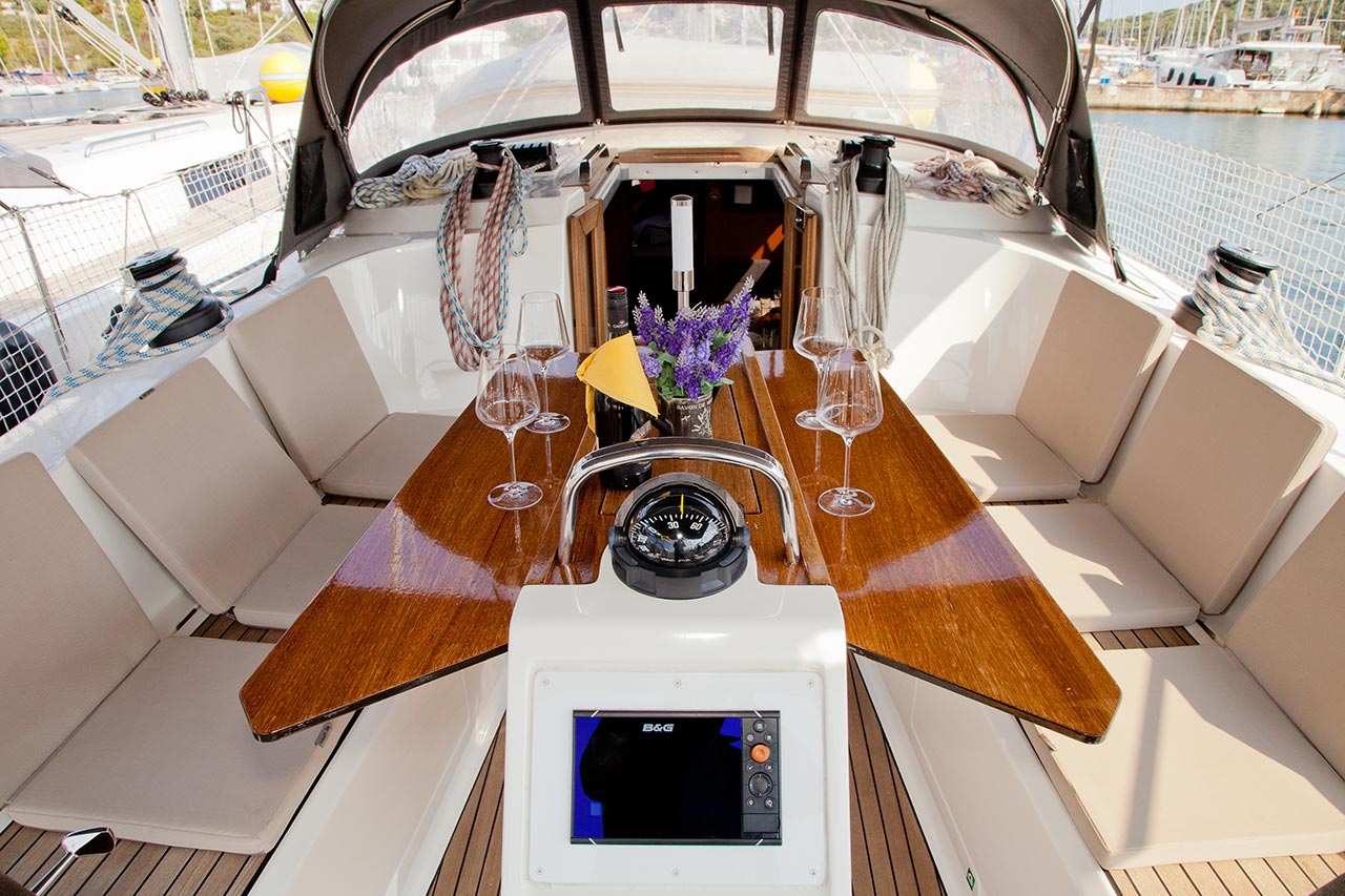 Outside 220 V-Landanschluss, Anker mit Kette, Ankerwinsch, Badeplattform, Biminitop, Bootshaken, Cockpitdusche, Cockpitlautsprecher, Cockpitpolster, Cockpittisch, Dieselkanister , elektr. Ankerwinsch, Fender, Festmacherleinen, Gangway, Kugelfender, Kunststoff-Eimer (Pütz), Solaranlage, Sprayhood, Teak im Cockpit, Wantenschneider, Wasserkanister , Wasserschlauch, Windex