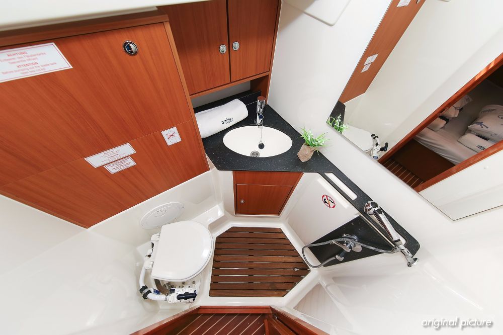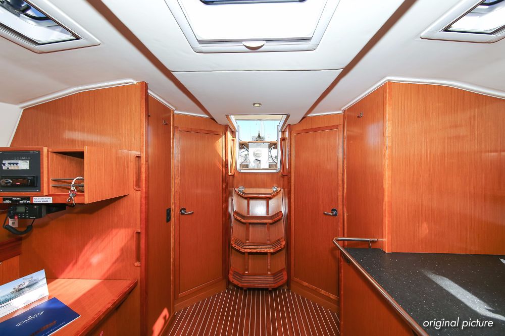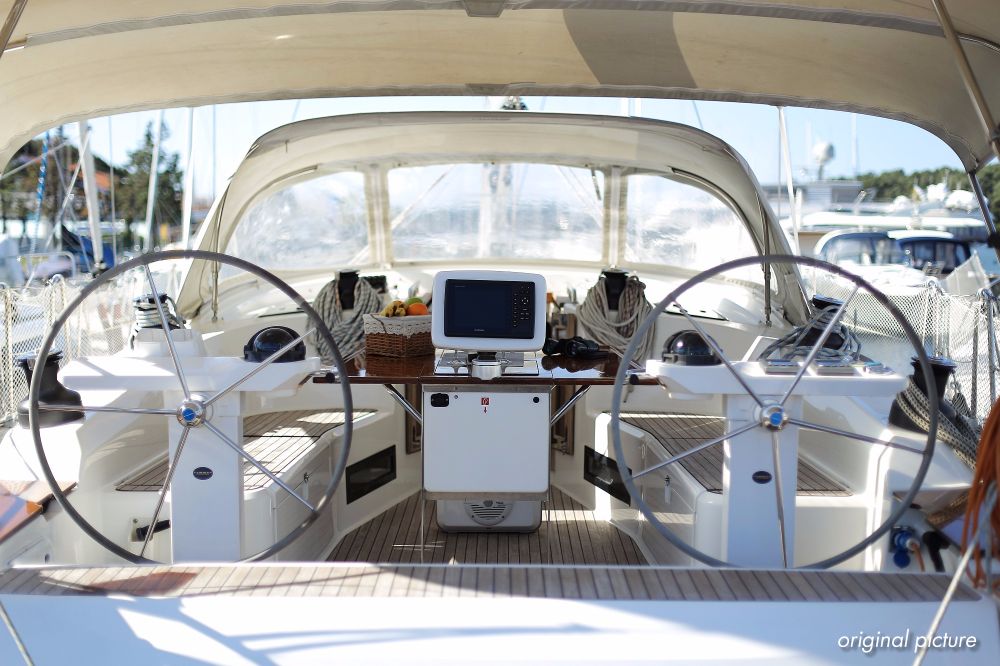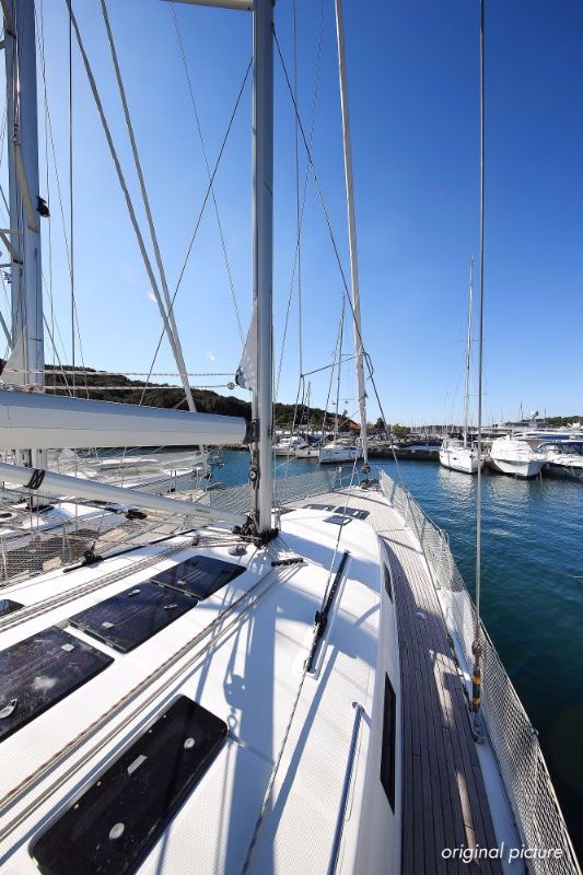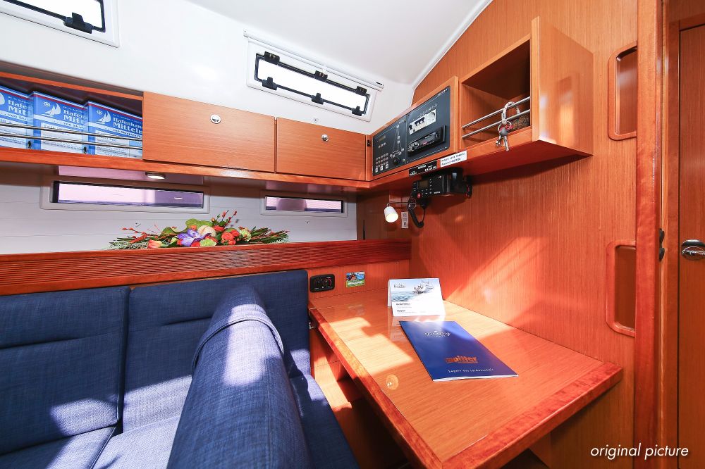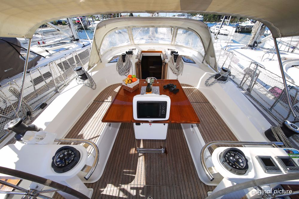 | Navigation | Barometer, Fernglas mit Peilkompass, GPS mit Kartenplotter im Cockpit, Hafenhandbücher, Navigationsbesteck, Seekarten, Tridata (Log, Echolot, Windm.) |