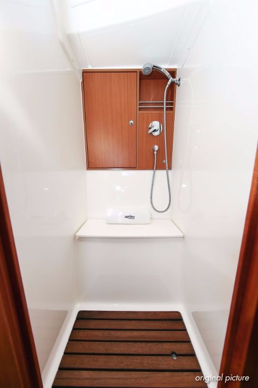 | Outside | 220 V-Landanschluss, Anker mit Kette, Ankerwinsch, Badeplattform, Biminitop, Bootshaken, Cockpitdusche, Cockpitlautsprecher, Cockpitpolster, Cockpittisch, Dieselkanister , elektr. Ankerwinsch, Fender, Festmacherleinen, Gangway, Kugelfender, Kunststoff-Eimer (Pütz), Solaranlage, Sprayhood, Teak im Cockpit, Teakdeck, Wantenschneider, Wasserkanister , Wasserschlauch, Windex |