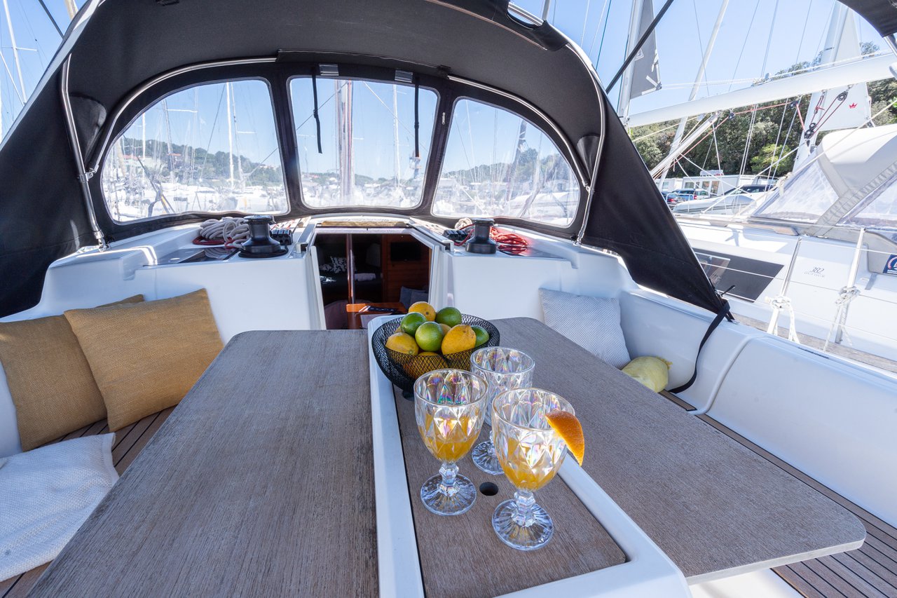 | Outside | Badeplattform, Biminitop, Cockpitdusche, Cockpitlautsprecher, Cockpittisch, elektr. Ankerwinsch, Fender, Solaranlage, Sprayhood |