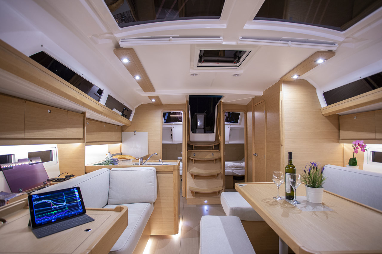 Das war, bei für den kommenden Tag vorhergesagte Bora-Warnung von großem Vorteil für unseren Turn. Bei der Übernahme bemängelten wir den defekten Grill und die sich in den Nasszellen ablösenden Furniere, bzw Umleimer. Es wäre eine Sache von Minuten gewesen die Umleimer eben wieder anzuleimen, zumal das Boot ja eine Woche im Hafen lag. Dafür wurde der im Cockpit der Yacht fest installierte Gasgrill insoweit repariert, dass wenigstens eine von 2 Flammen brannte. Zu gebrauchen war er aber, wie sich leider unterwegs herausstellte, nicht. Die Dufour 4012 BJ 2019 begeisterte die Crew durch das großzügige Raumangebot und die sehr guten Segeleigenschaften. Getrübt wurde die Freude lediglich durch die teilweise erbärmliche Materialanmutung. Über die Anordnung des Kontrolle-Panels, seitlich, liegend neben dem Kartentisch kann man vielleicht streiten, über die völlig unbrauchbaren Anzeigen von Wasser und Diesel, sowie die teils nicht Funktionierenden Druckkknöpfe (Hifi-System lässt sich nicht abschalten, Aussenbeleuchtung über den Hifi- Knopf geschaltet, Beleuchtung am Kartentisch nur bei eingeschalteten Navigationsinstrumenten möglich) betrachte ich als nicht unerhebliches Manko. Hier sollte das Design doch eher der Funktionalität folgen und bewährte und zuverlässig funktionierte Technik verbaut werden.