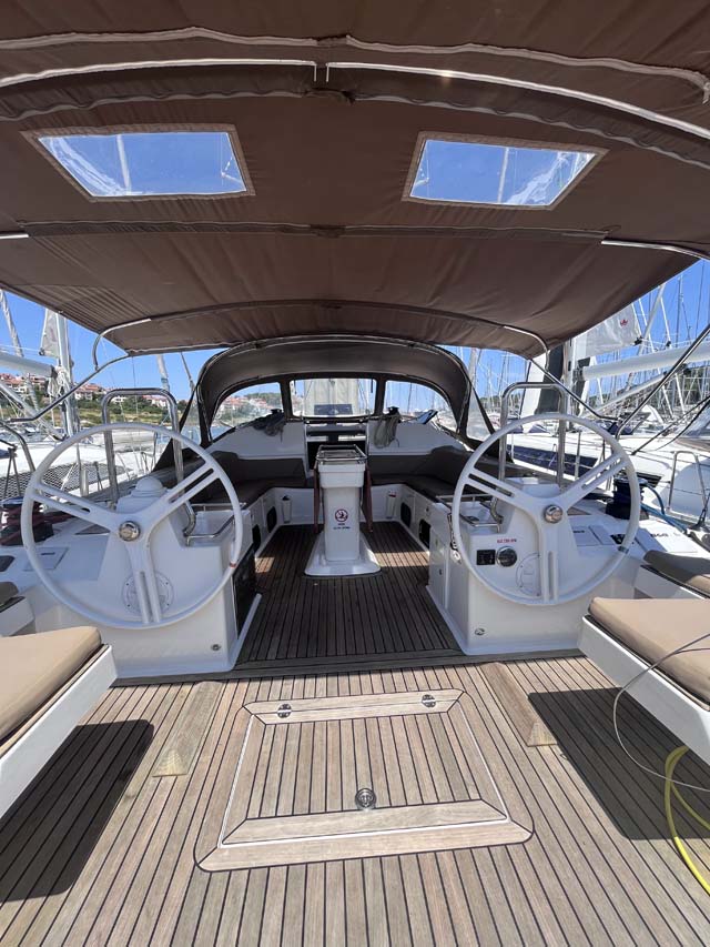 | Outside | 220 V-Landanschluss, Anker mit Kette, Badeplattform, Biminitop, Bootshaken, Cockpitdusche, Cockpitlautsprecher, Cockpitpolster, Cockpittisch, Deckpolster, Dieselkanister , elektr. Ankerwinsch, Faltpropeller, Fender, Fernsteuerung für elektr. Ankerwinsch, Festmacherleinen, Gangway, Kugelfender, Kunststoff-Eimer (Pütz), Solaranlage, Sprayhood, Teak im Cockpit, Unterwasserbeleuchtung, Wantenschneider, Wasserkanister , Wasserschlauch, Windex |