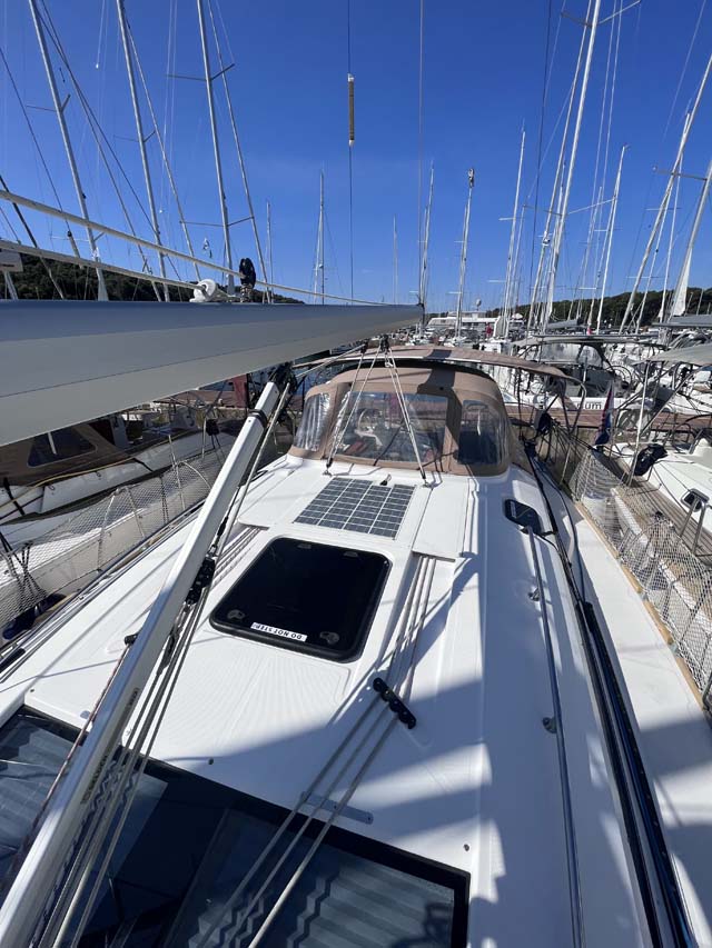 | Navigation | Barometer, Fernglas mit Peilkompass, GPS mit Kartenplotter im Cockpit, Hafenhandbücher, Navigationsbesteck, Seekarten, Tridata (Log, Echolot, Windm.) |
