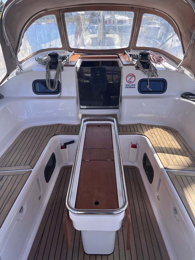 | Outside | 220 V-Landanschluss, Anker mit Kette, Ankerwinsch, Badeplattform, Biminitop, Bootshaken, Cockpitdusche, Cockpitlautsprecher, Cockpitpolster, Cockpittisch, Deckbeleuchtung, Dieselkanister , elektr. Ankerwinsch, Fender, Festmacherleinen, Gangway, Kugelfender, Kunststoff-Eimer (Pütz), Solaranlage, Sprayhood, Teak im Cockpit, Unterwasserbeleuchtung, Wantenschneider, Wasserkanister , Wasserschlauch, Windex |