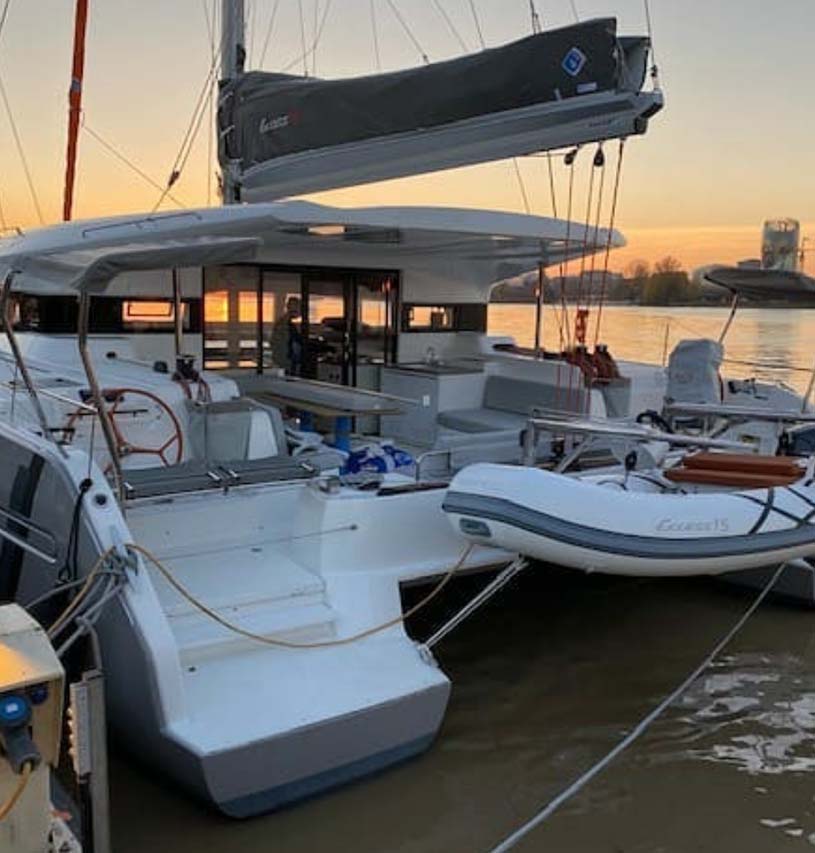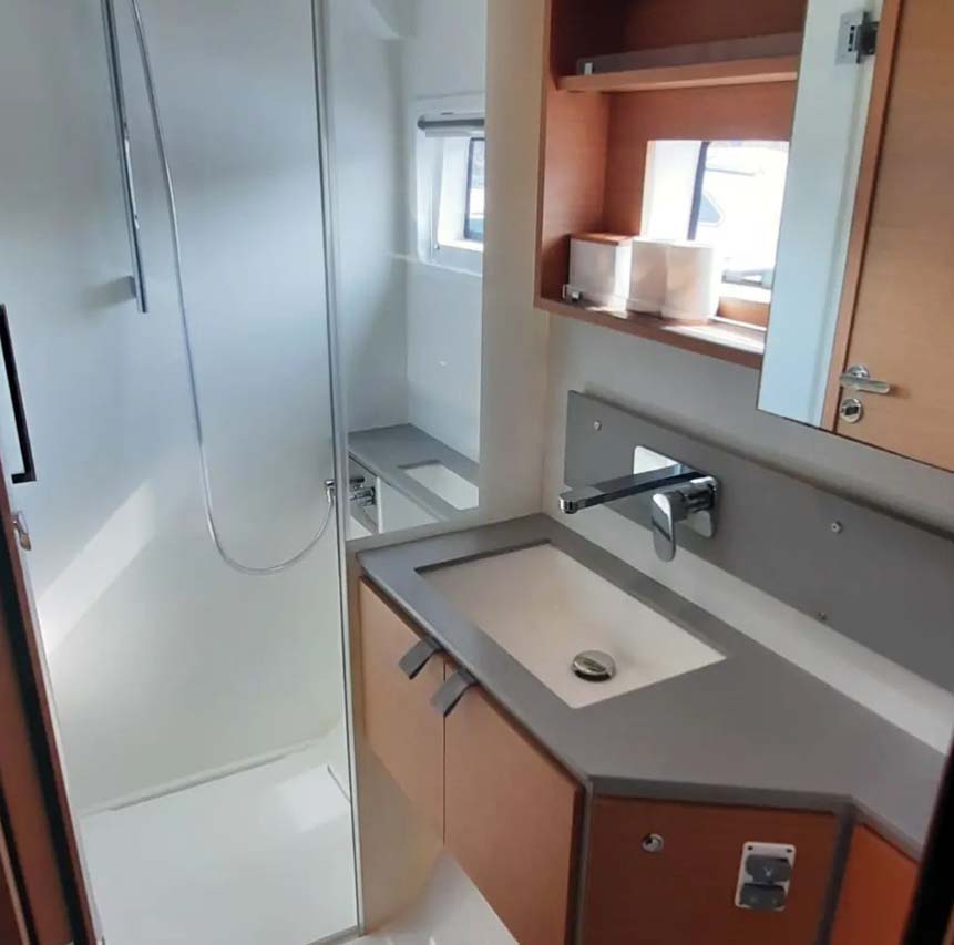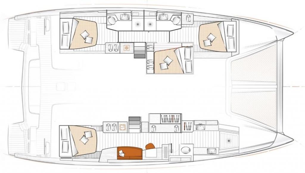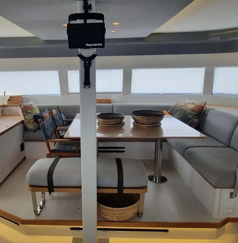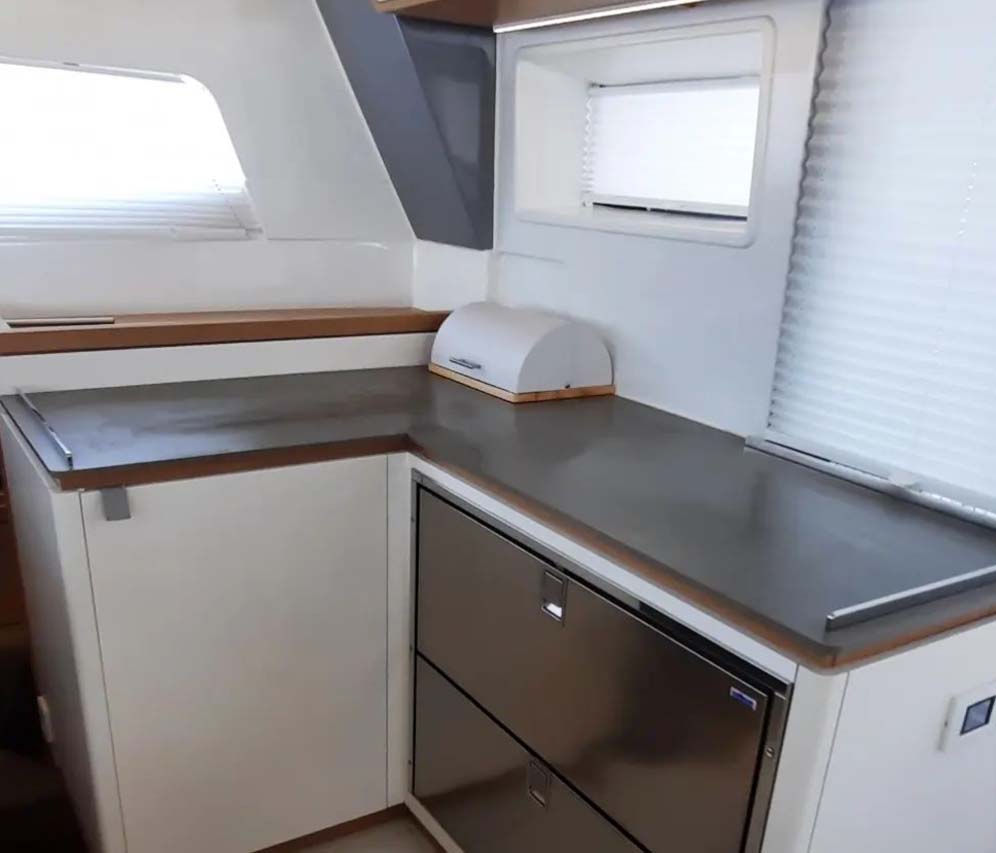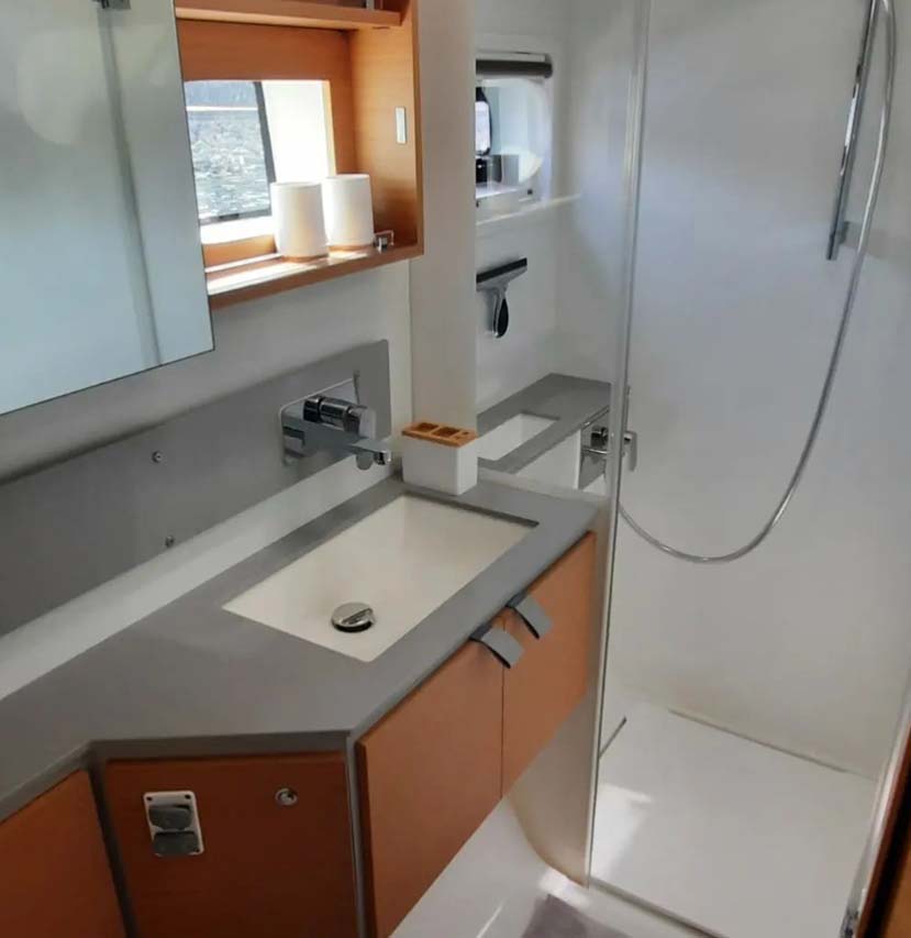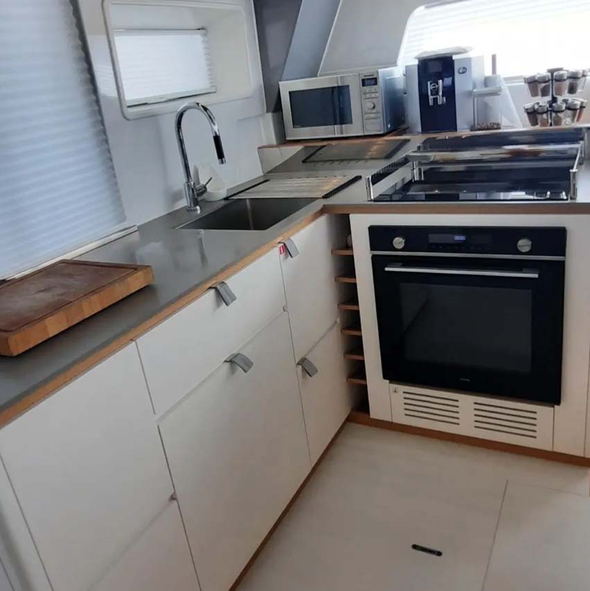 Borduhr, Gasherd, Generator, Heizung, Inverter 12V/220V, Kaffeemaschine, Klimaanlage (ohne Landstrombedarf), Kühlschrank, Ladegerät, Luftpumpe für Beiboot, Mikrowelle, Pantryausstattung, Radio, Salontisch absenkbar, USB Steckdose, Ventilatoren in Kabinen, Warmwasser, Watermaker, WC (elektr.) |