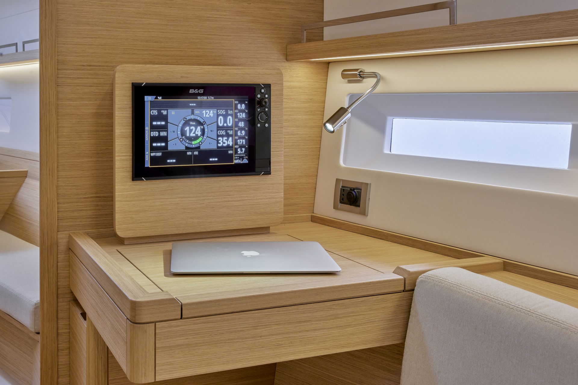 | Navigation | Barometer, Fernglas mit Peilkompass, GPS mit Kartenplotter im Cockpit, Hafenhandbücher, Navigationsbesteck, Seekarten, Tridata (Log, Echolot, Windm.) |