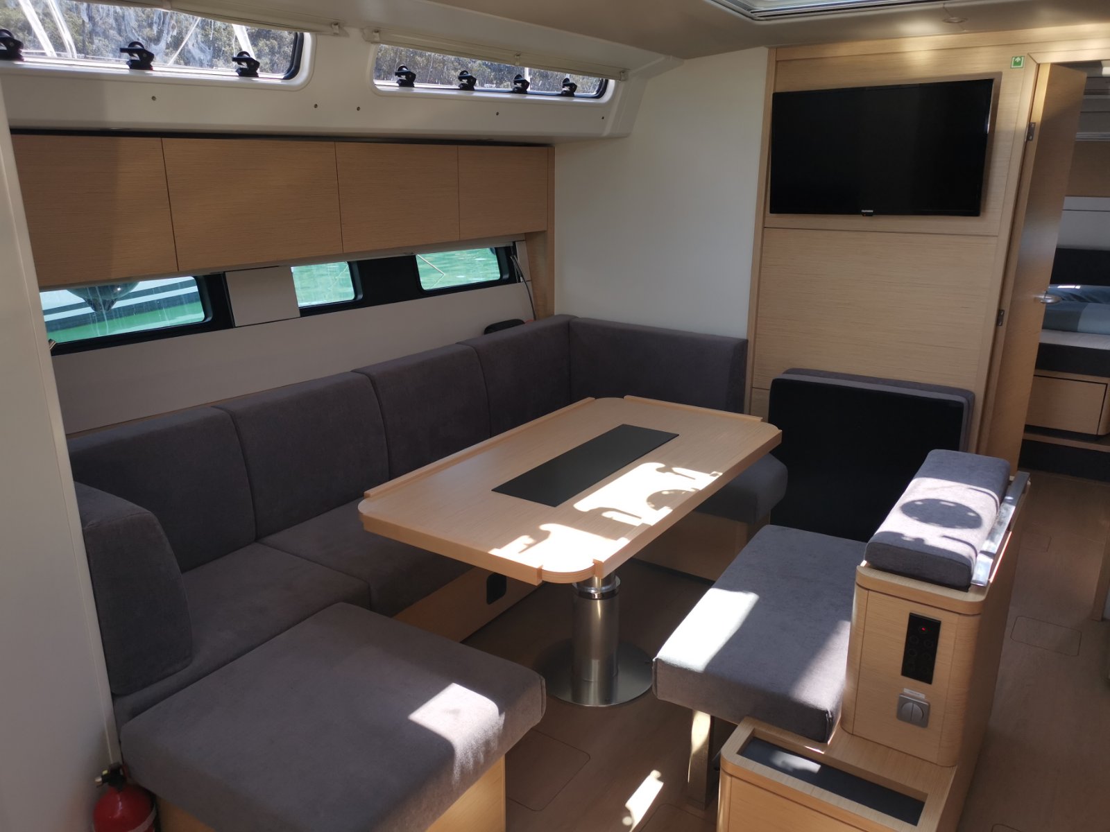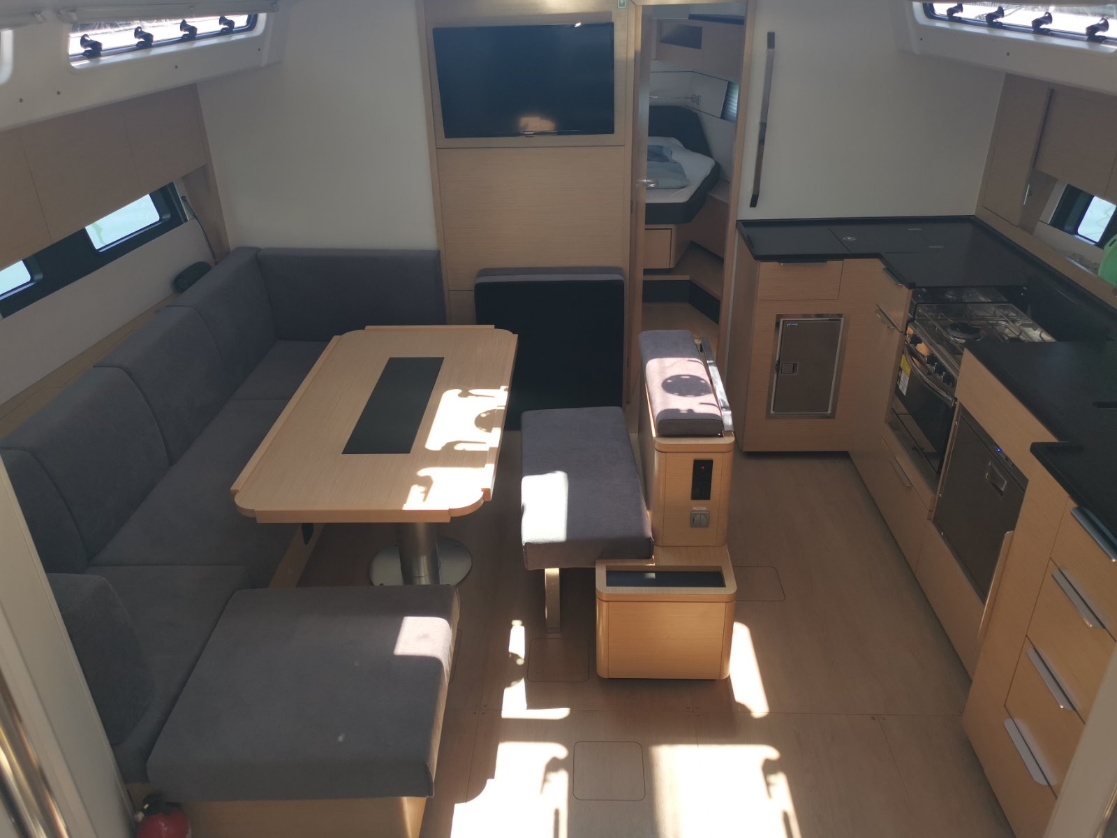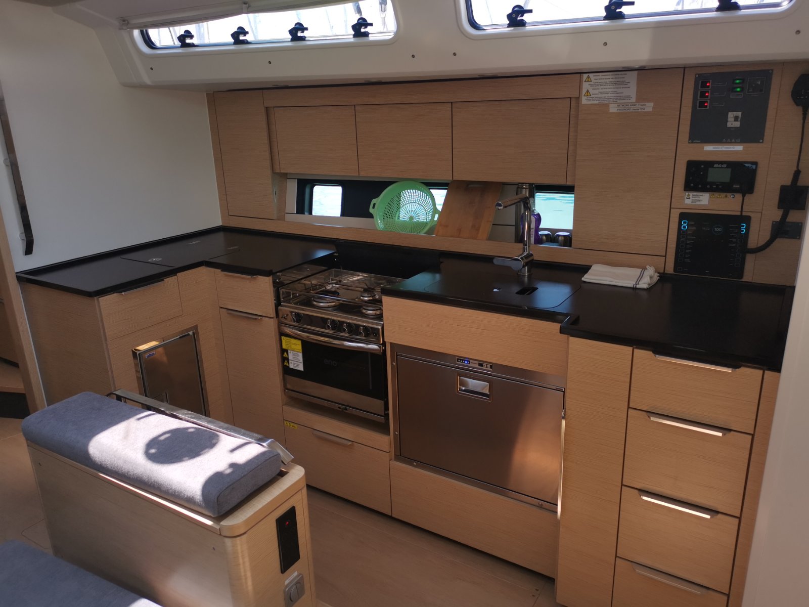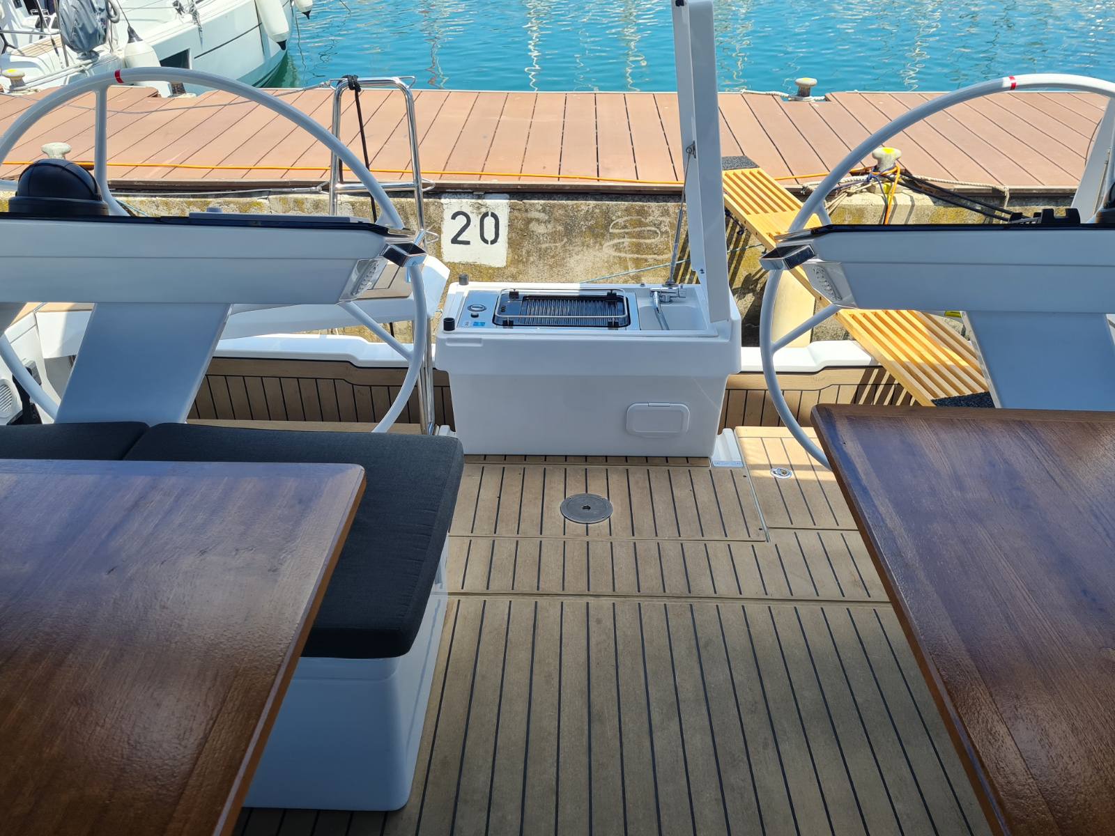 | Outside | Abnehmbare Cockpitbank, Anker mit Kette, Badeleiter, Badeplattform, Biminitop, Bugspriet, Cockpitdusche, Cockpitkühlschrank, Cockpitpolster, Cockpittisch, elektr. Ankerwinsch, Fallwinschen, Fernsteuerung für elektr. Ankerwinsch, Grill, Lifeline System, Schnorchelausrüstung, Teak auf Badeplattform, Teak im Cockpit, Wantenschneider, Wet Bar, Windex |