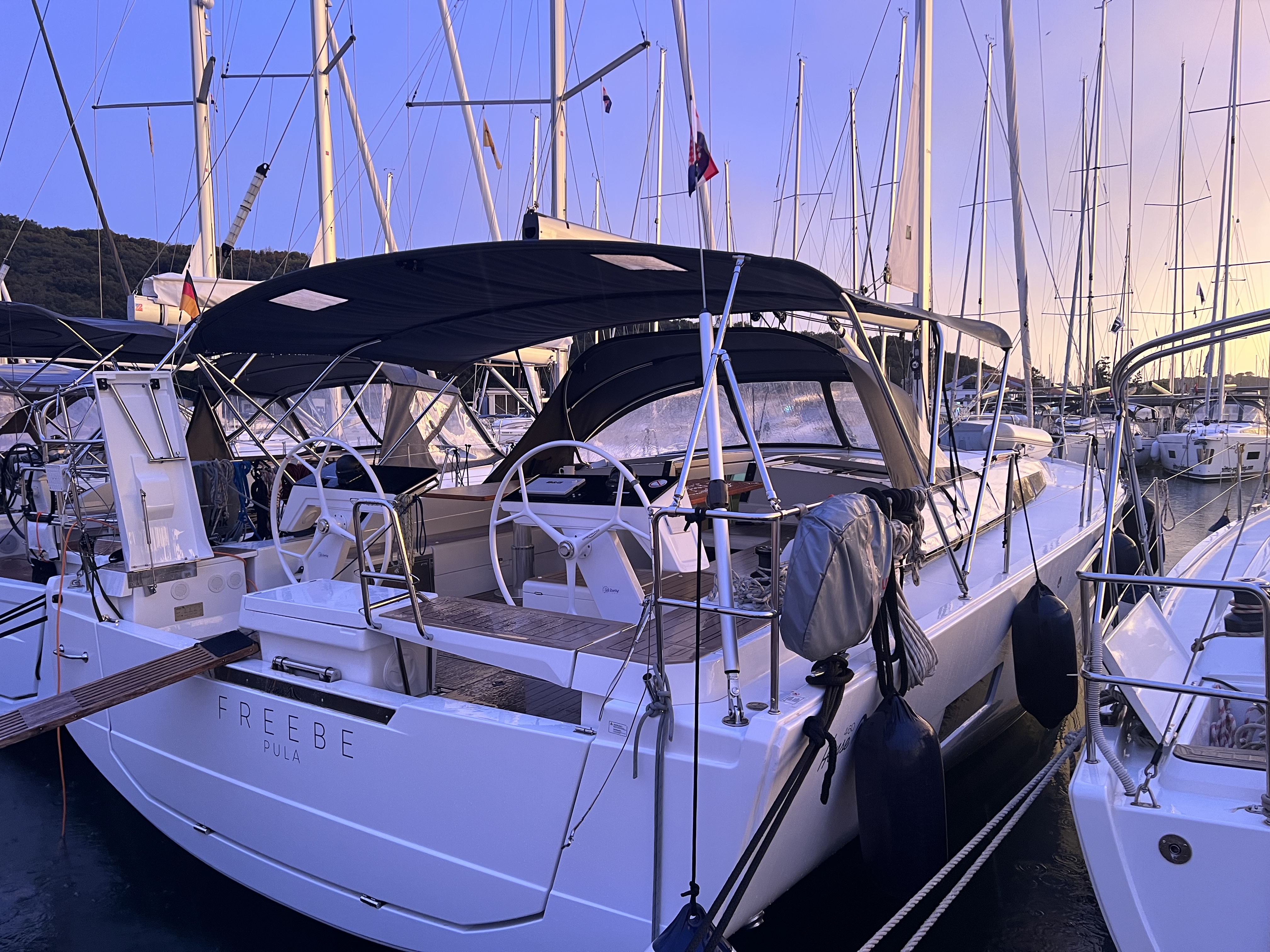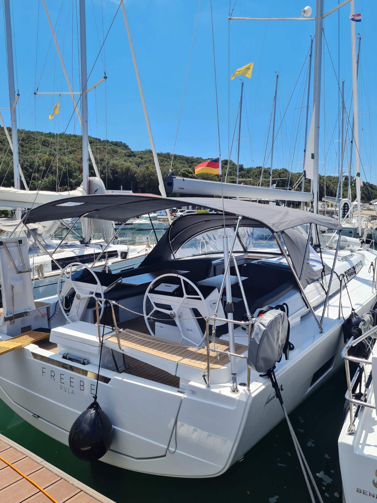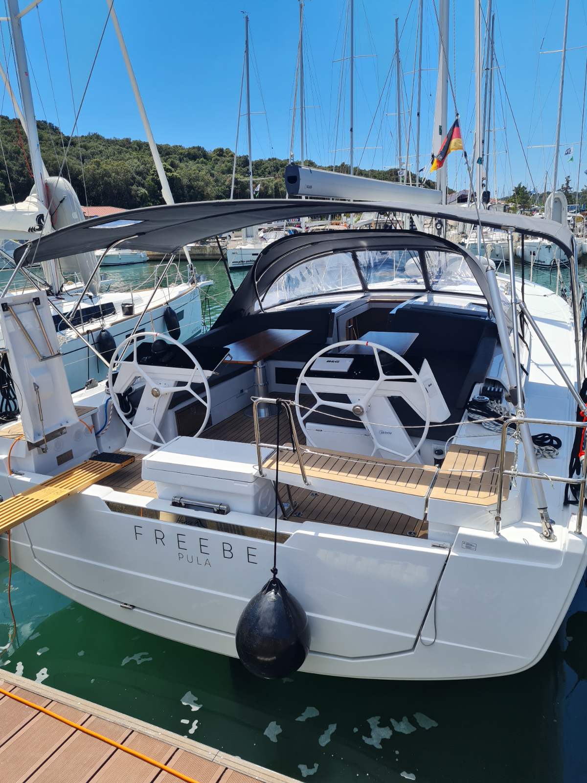 | Outside | Abnehmbare Cockpitbank, Anker mit Kette, Badeleiter, Badeplattform, Biminitop, Bugspriet, Cockpitdusche, Cockpitkühlschrank, Cockpitpolster, Cockpittisch, elektr. Ankerwinsch, Fallwinschen, Fernsteuerung für elektr. Ankerwinsch, Grill, Lifeline System, Schnorchelausrüstung, Teak auf Badeplattform, Teak im Cockpit, Wantenschneider, Wet Bar, Windex |