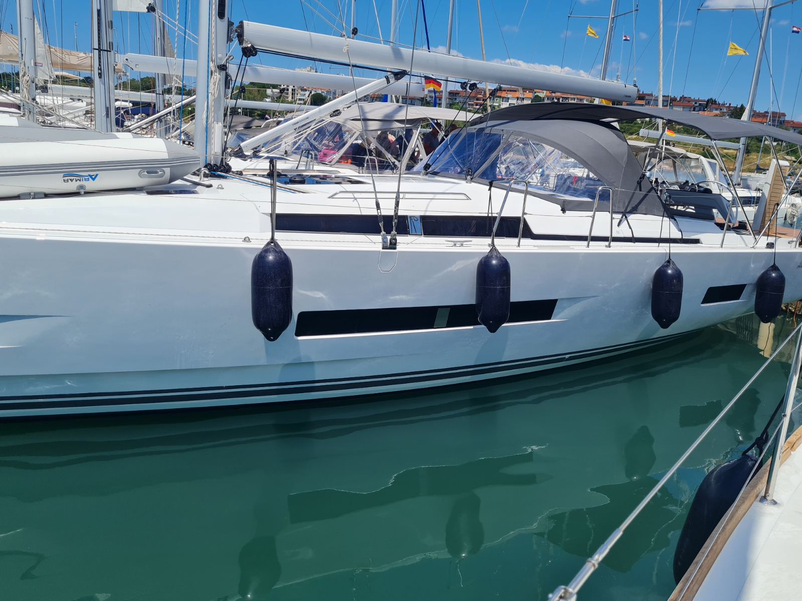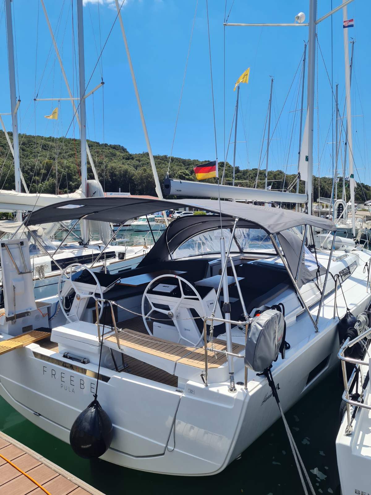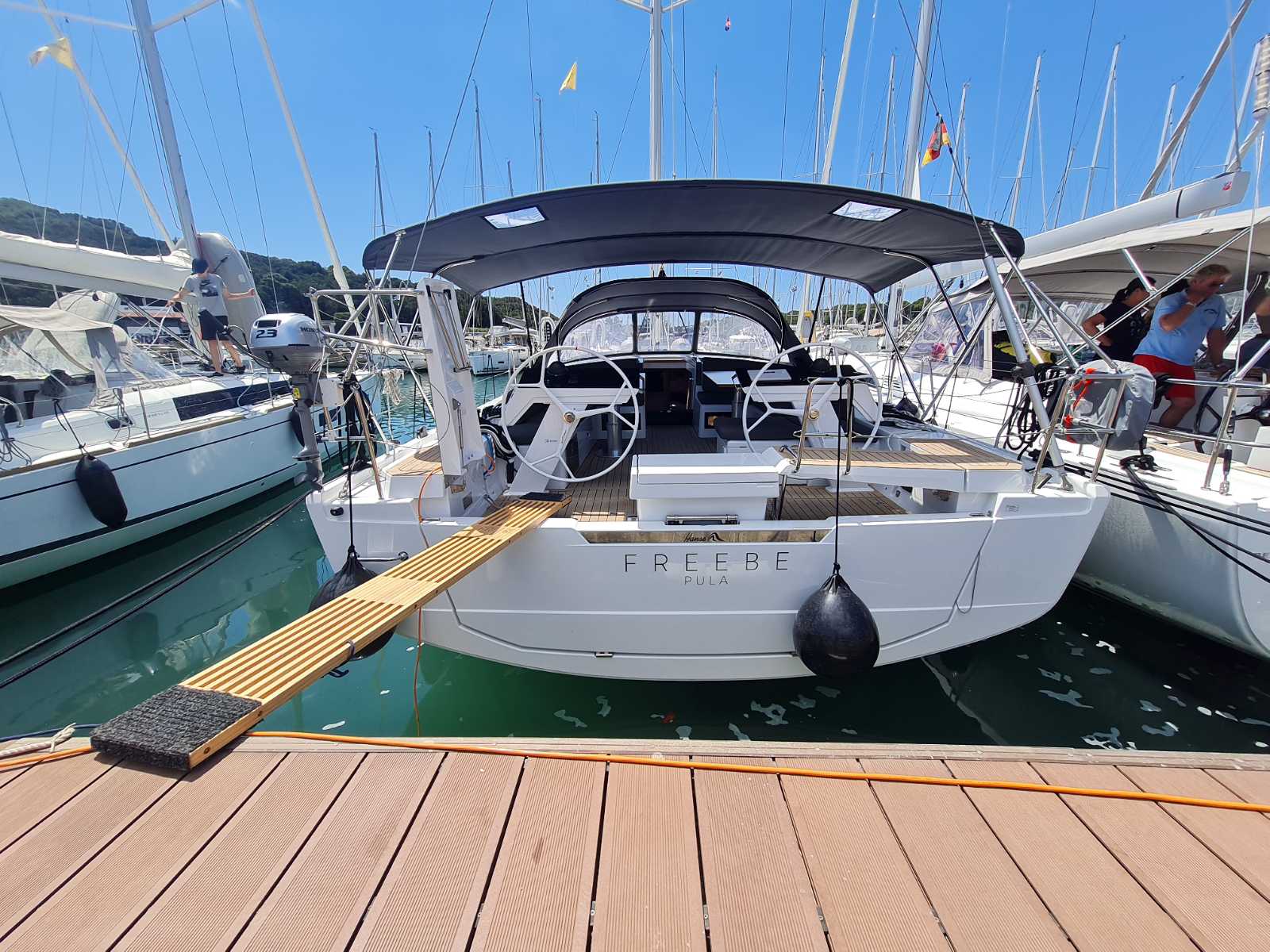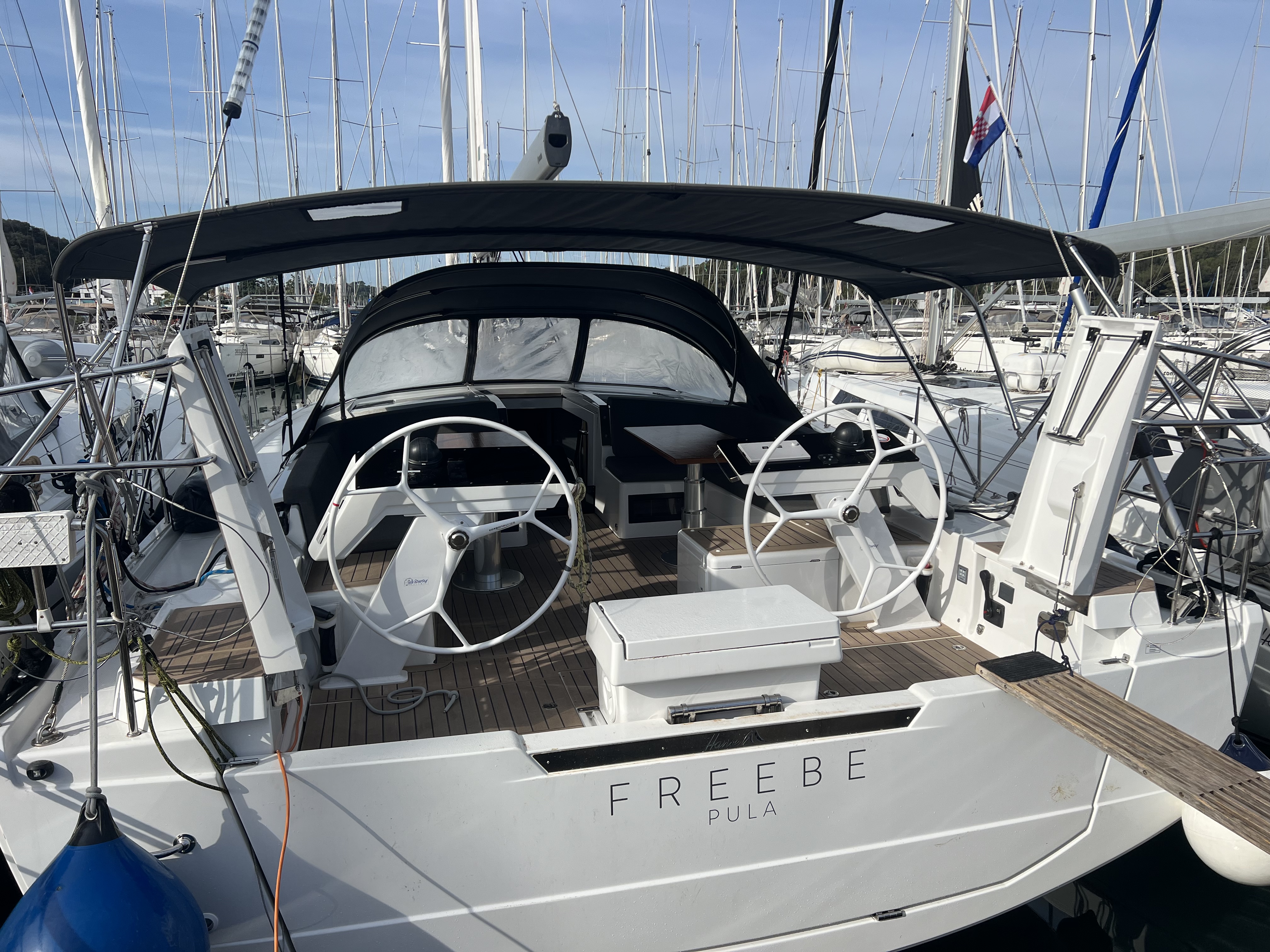 | Outside | Abnehmbare Cockpitbank, Anker mit Kette, Badeleiter, Badeplattform, Biminitop, Bugspriet, Cockpitdusche, Cockpitkühlschrank, Cockpitpolster, Cockpittisch, elektr. Ankerwinsch, Fallwinschen, Fernsteuerung für elektr. Ankerwinsch, Grill, Lifeline System, Schnorchelausrüstung, Teak auf Badeplattform, Teak im Cockpit, Wantenschneider, Wet Bar, Windex |