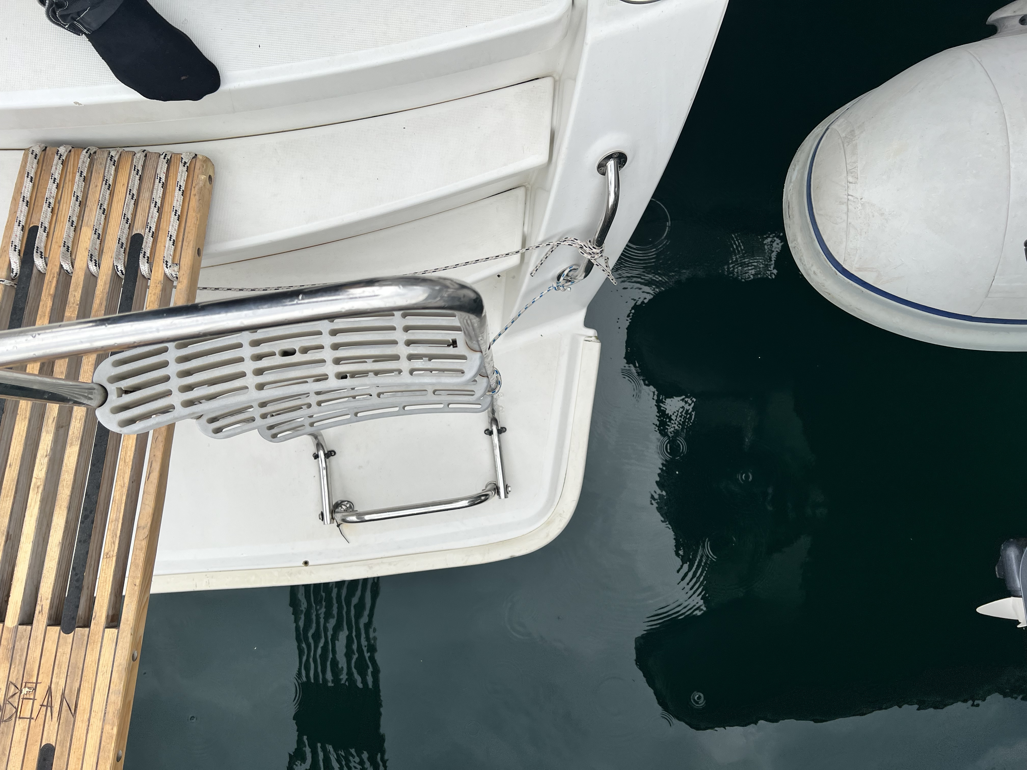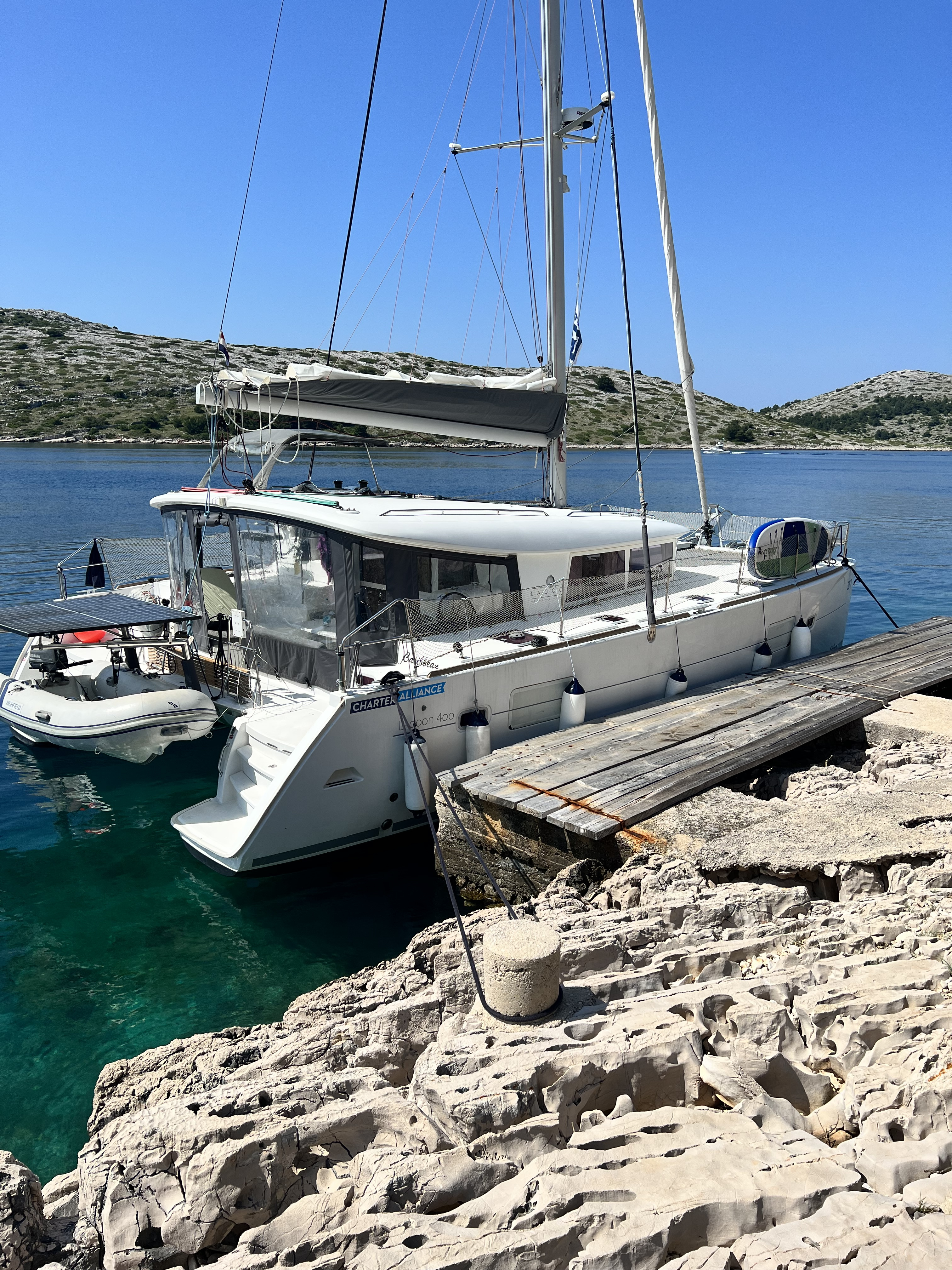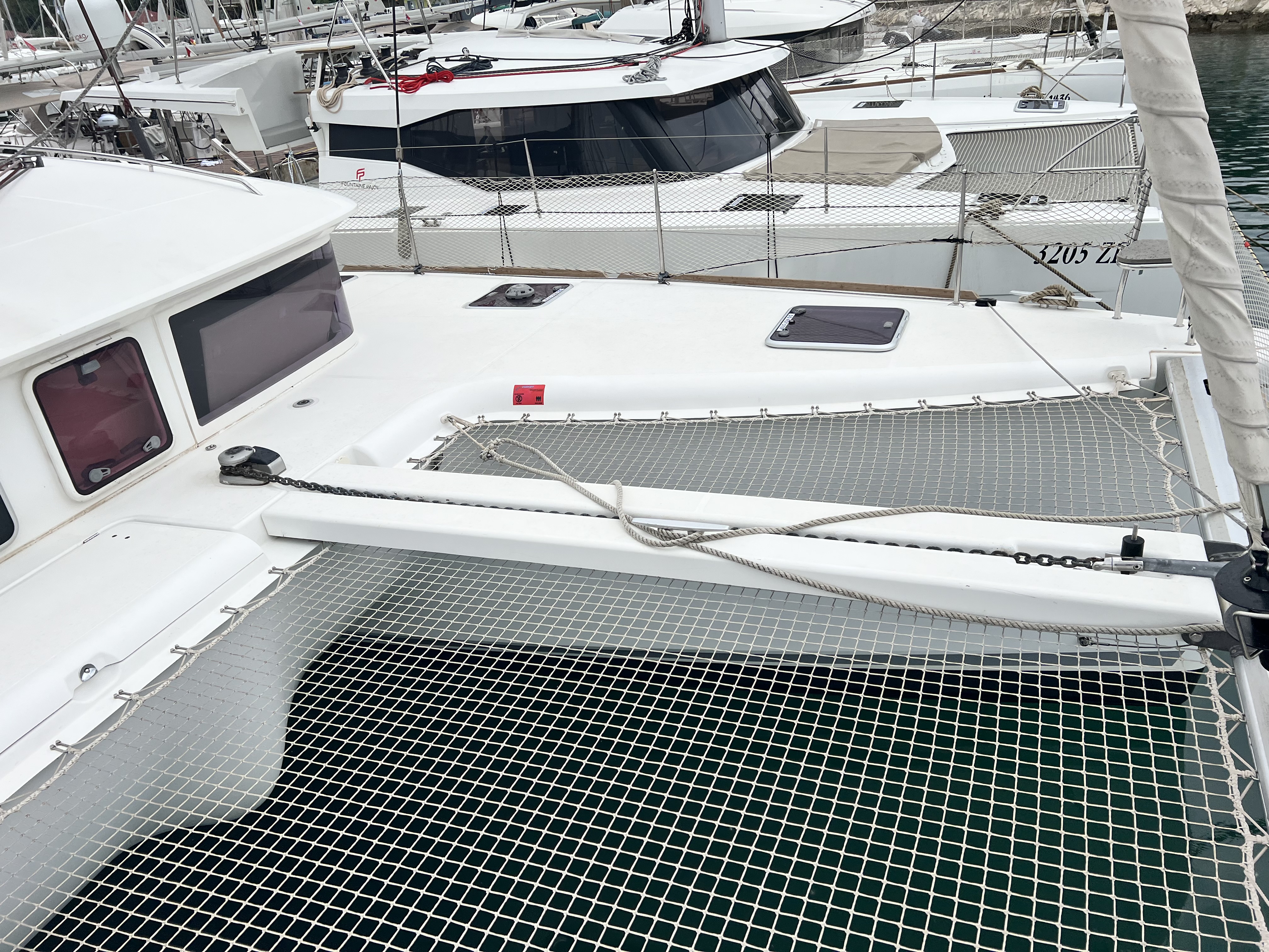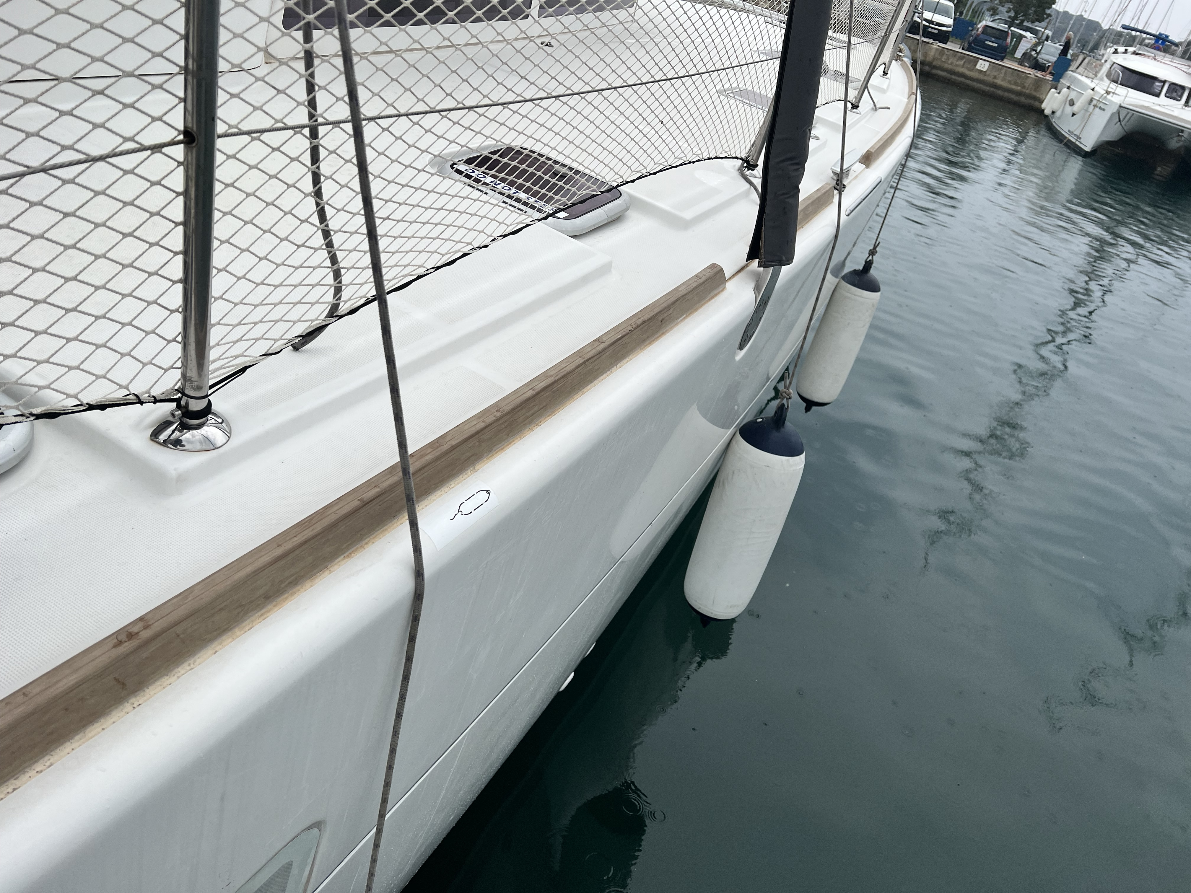 | Outside | 220 V-Landanschluss, Anker mit Kette, Ankerwinsch, Badeplattform, Bootshaken, Cockpitdusche, Cockpitlautsprecher, Cockpitpolster, Cockpittisch, Davits, Dieselkanister , elektr. Ankerwinsch, Fender, Festmacherleinen, Gangway, Kugelfender, Kunststoff-Eimer (Pütz), Solaranlage, Sprayhood, Wantenschneider, Wasserkanister , Wasserschlauch |