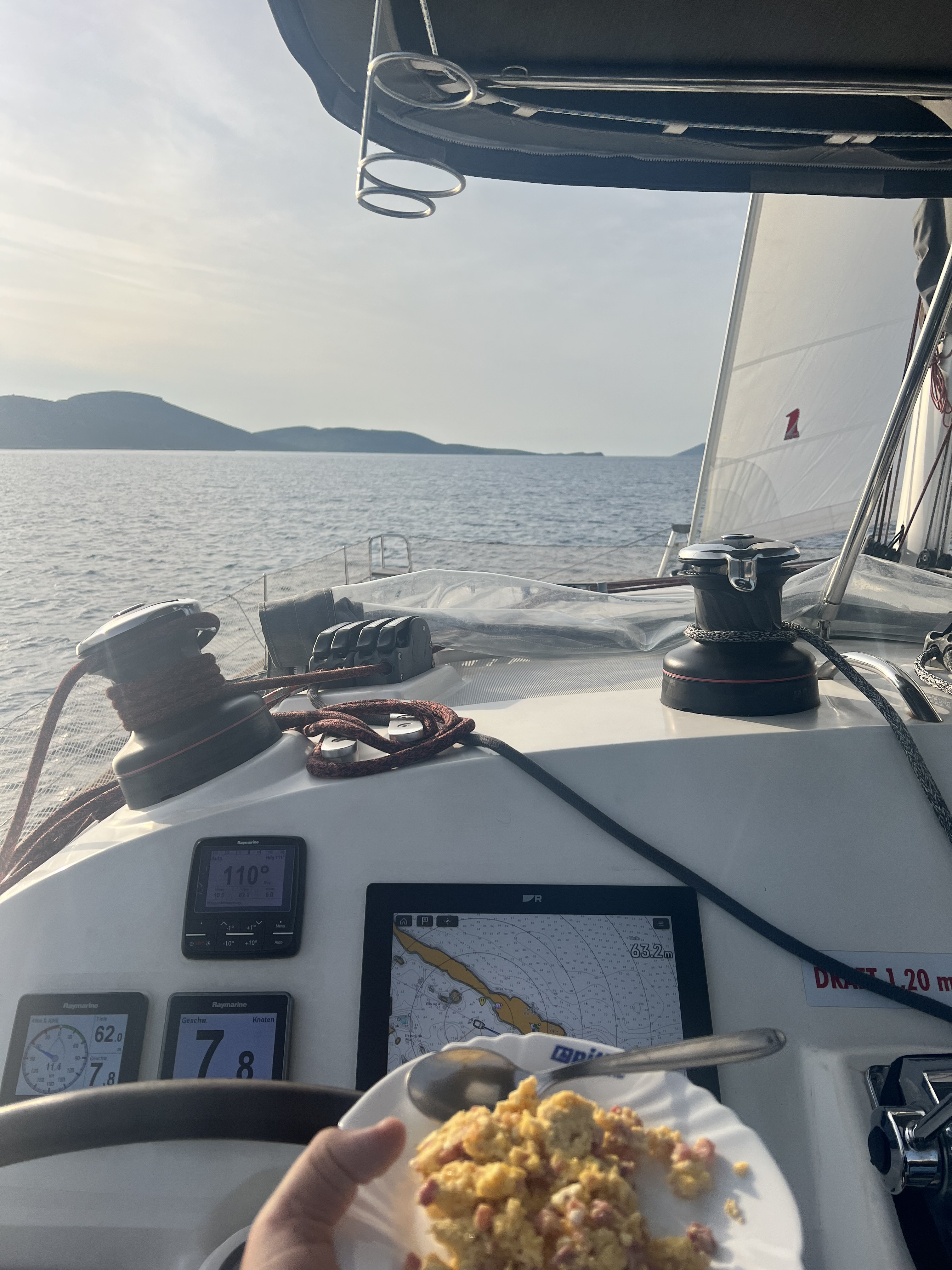 | Navigation | Barometer, Fernglas, GPS mit Kartenplotter, Hafenhandbücher, Navigationsbesteck, Radar, Seekarten, Tridata (Log, Echolot, Windm.) |