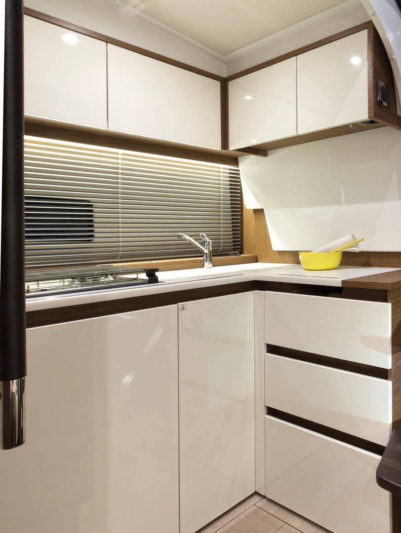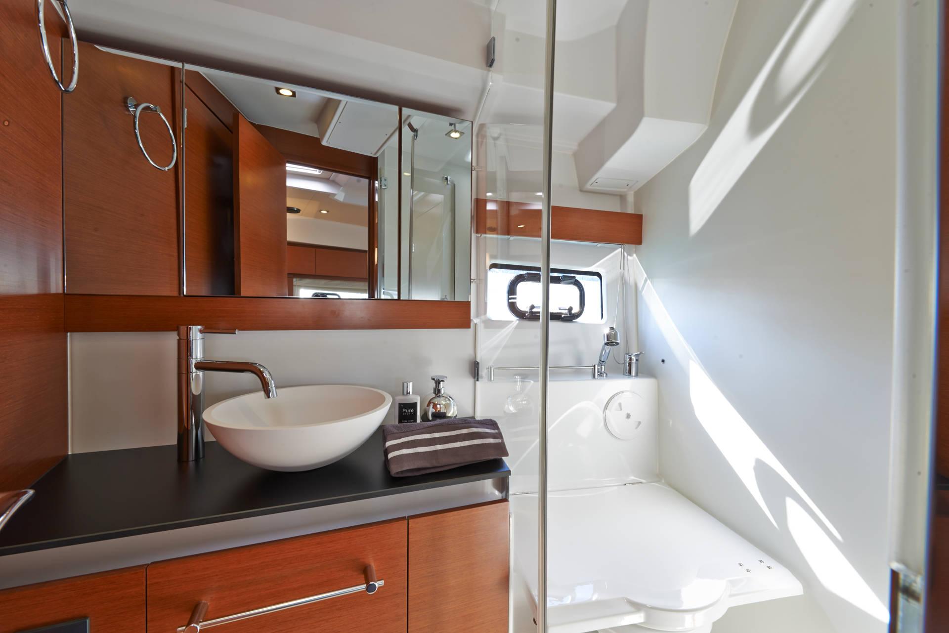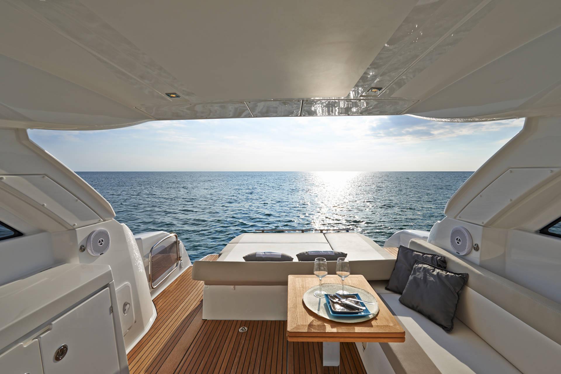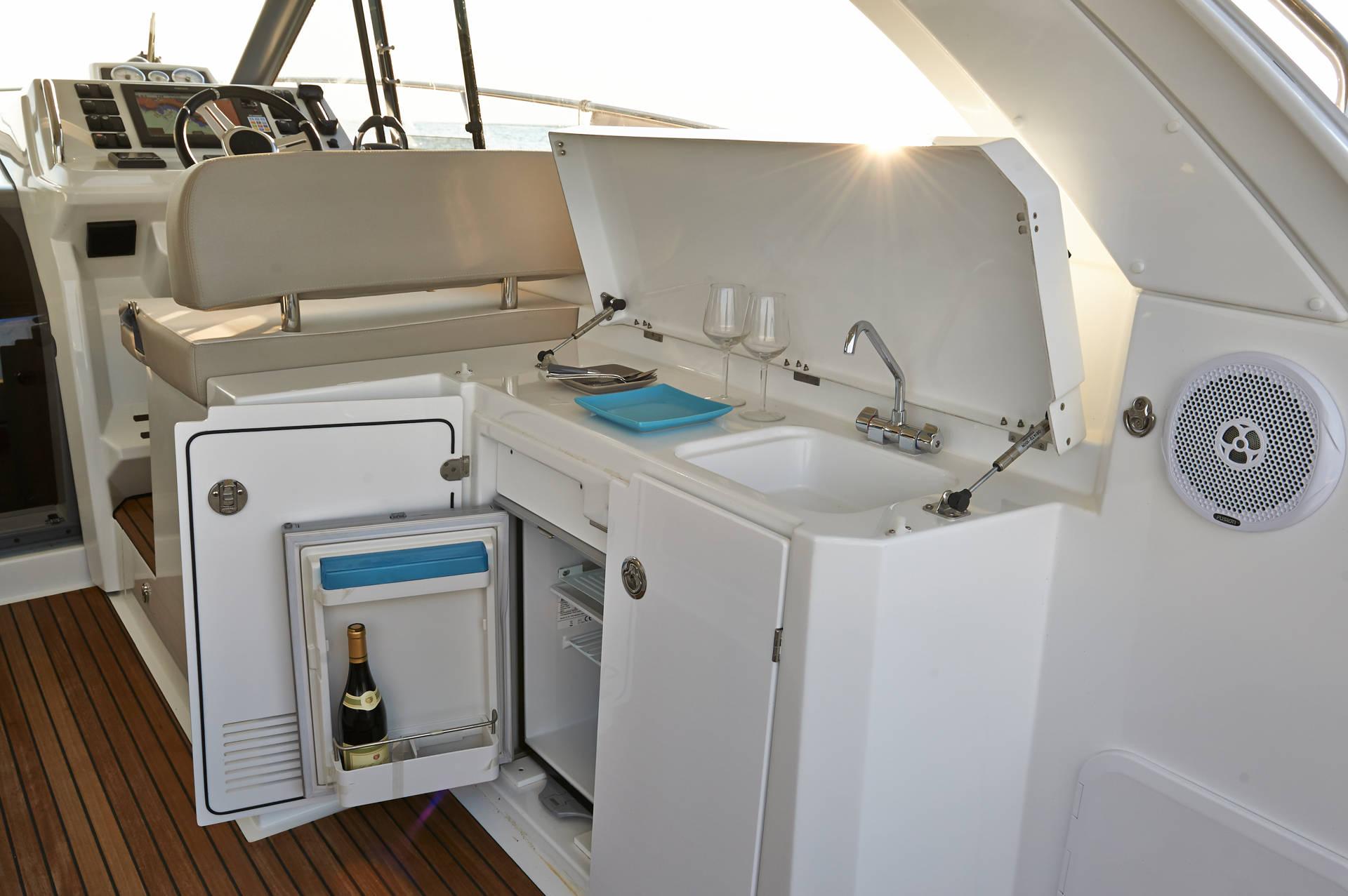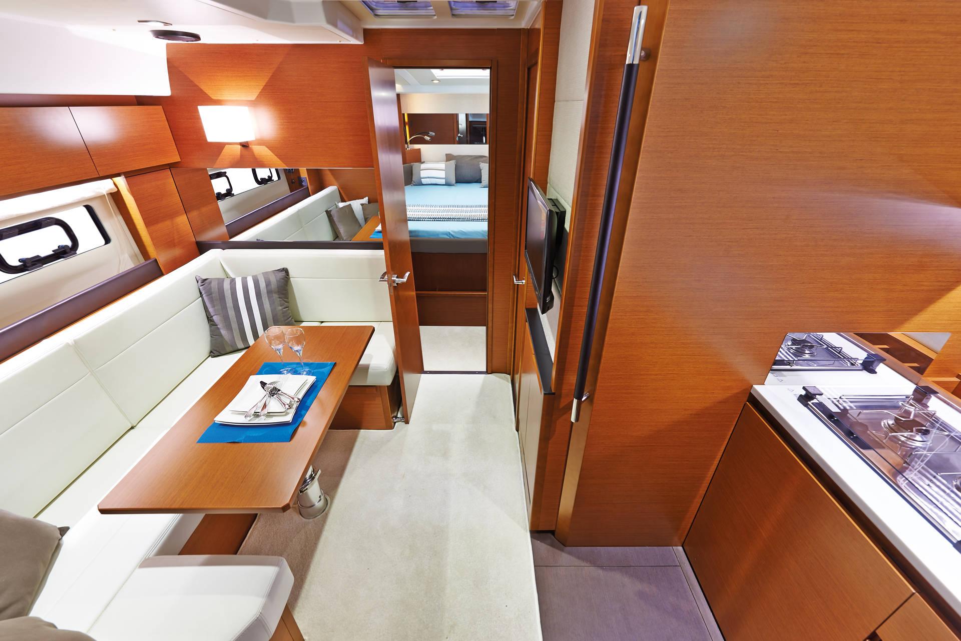 | Outside | 220 V-Landanschluss, Anker mit Kette, Badeleiter, Badeplattform, Cockpitdusche, Cockpitleuchte, Cockpitpolster, Cockpittisch, Deckpolster, elektr. Ankerwinsch, Teak im Cockpit |