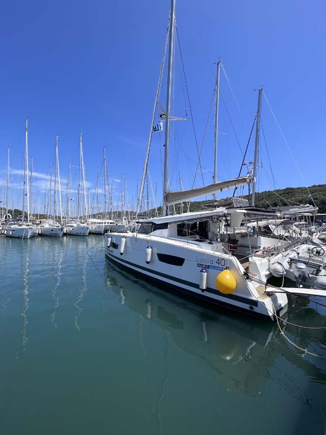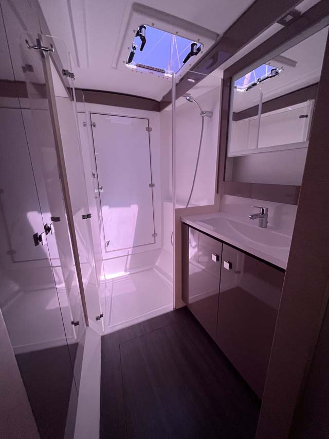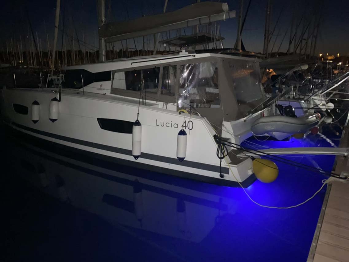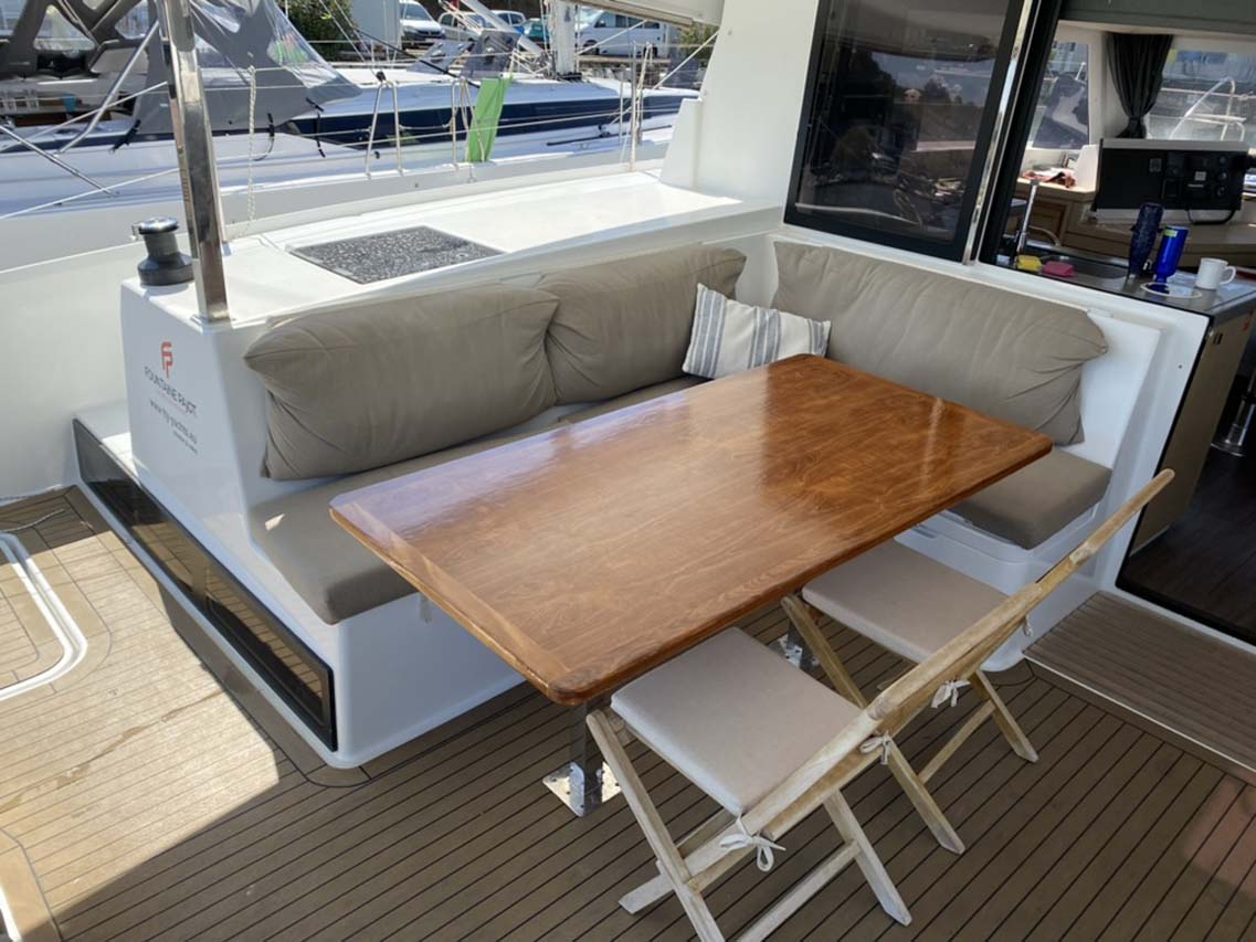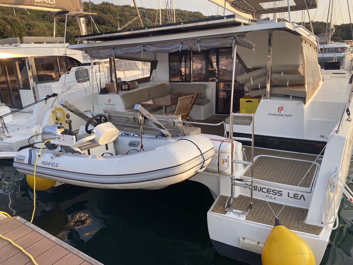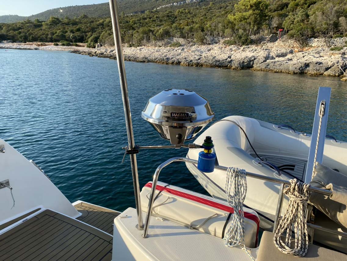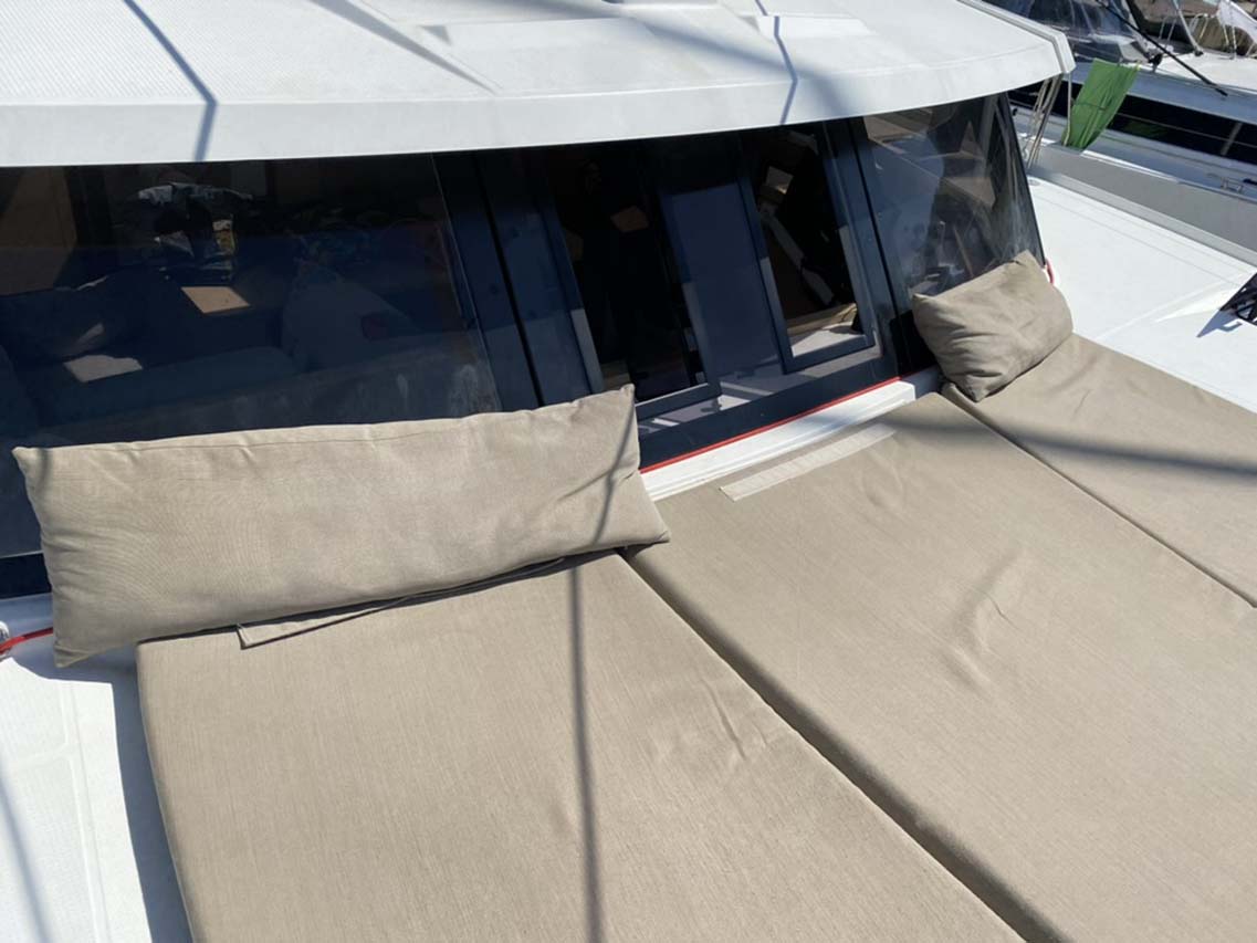 | Outside | 220 V-Landanschluss, Anker mit Kette, Biminitop, Cockpitdusche, Cockpitlautsprecher, Cockpitpolster, Cockpittisch, Cockpitverdeck, Davits, Deckpolster, elektr. Ankerwinsch, elektr. Winsch, Fender, Festmacherleinen, Gangway, Solaranlage, Teak im Cockpit, Unterwasserbeleuchtung |