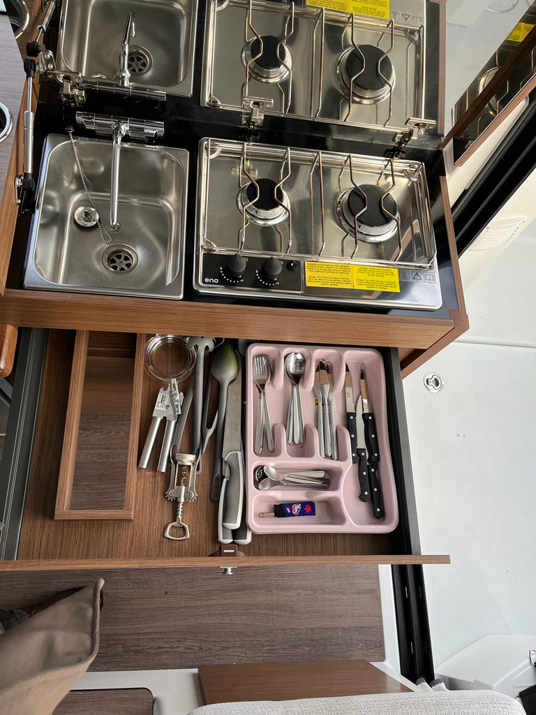 | Inside | Gasherd, Klimaanlage (Landstrom), Kühlschrank, Pantryausstattung, Radio mit CD, USB, Bluetooth, Warmwasser |