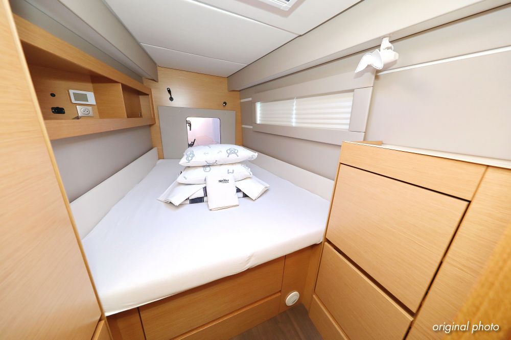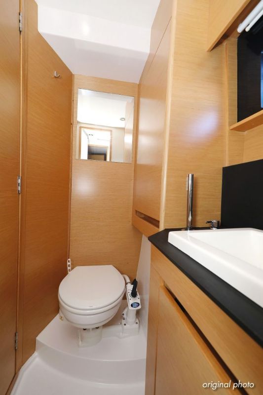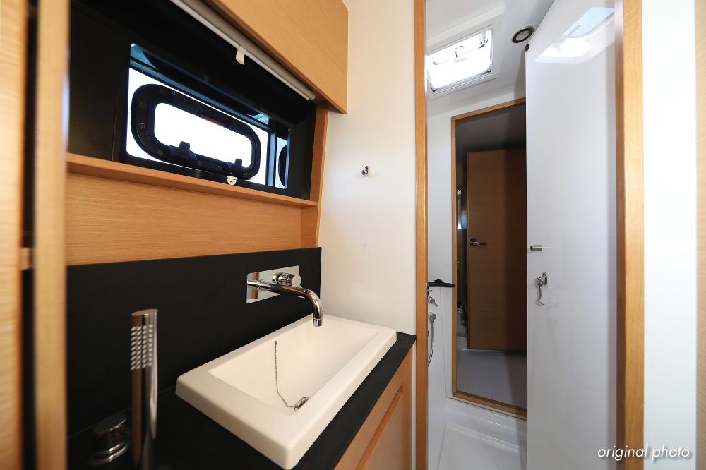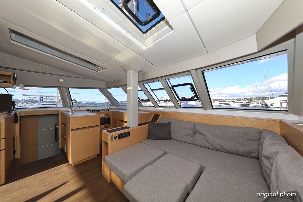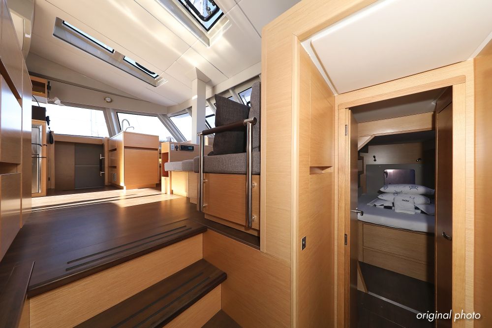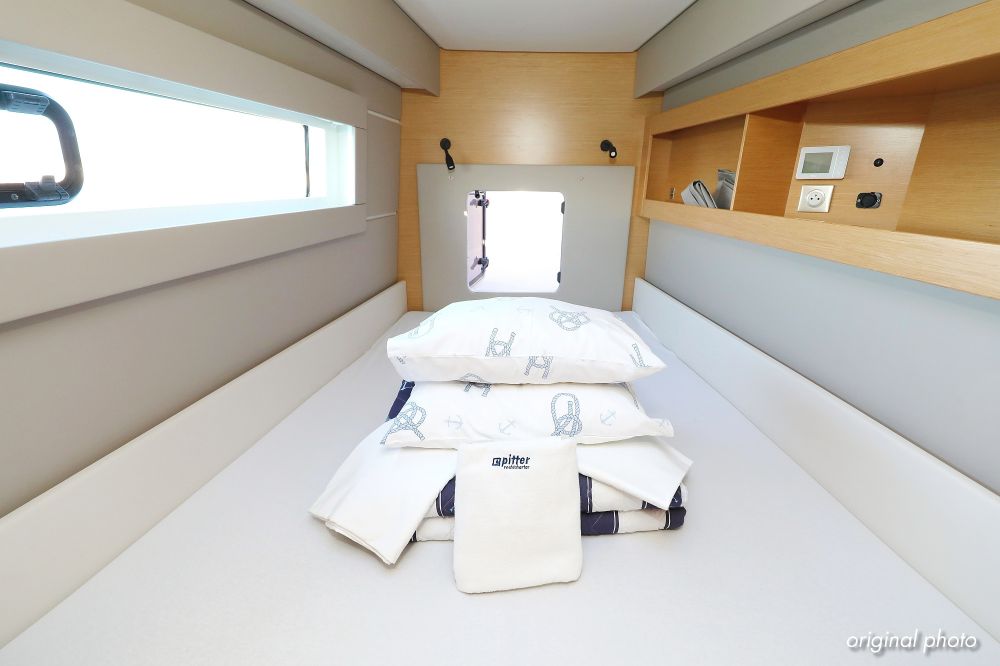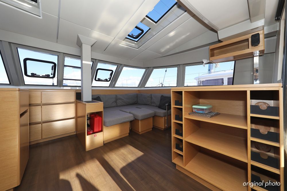 | Inside | Borduhr, Dusche, FUSION Sound System, Heizung, Inverter 12V/220V, Kühlschrank, Ladegerät, Luftpumpe für Beiboot, Pantryausstattung, Radio mit CD, MP3, USB und Bluetooth, USB Steckdose, Ventilatoren in Salon und Kabinen, Warmwasser |