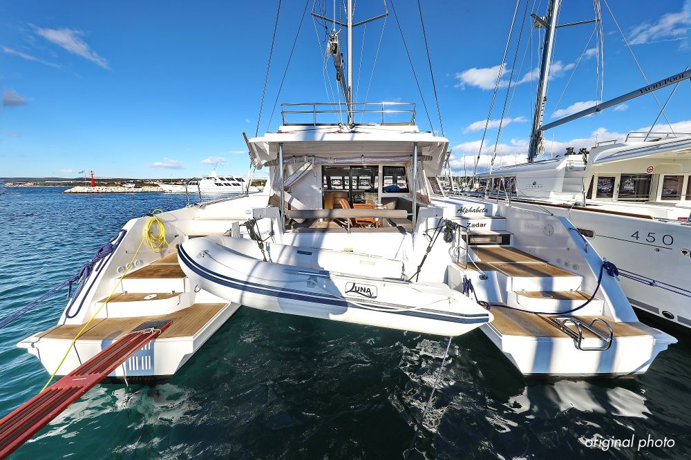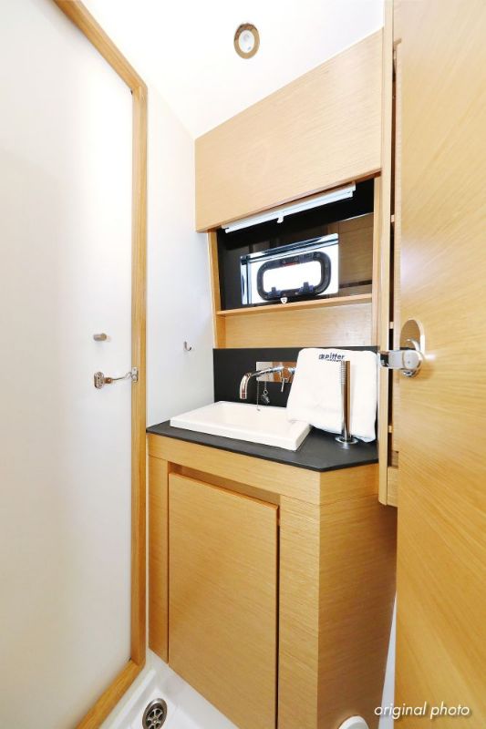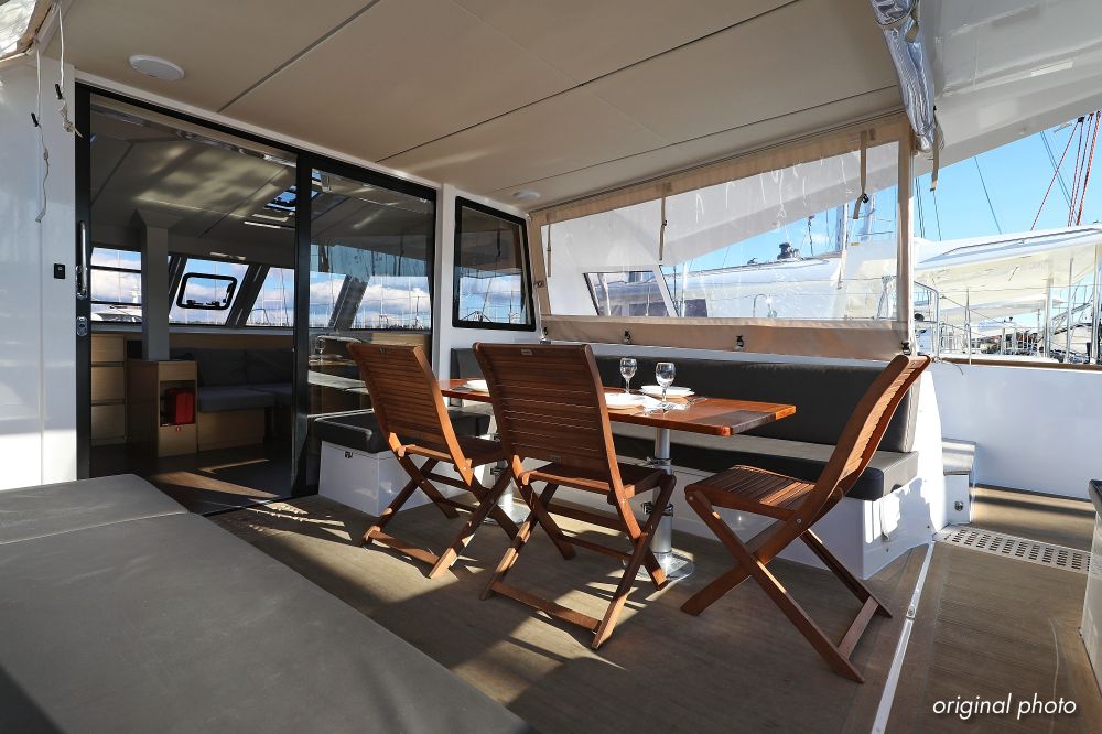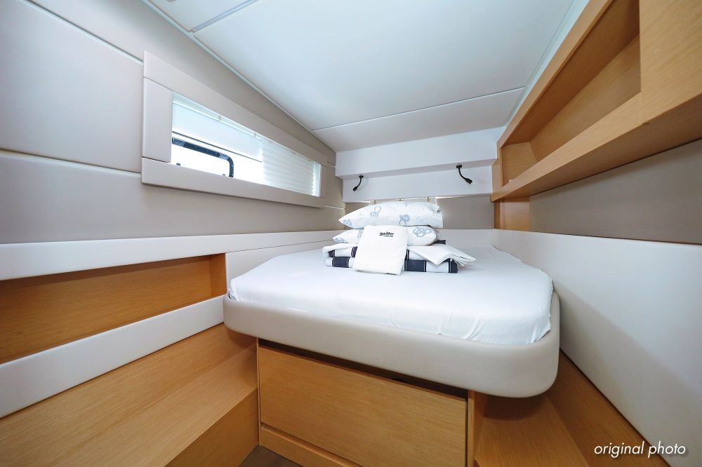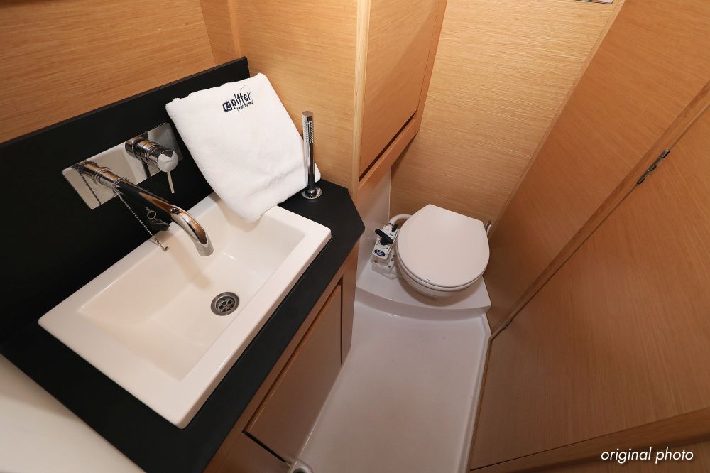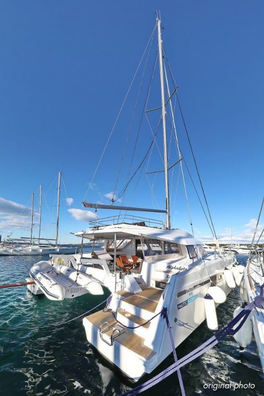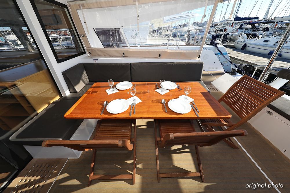 | Inside | Borduhr, Dusche, FUSION Sound System, Heizung, Inverter 12V/220V, Kühlschrank, Ladegerät, Luftpumpe für Beiboot, Pantryausstattung, Radio mit CD, MP3, USB und Bluetooth, USB Steckdose, Ventilatoren in Salon und Kabinen, Warmwasser |