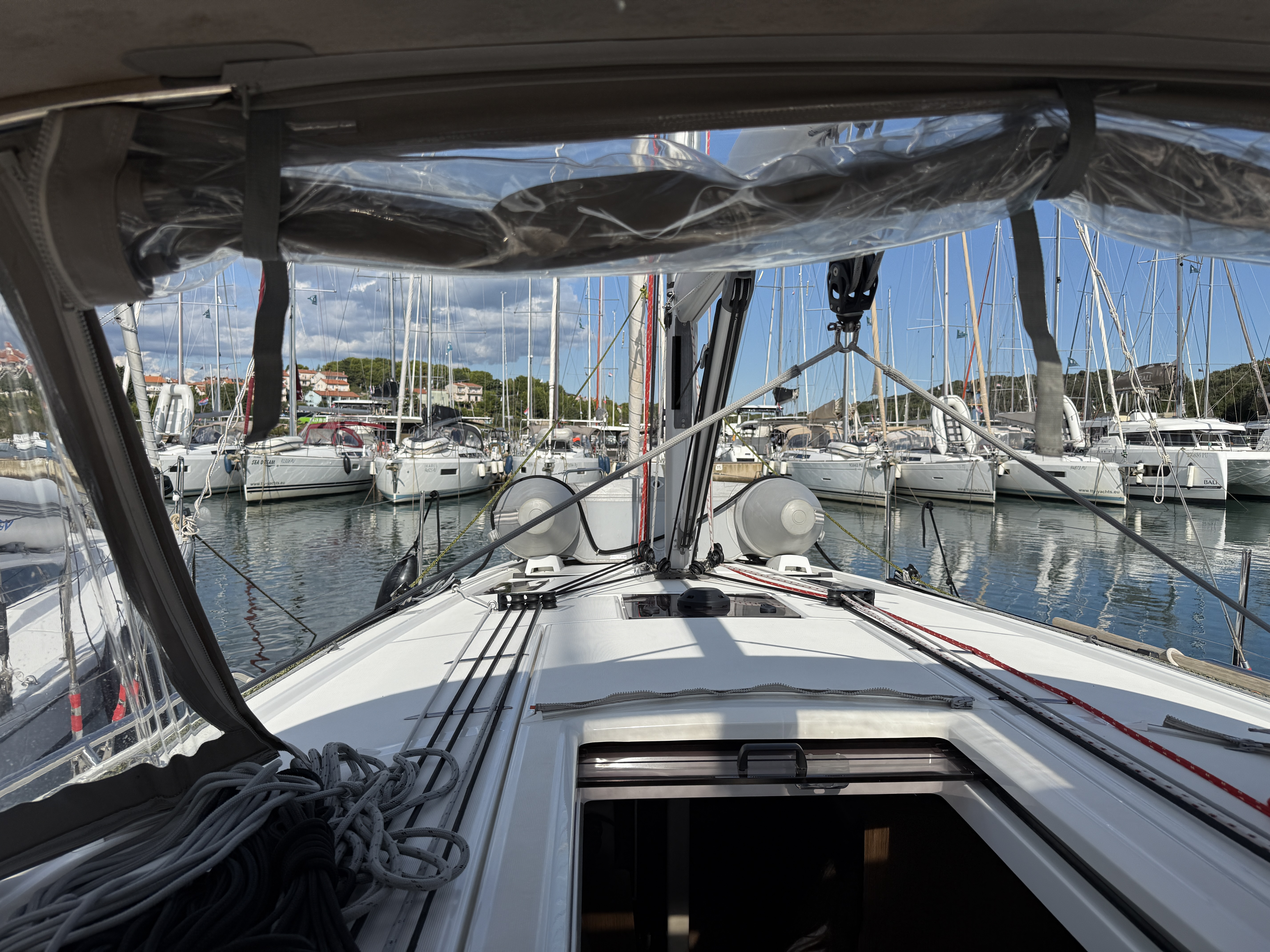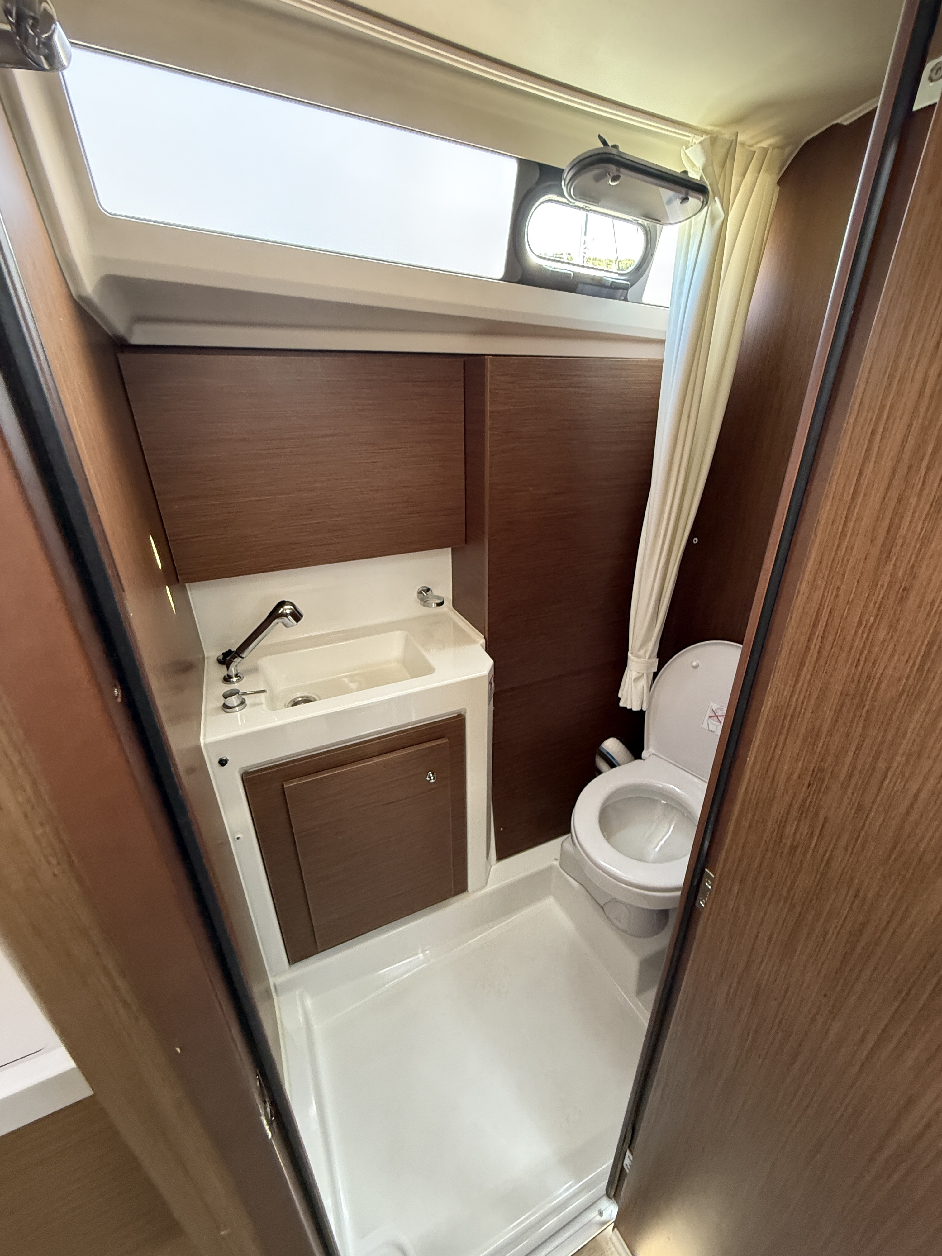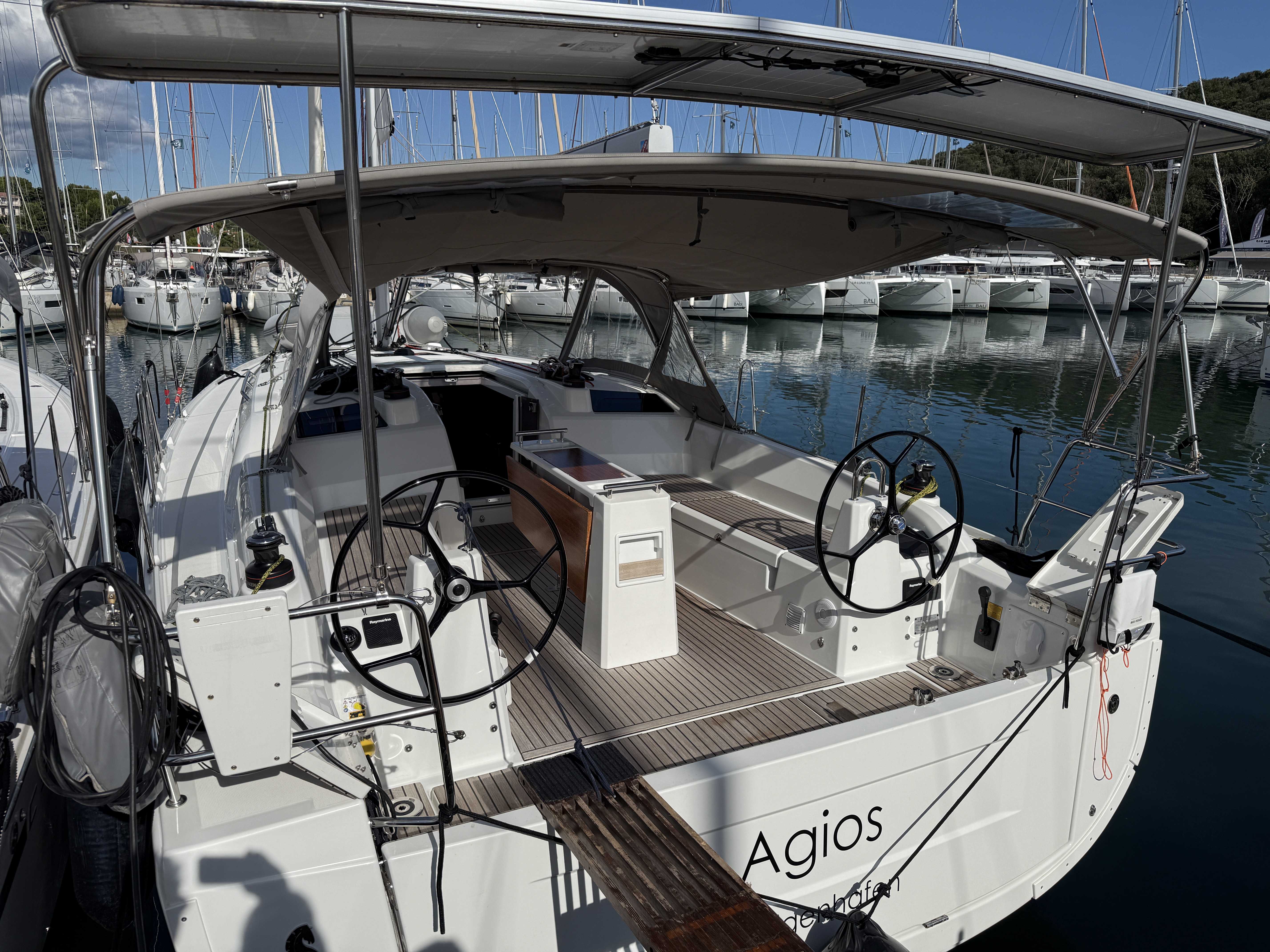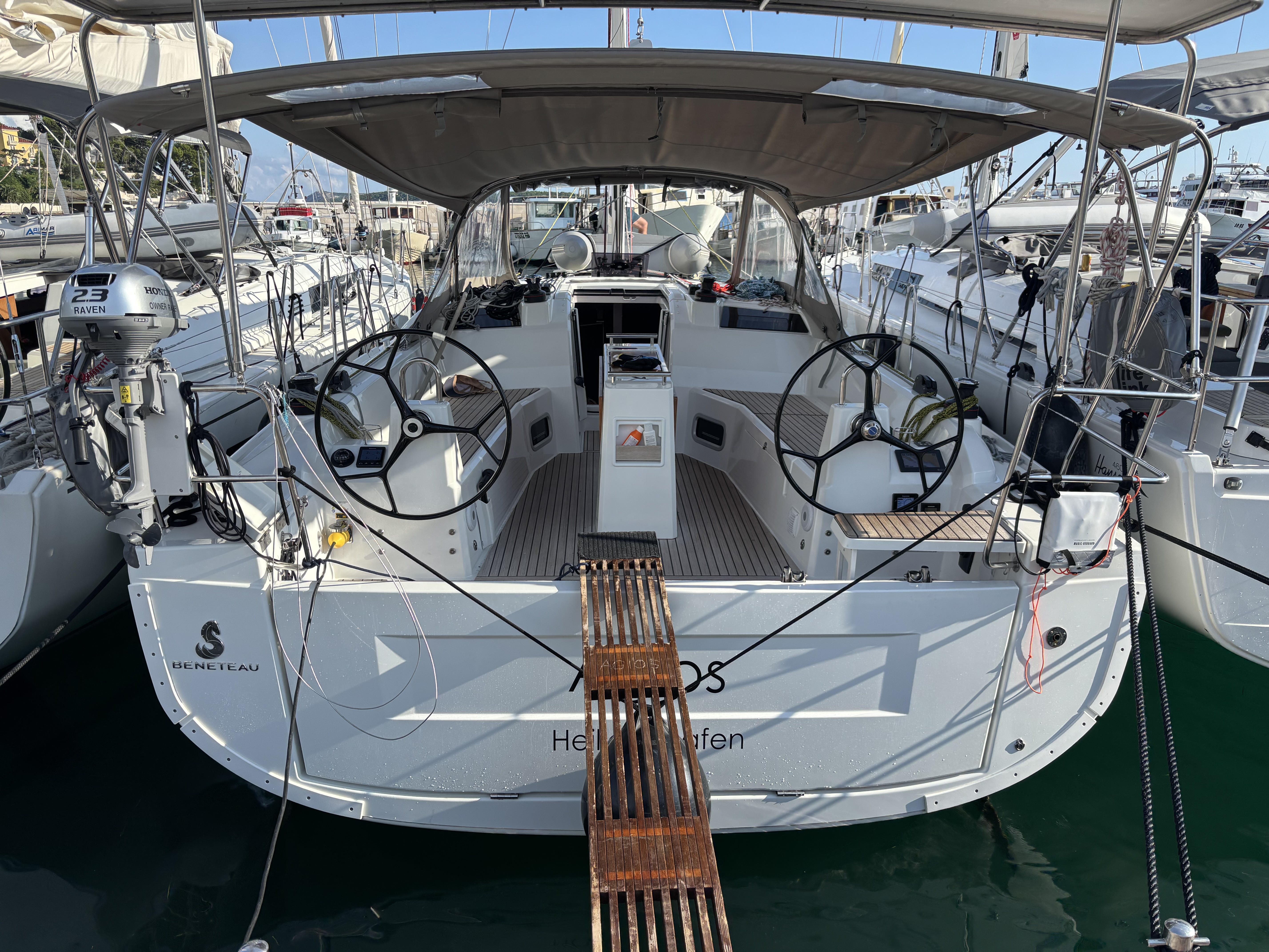 | Outside | 12 V-Anschluss, 220 V-Landanschluss, Anker mit Kette, Badeleiter, Badeplattform, Biminitop, Bootshaken, Cockpitdusche, Cockpitlautsprecher, Cockpitpolster, Cockpittisch, Dieselkanister , elektr. Ankerwinsch, Fallwinschen, Fender, Festmacherleinen, Gangway, Lifeline System, Pantry im Cockpit, Solaranlage, Sprayhood, Teak auf Badeplattform, Teak im Cockpit, Wantenschneider, Windex, Winschen |